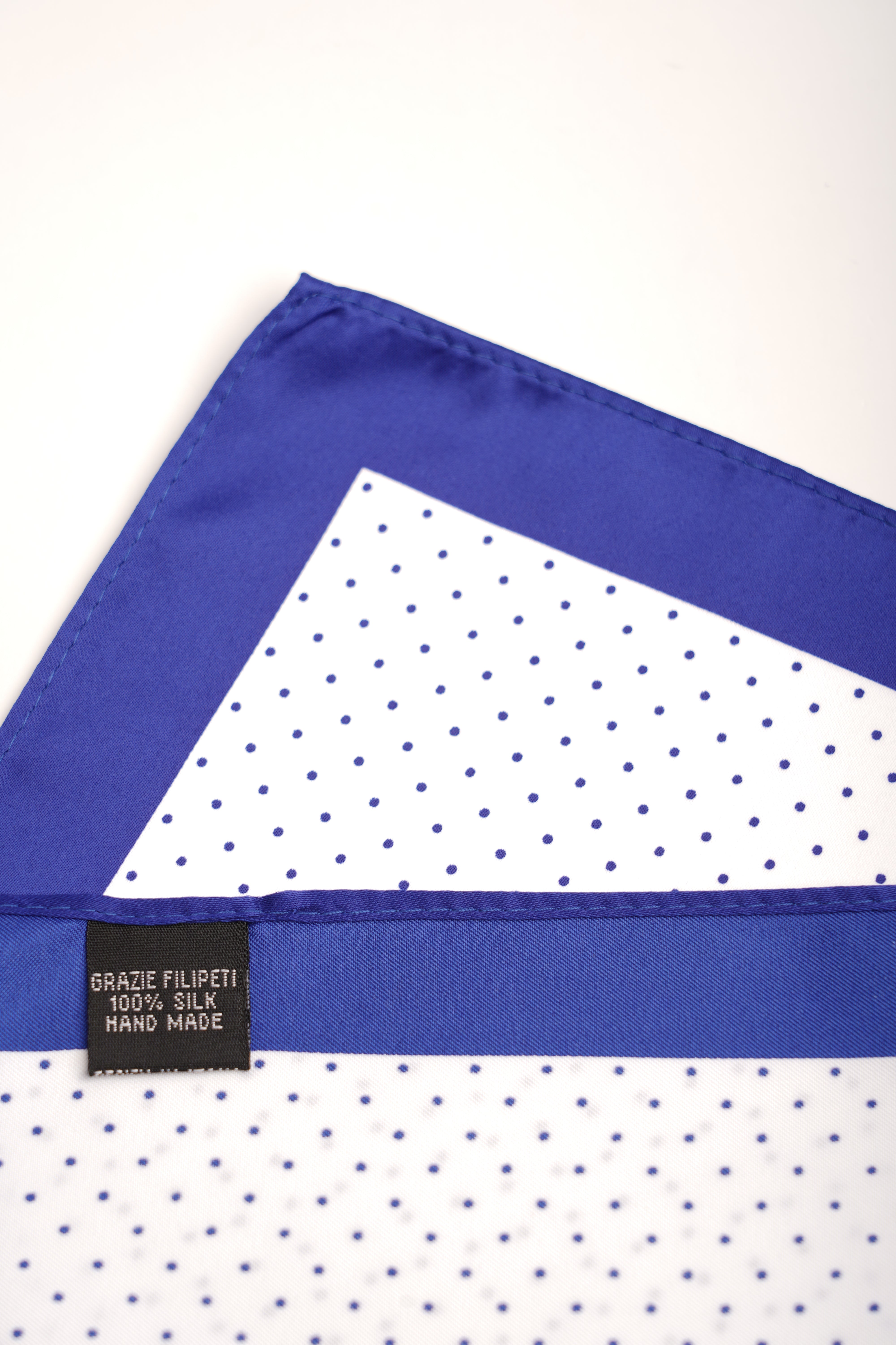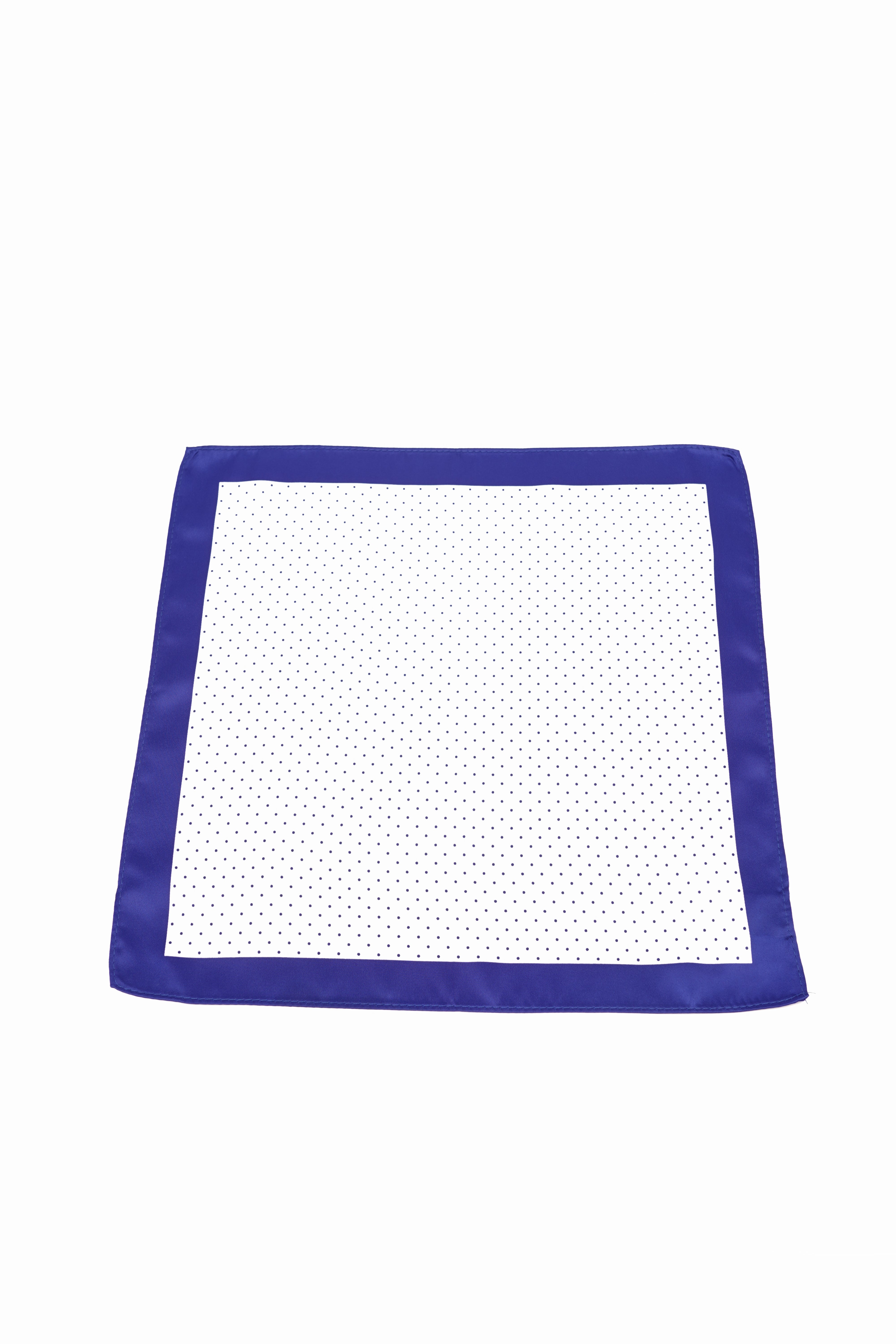 Această batistă de buzunar are un fundal alb presărat cu buline negre fine, înrămată de o margine albastru intens. Este alegerea ideală pentru un look rafinat, dar cu personalitate, potrivită atât la evenimente formale, cât și la ținute smart-casual.