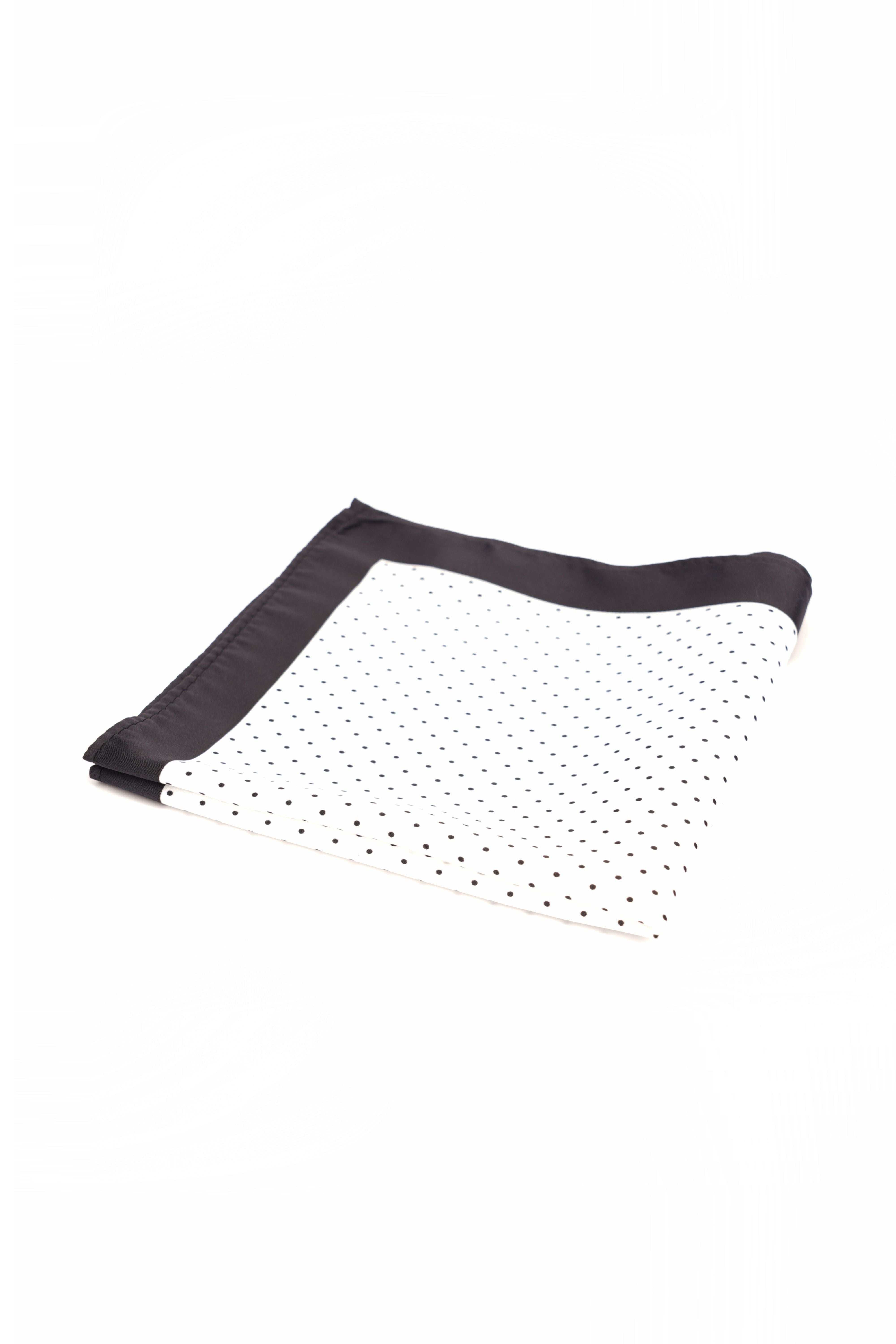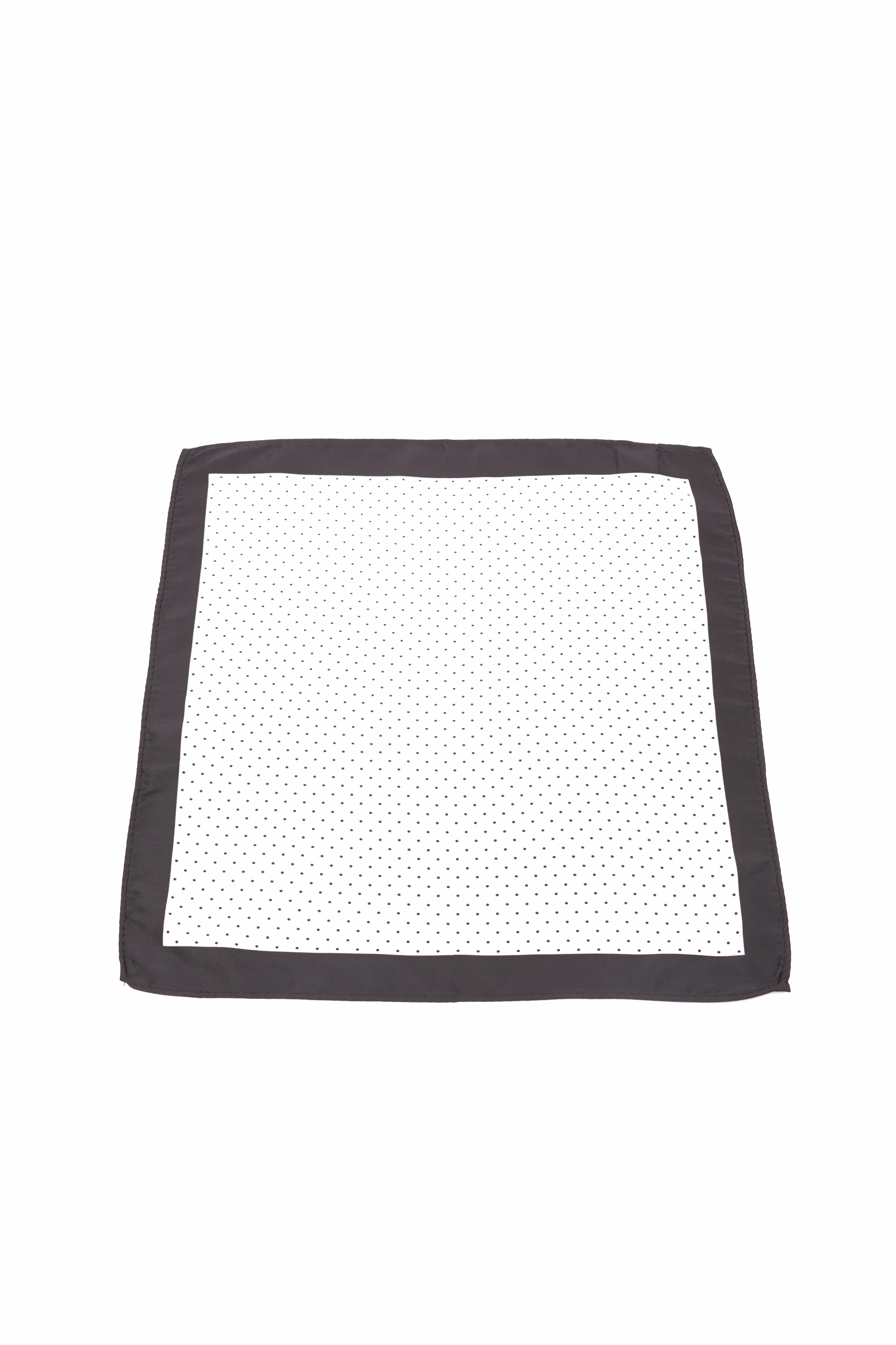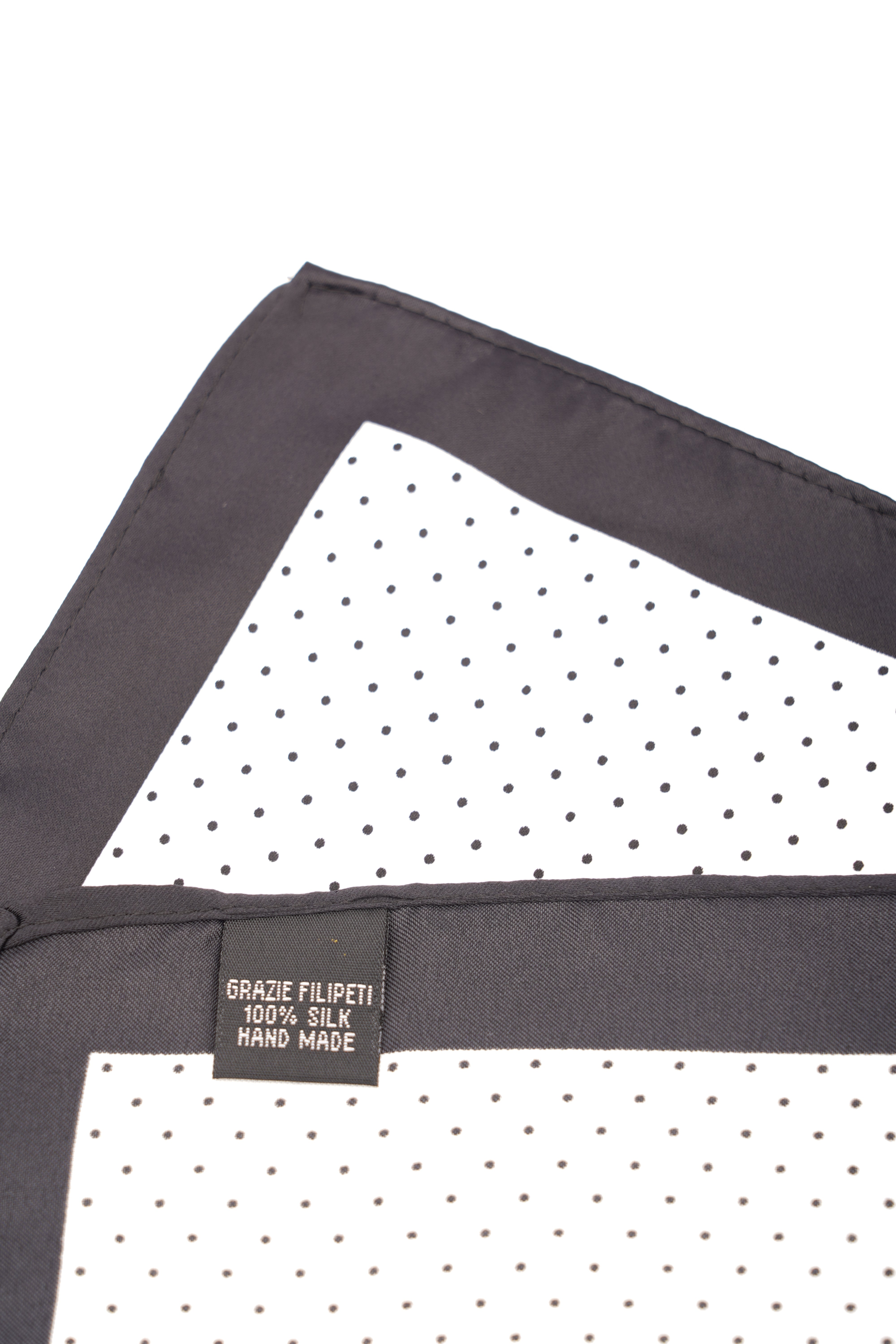 Această batistă de buzunar, cu fundal alb, buline negre fine și margine gri închis, adaugă un contrast subtil dar sofisticat. Se potrivește excelent atât la costume negre sau gri, cât și la ținute moderne, aducând echilibru și eleganță minimalistă.
