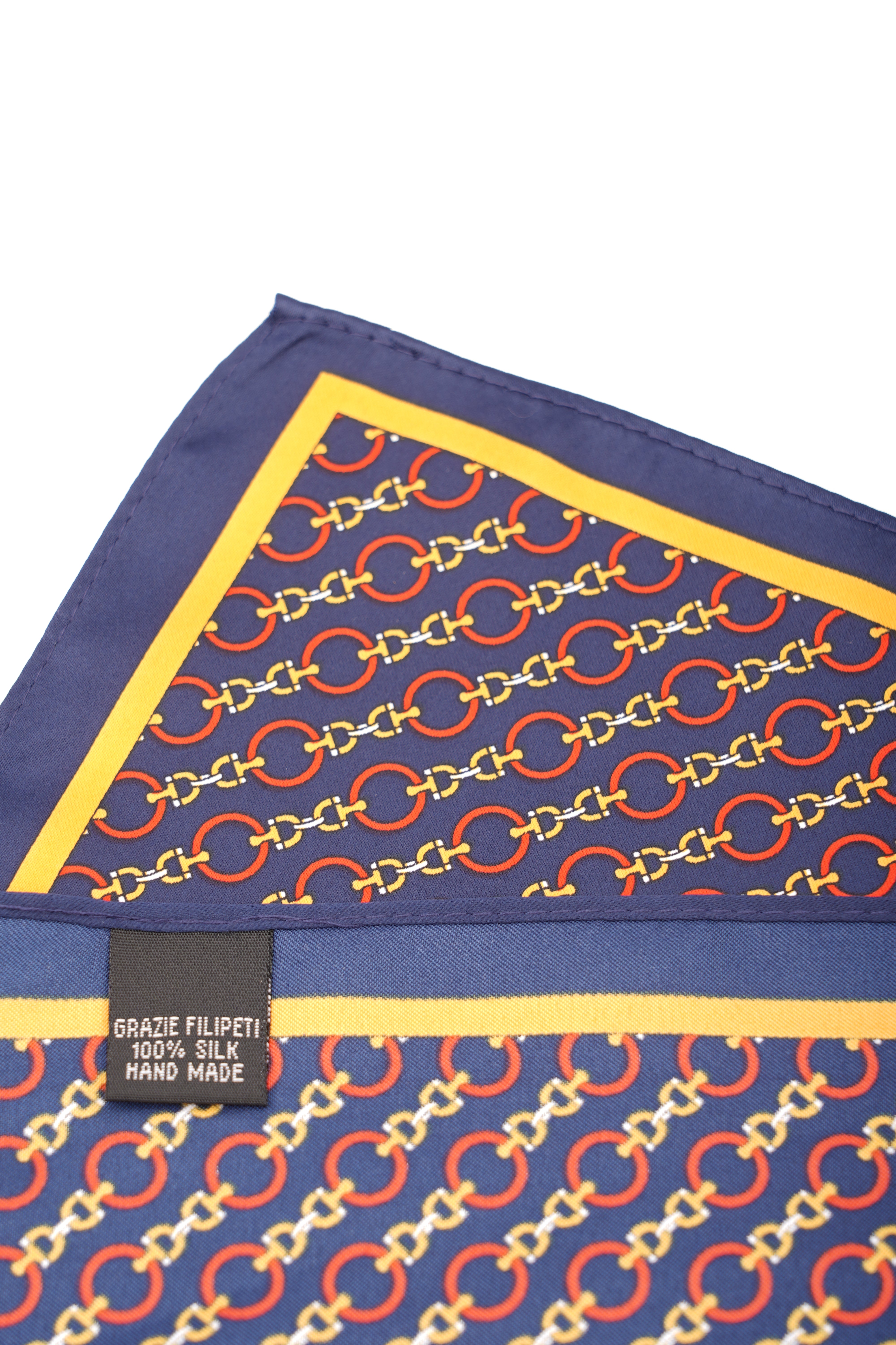 Batistă de buzunar albastru închis cu imprimeu lanțuri roșii și margine galben-aurie
