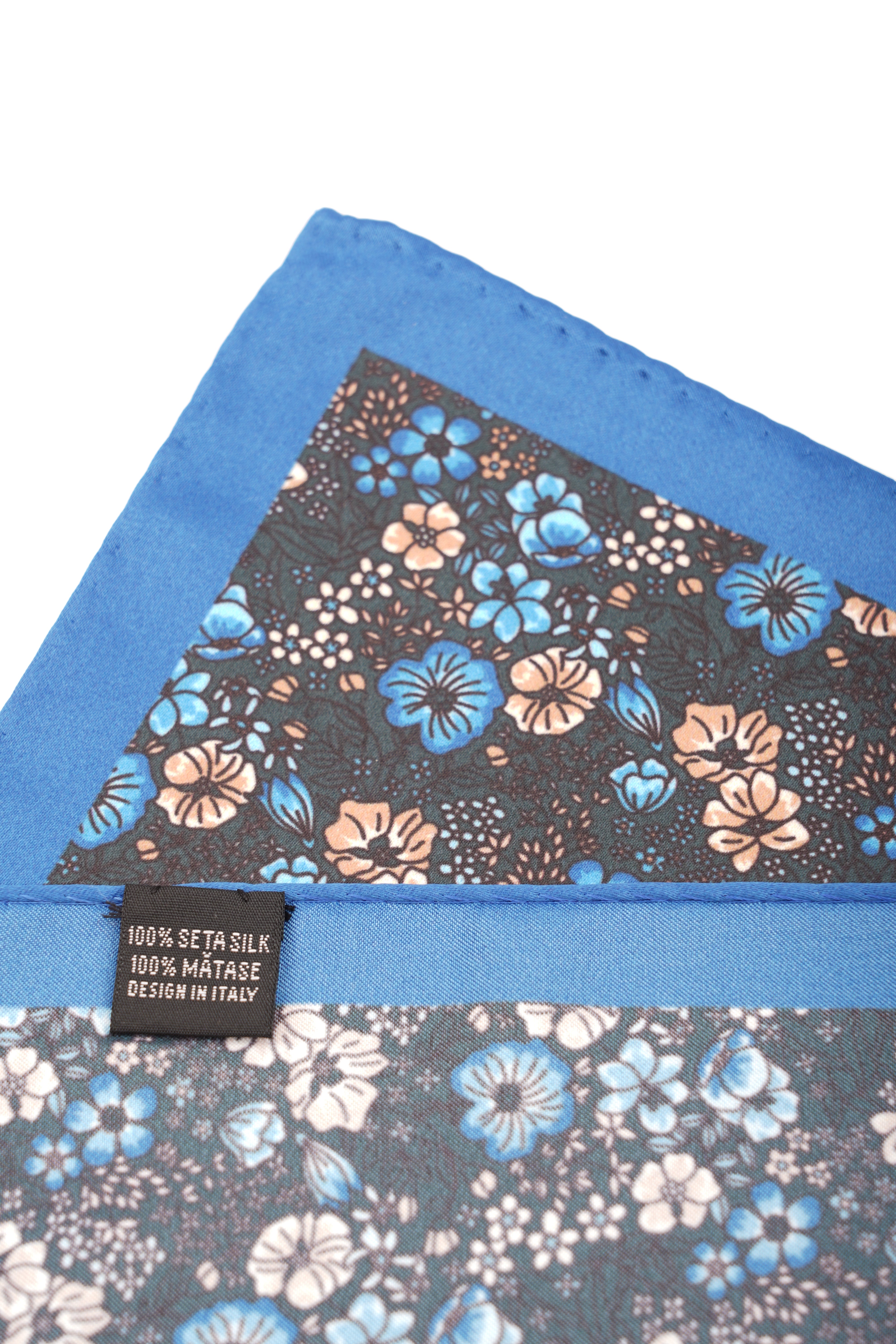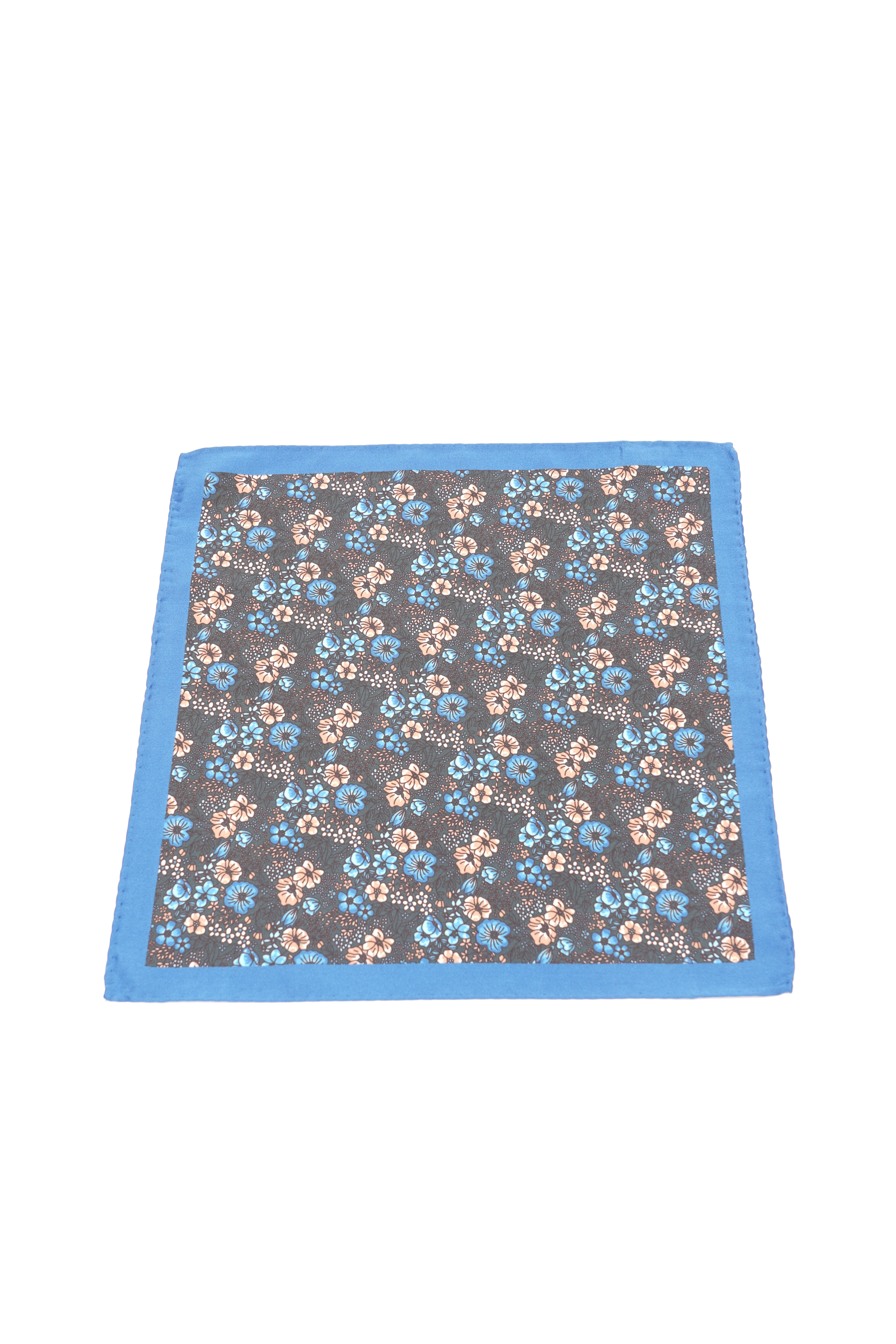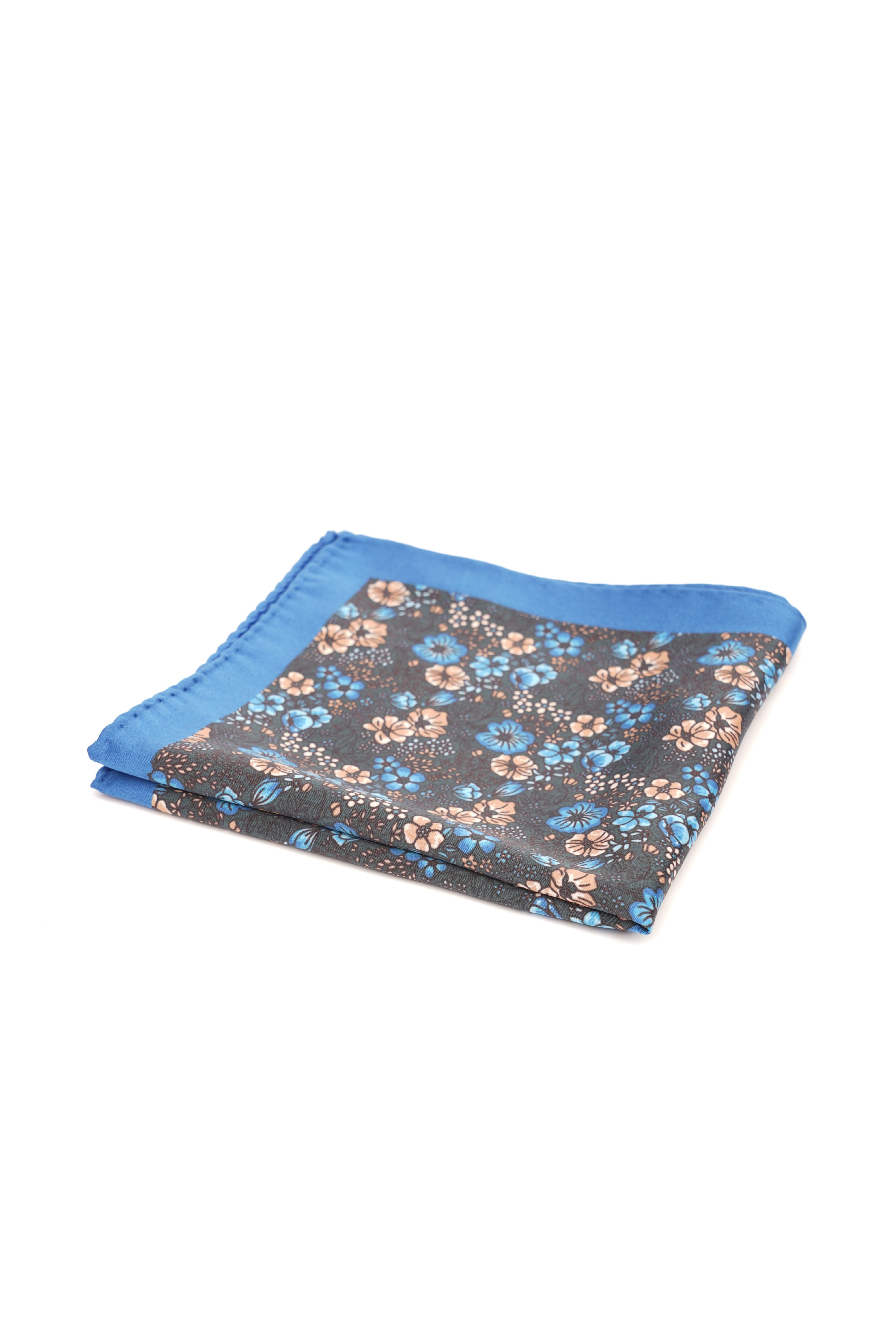 Batistă de buzunar din mătase naturală, cu fundal gri închis și imprimeu floral în nuanțe de albastru și bej, completată de marginea albastră intensă. Fabricată în Italia, este un accesoriu rafinat ce adaugă un accent elegant și versatil oricărui sacou.