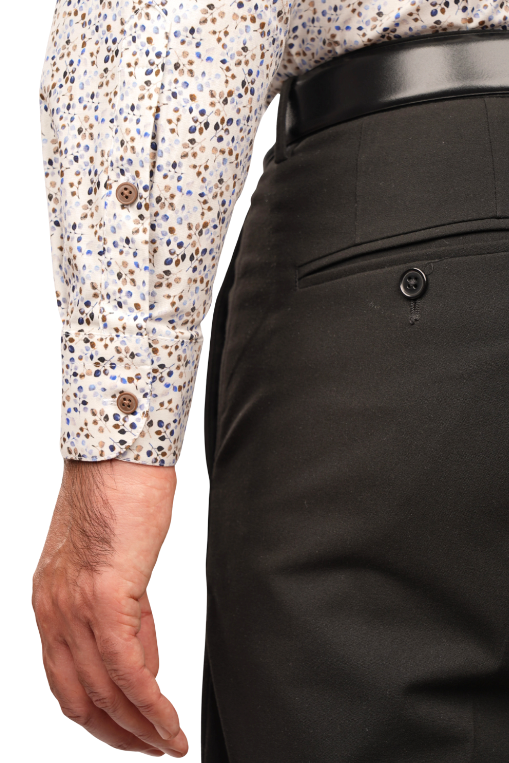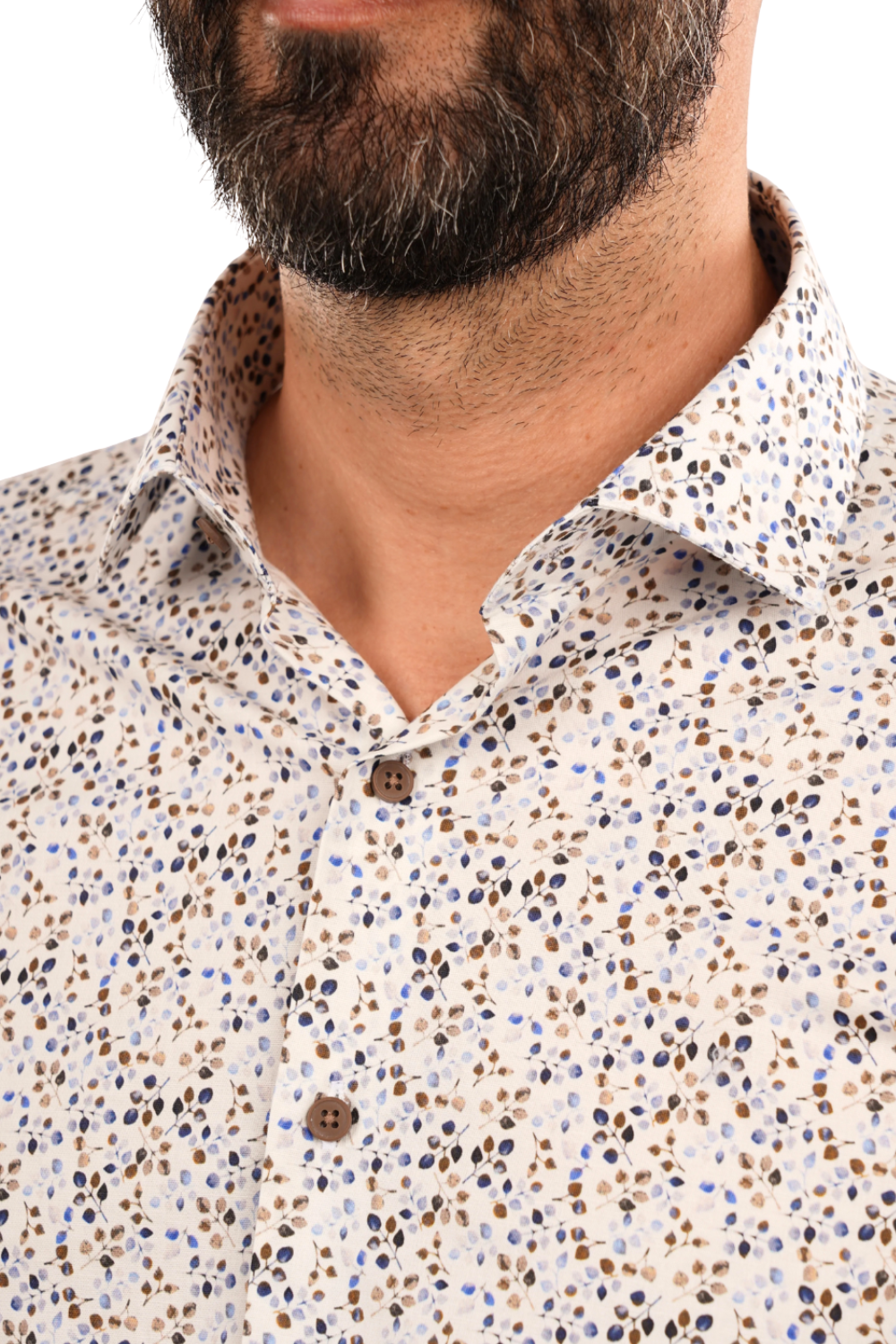 O cămașă elegantă pentru bărbați, definită de un imprimeu discret cu frunze în tonuri neutre și accente de albastru. Designul modern și combinația de culori oferă o prezență rafinată, potrivită atât pentru ținute business, cât și pentru apariții smart-casual. Gulerul clasic și aspectul curat o fac o piesă versatilă și ușor de integrat în garderobă.