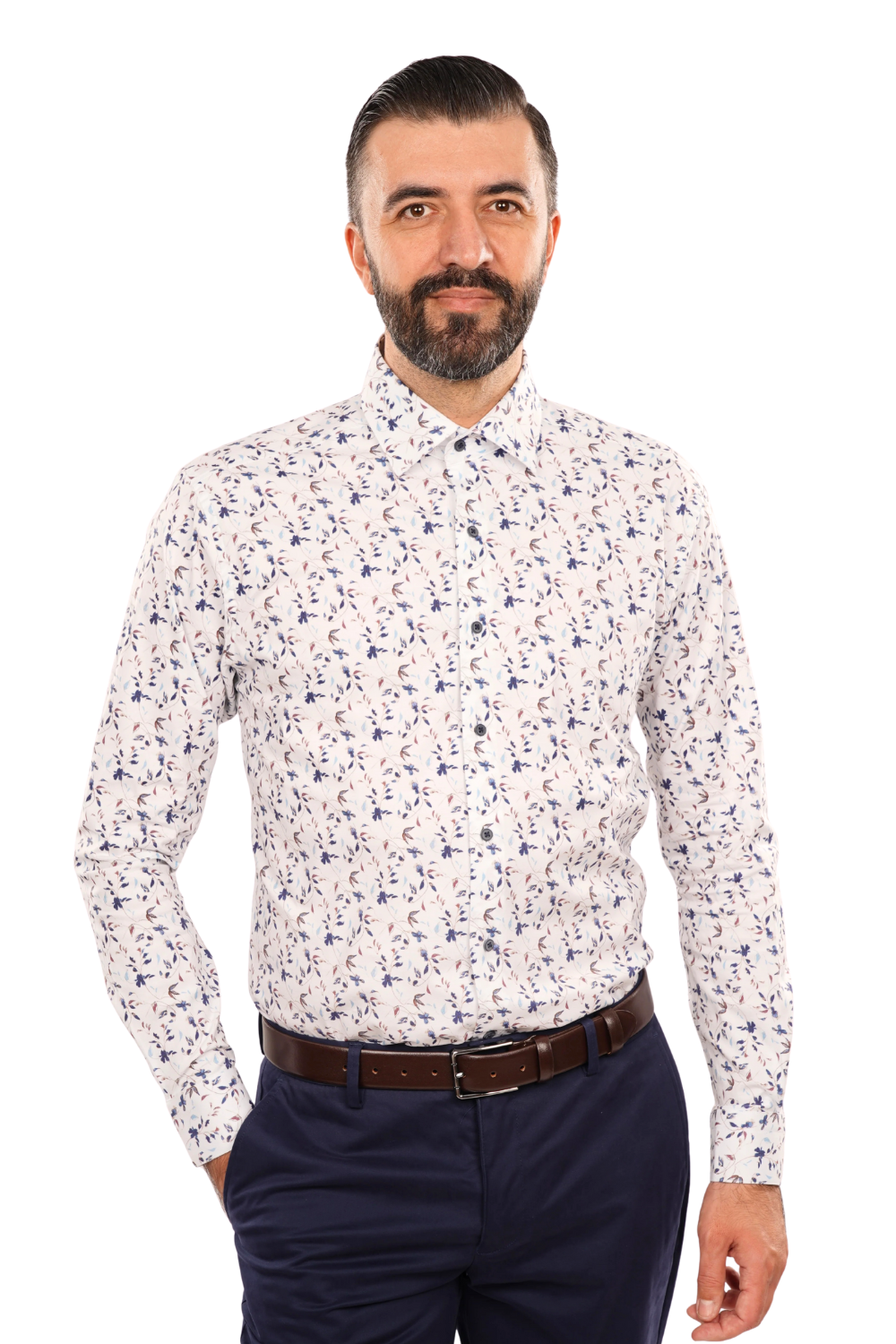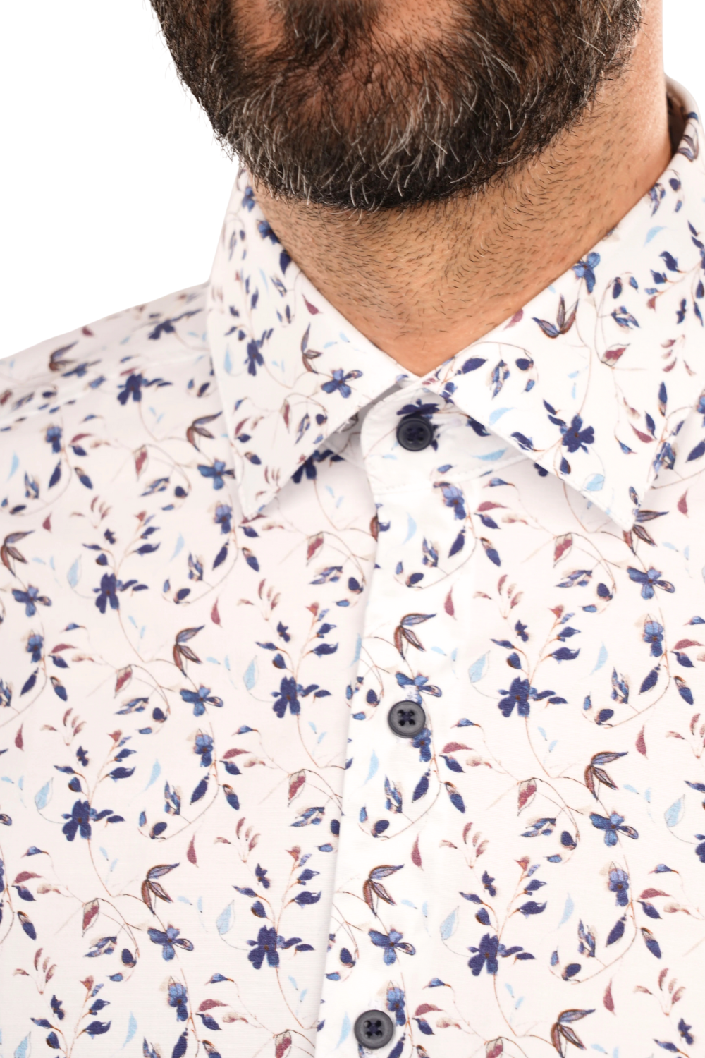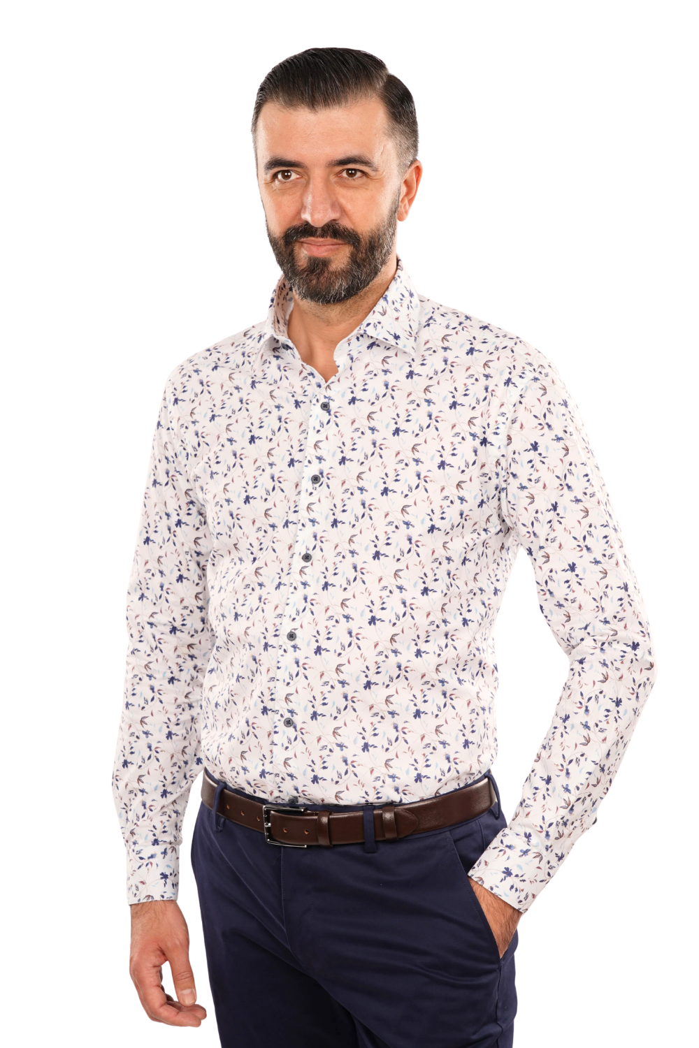 O cămașă elegantă pentru bărbați, definită de un imprimeu rafinat cu frunze și detalii florale în tonuri de albastru și maro, așezate pe o bază albă curată. Designul modern și echilibrul cromatic oferă o apariție premium, potrivită atât pentru ținute business, cât și pentru look-uri smart-casual.