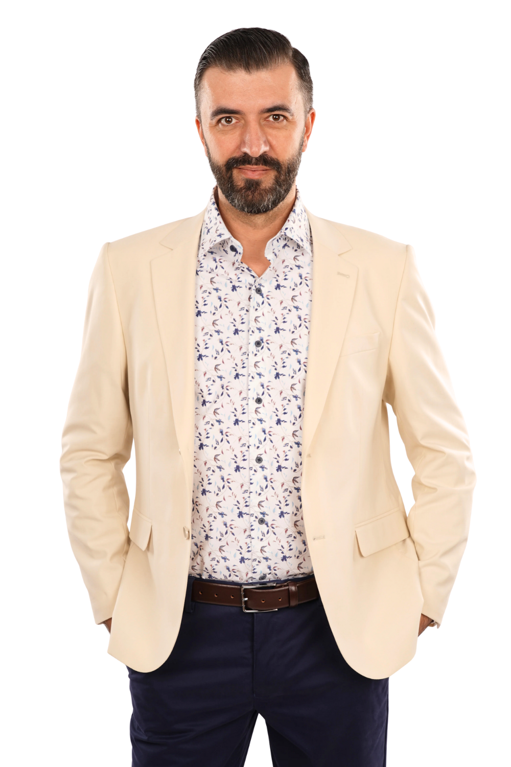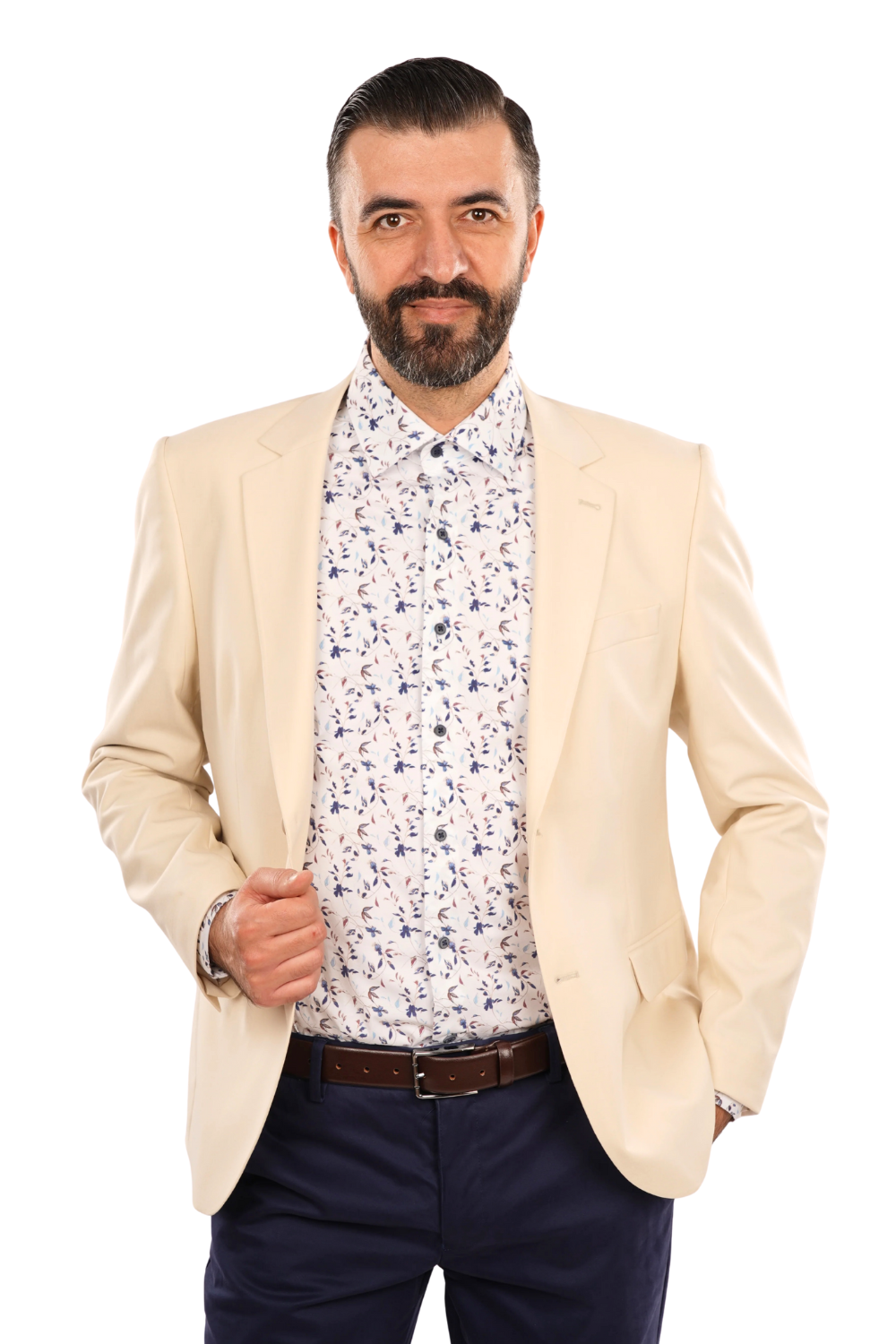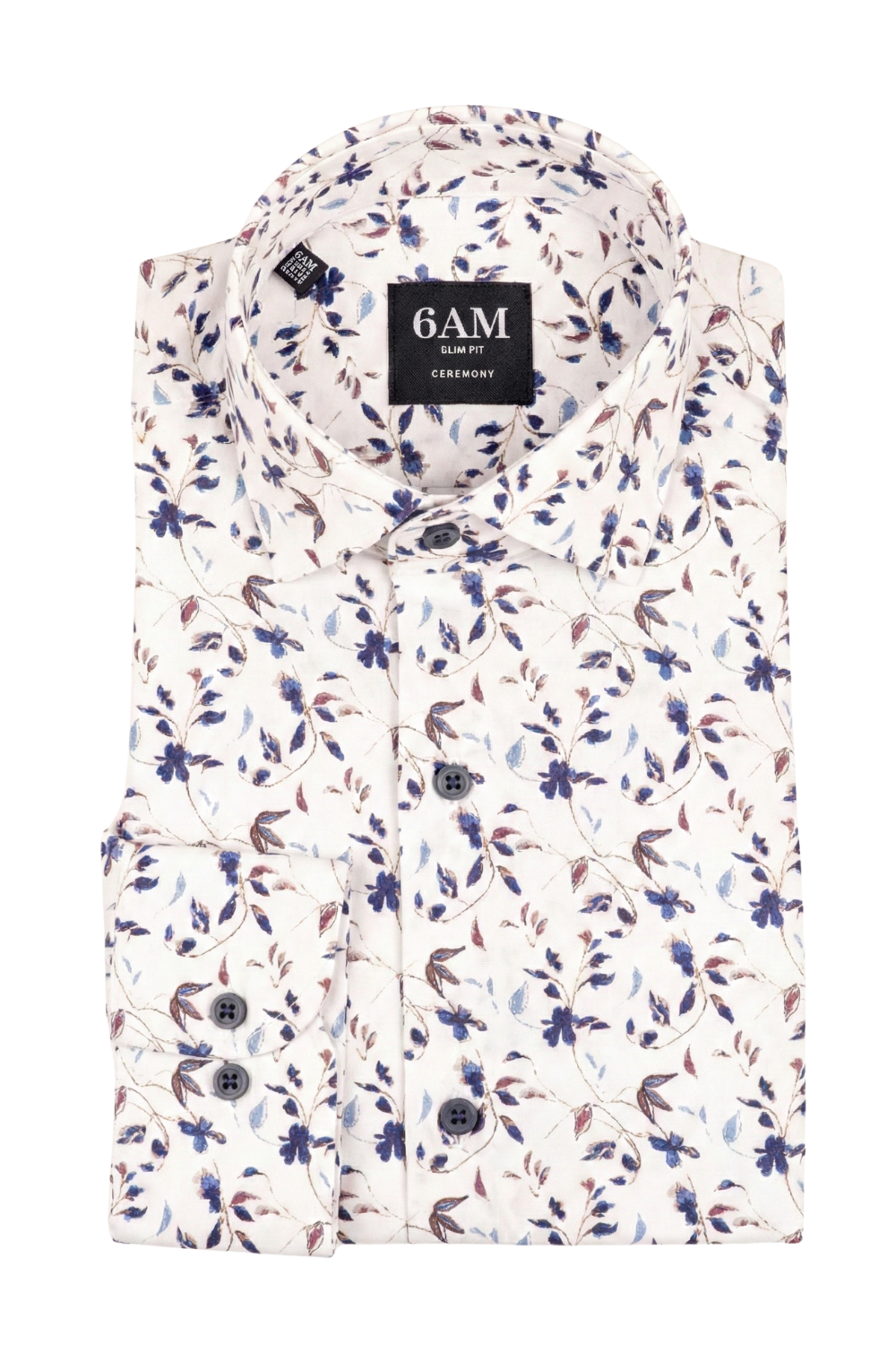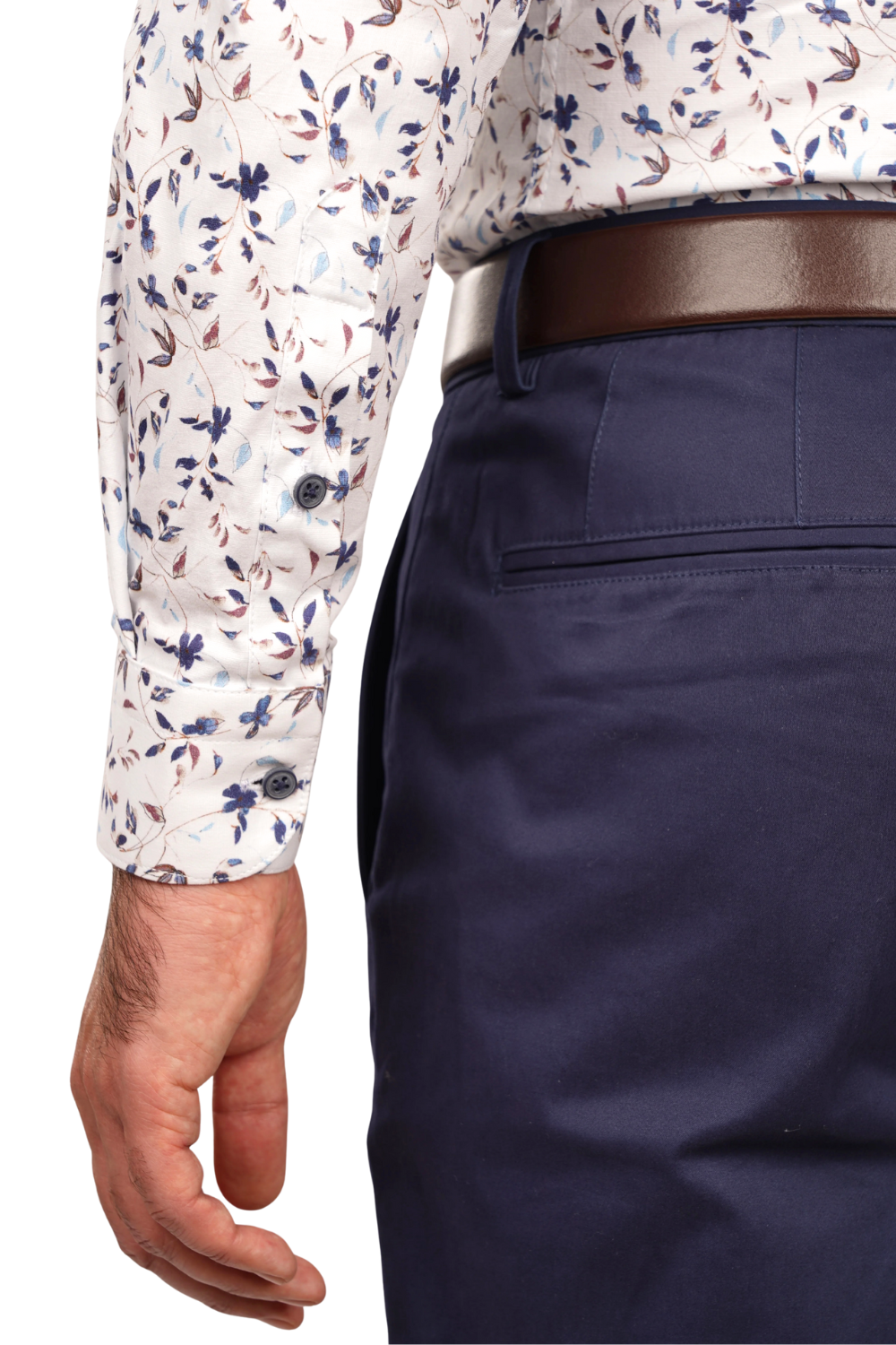 O cămașă elegantă pentru bărbați, definită de un imprimeu rafinat cu frunze și detalii florale în tonuri de albastru și maro, așezate pe o bază albă curată. Designul modern și echilibrul cromatic oferă o apariție premium, potrivită atât pentru ținute business, cât și pentru look-uri smart-casual.