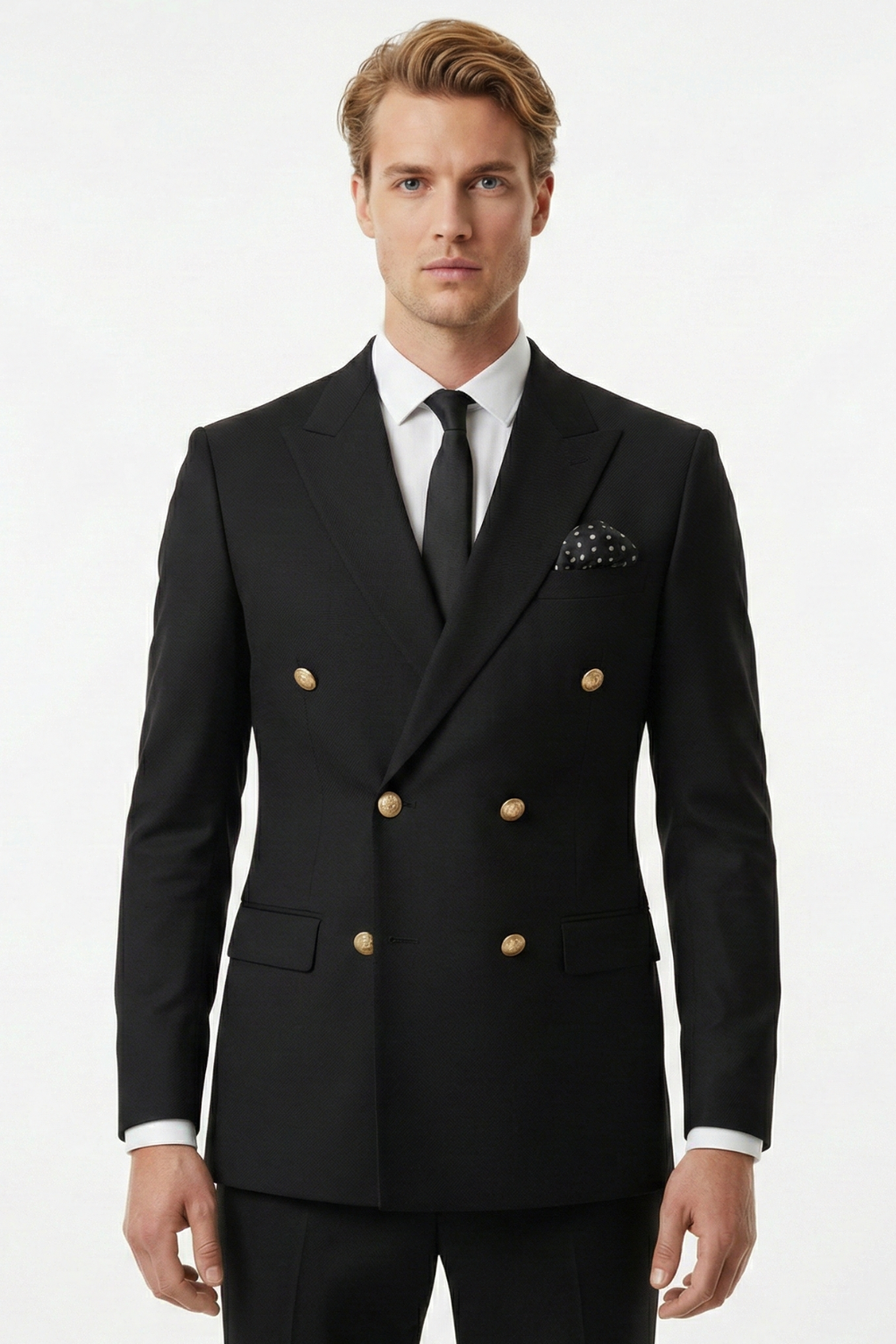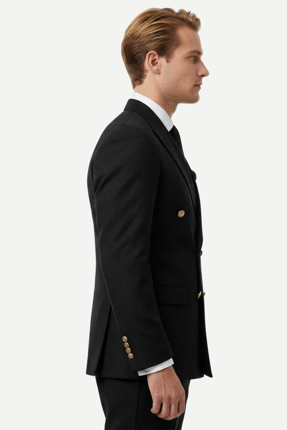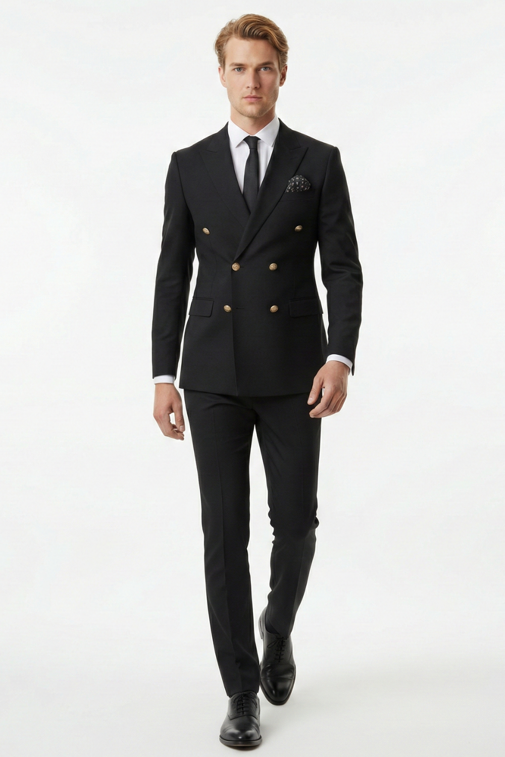 Costum elegant pentru bărbați, în nuanță neagră texturată, compus din sacou la două rânduri de nasturi metalici aurii și pantaloni asortați. Designul clasic conferă o prezență rafinată și echilibrată.