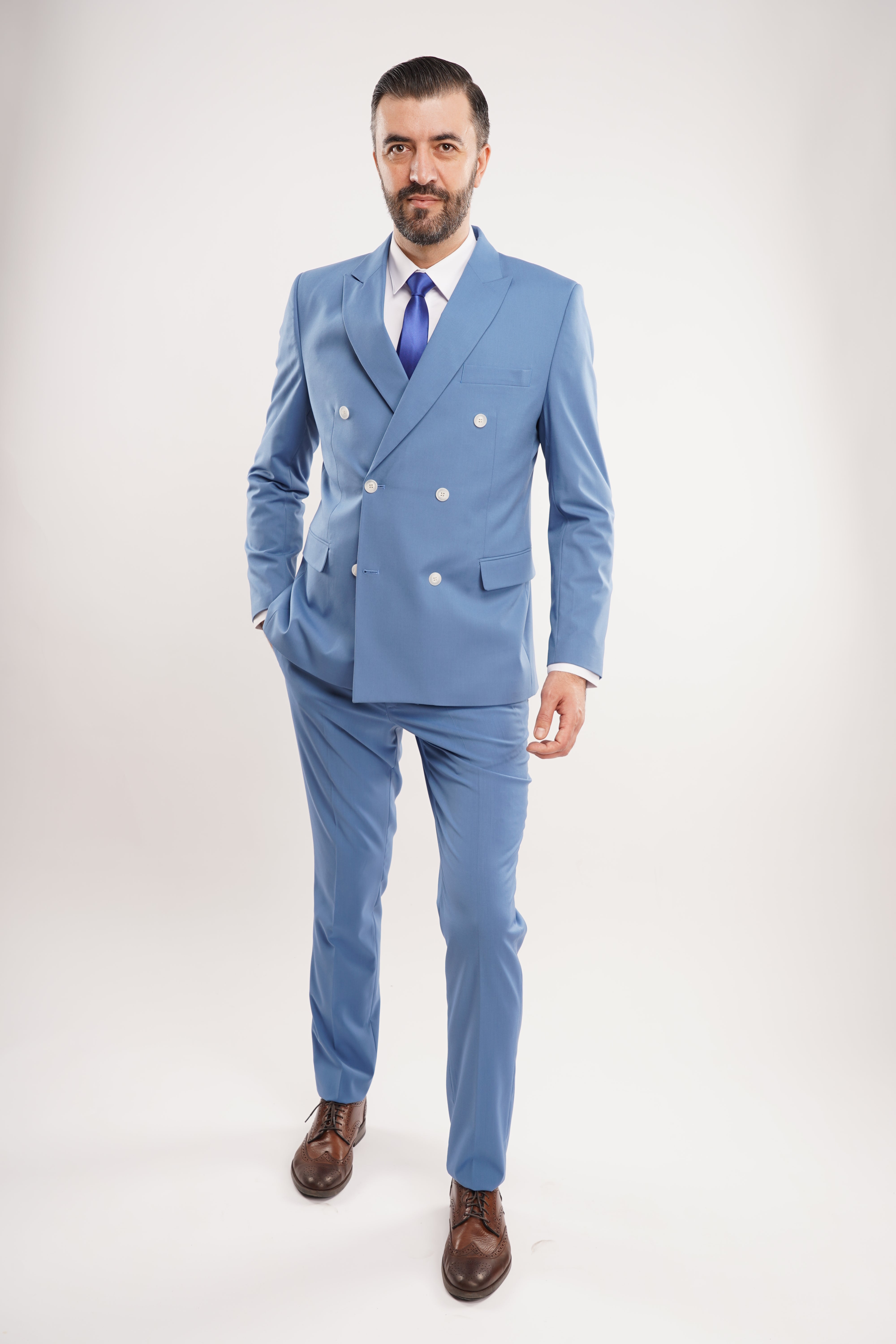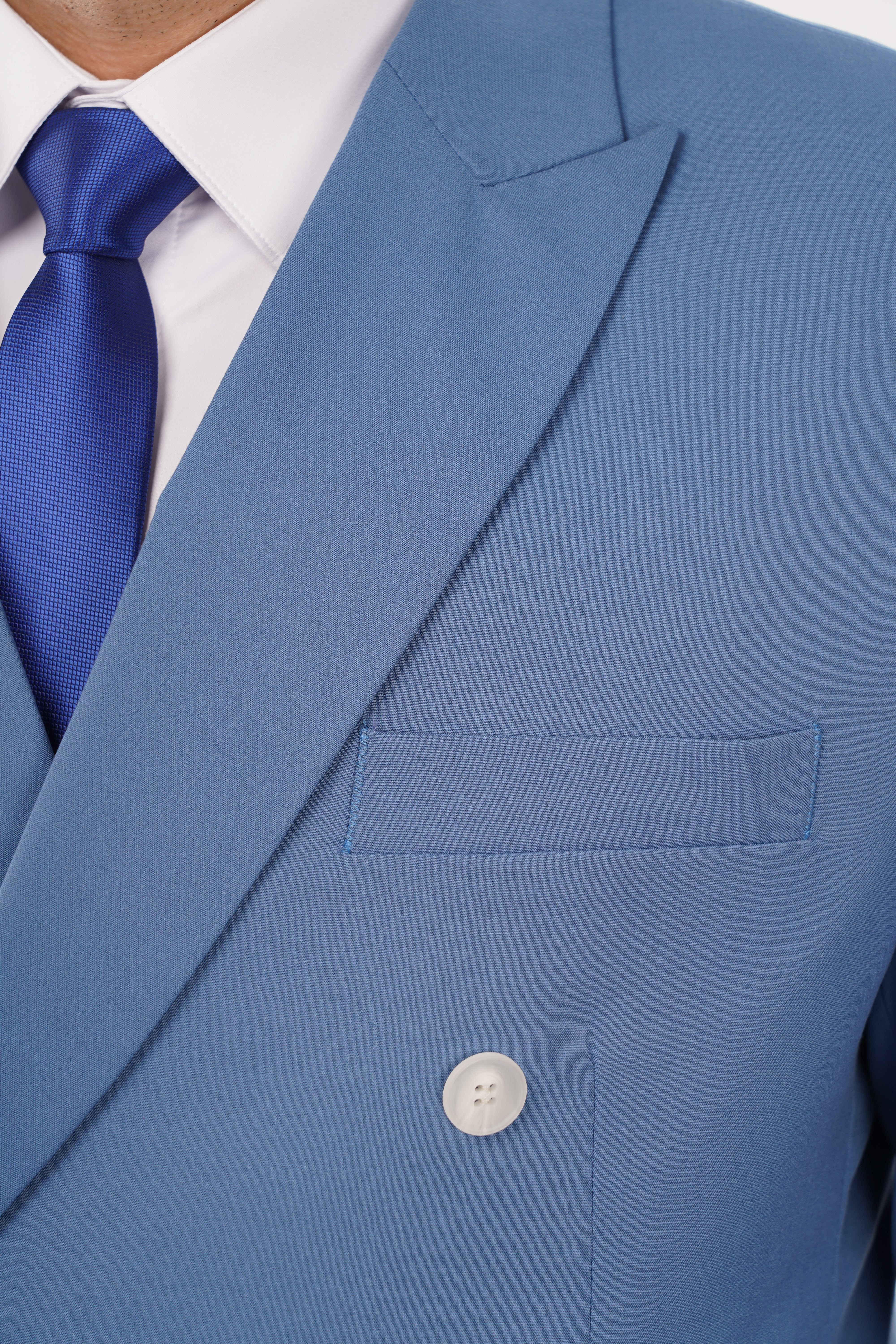 Costum Bărbați Albastru la Două Rânduri de Nasturi din Lână