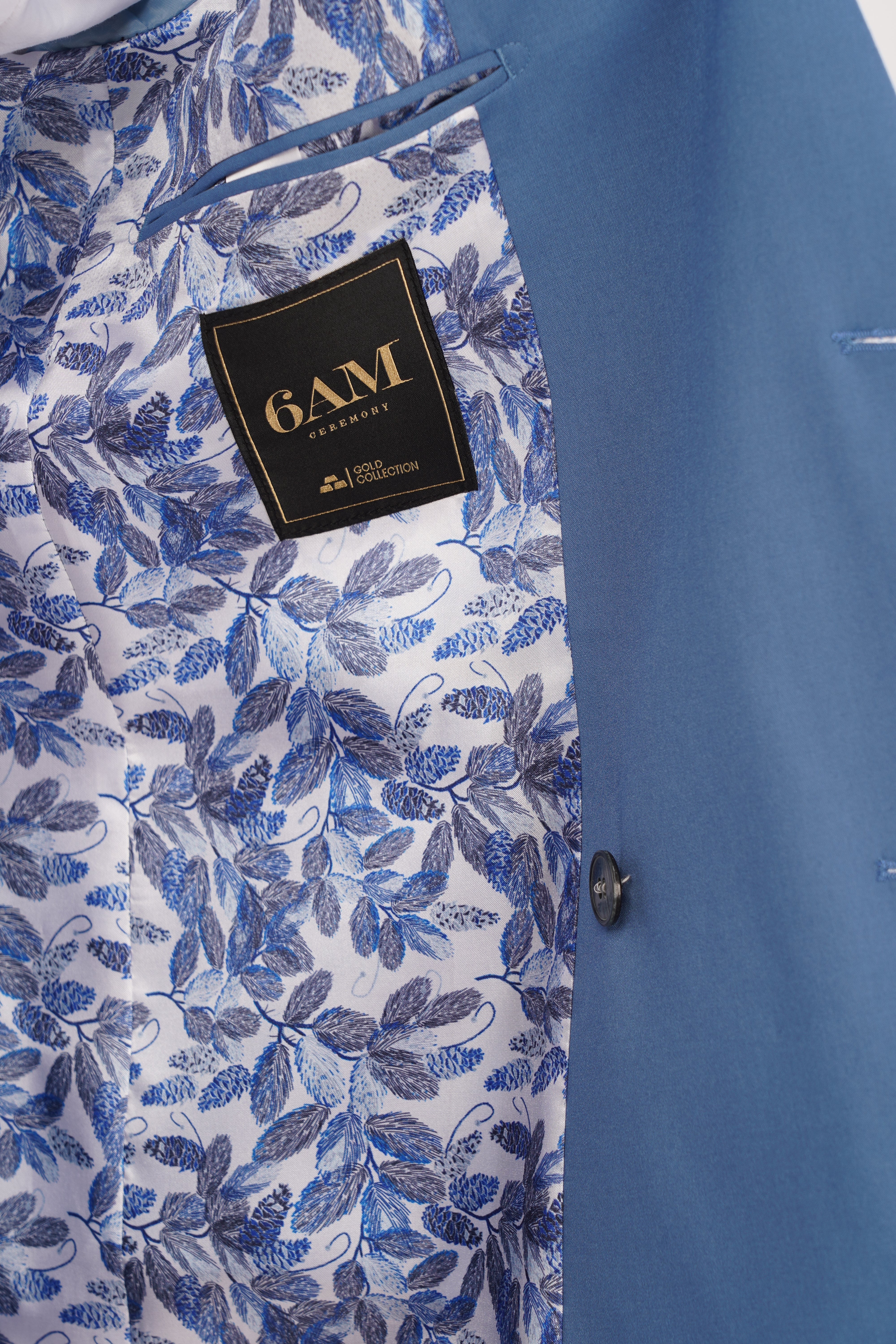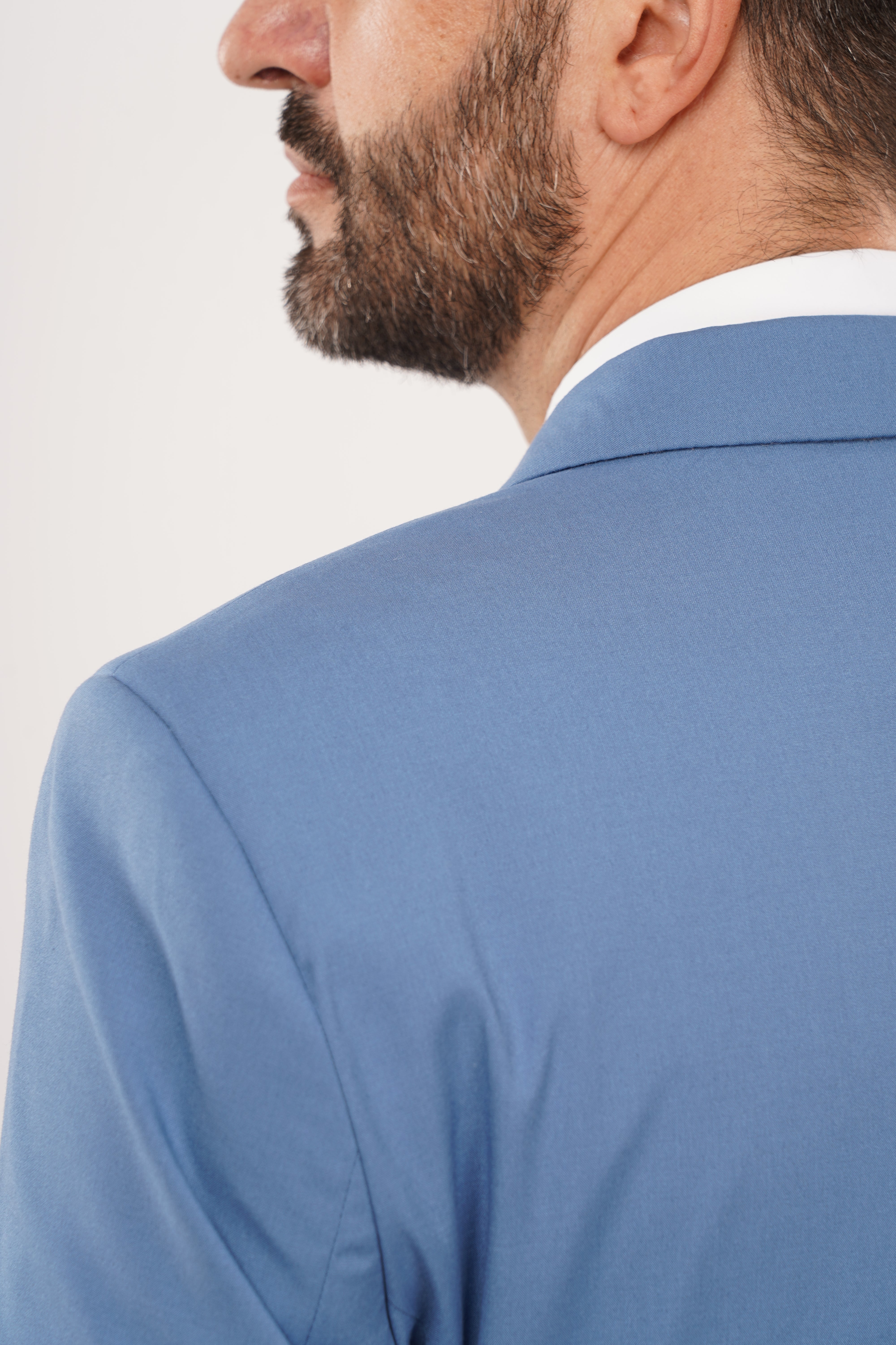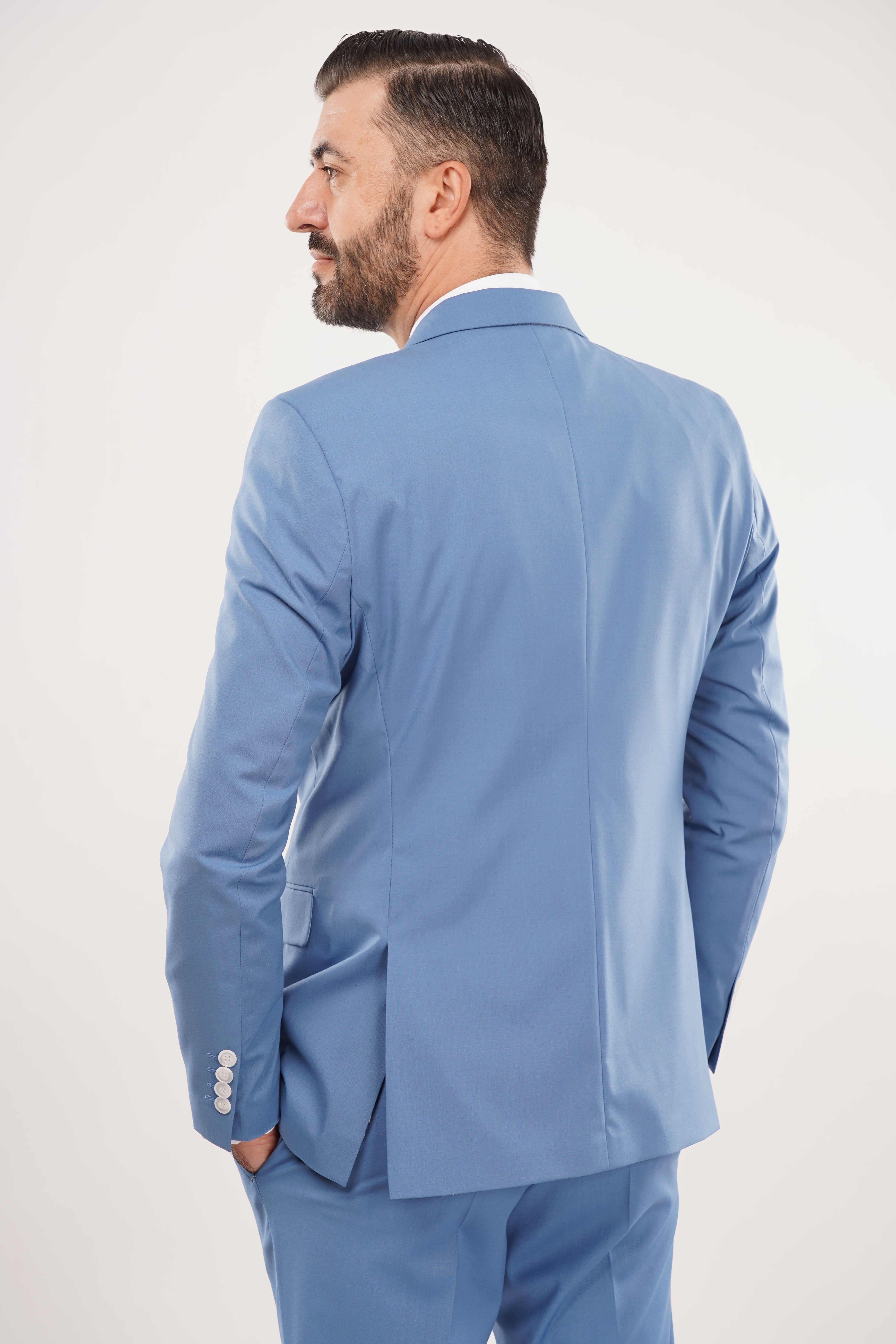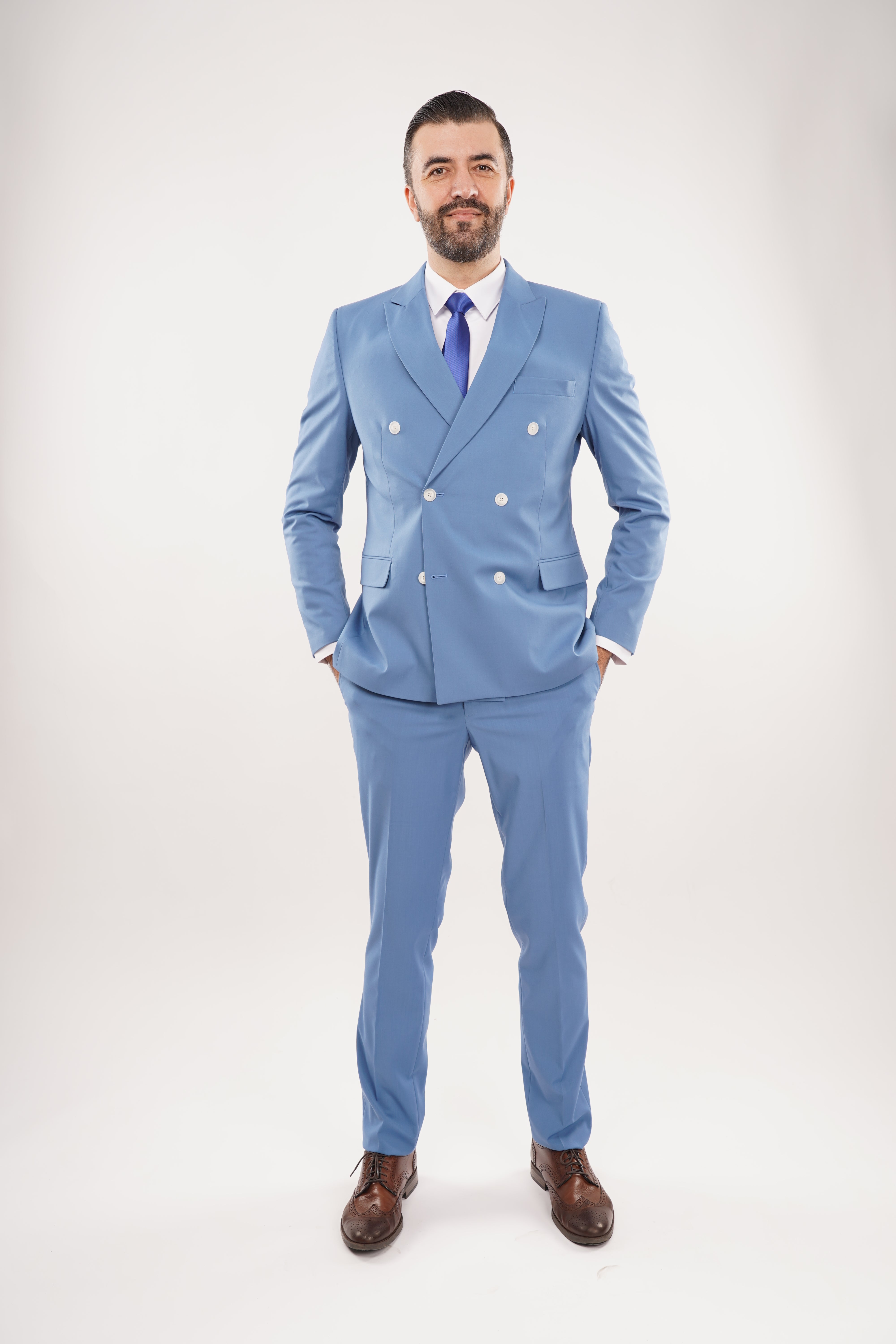 Costum elegant pentru bărbați, în nuanță albastră, format din sacou la două rânduri de nasturi și pantaloni asortați. Croiala modernă și proporțiile bine definite oferă o apariție rafinată și echilibrată.