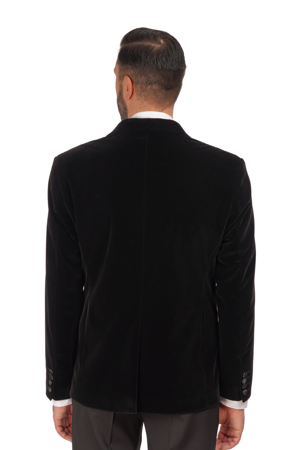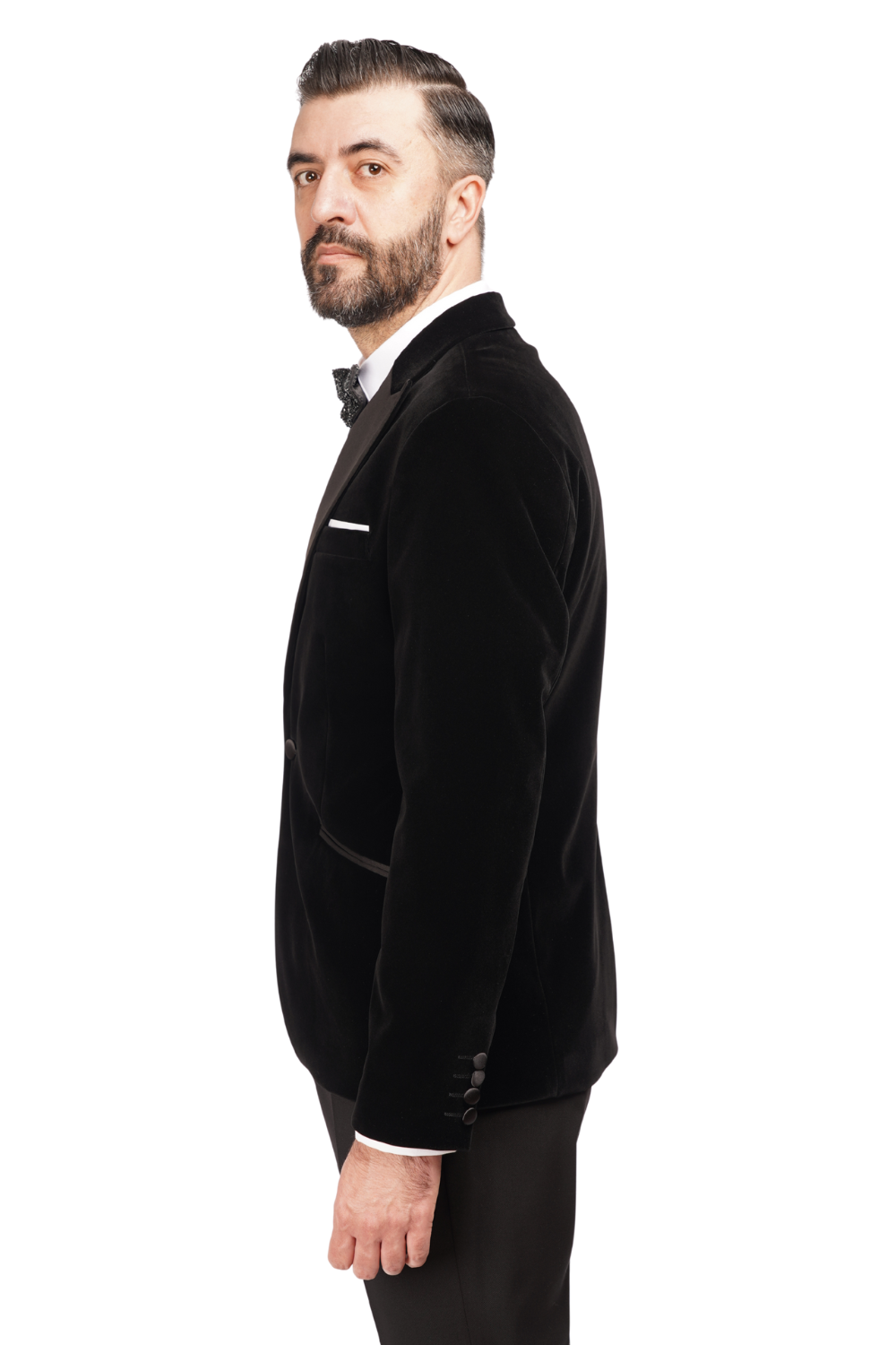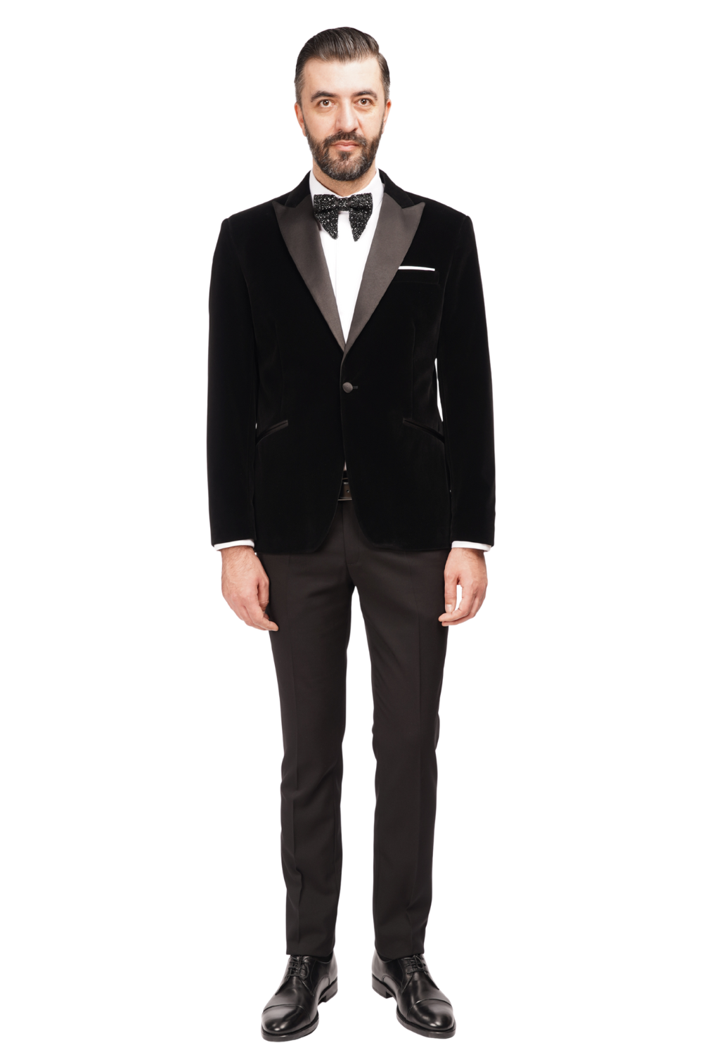 Smoking alcătuit din sacou din catifea neagră și pantaloni negri structurați, ideal pentru apariții elegante și evenimente formale. Sacoul are revere satinate, croială modernă și un aspect sofisticat datorită texturii din catifea.