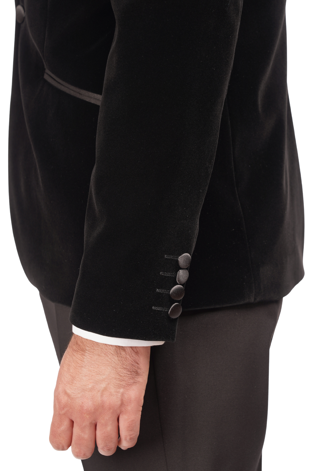 Sacoul este realizat din catifea de calitate, iar pantalonii sunt confecționați din stofa structurată. Setul îmbină stilul black-tie cu o notă contemporană.