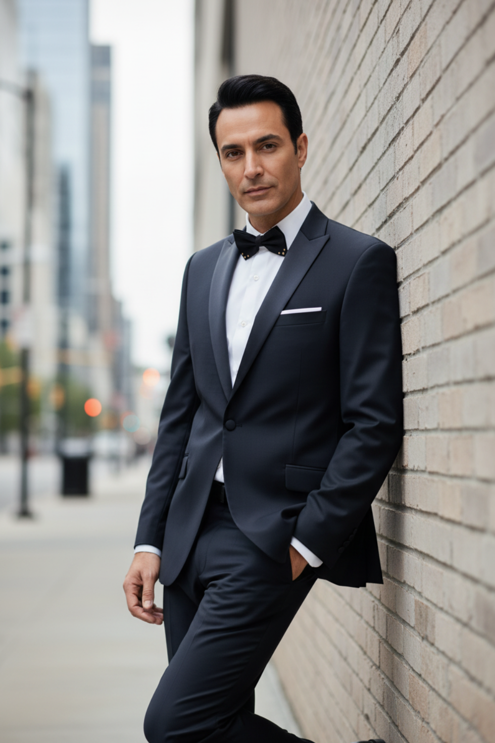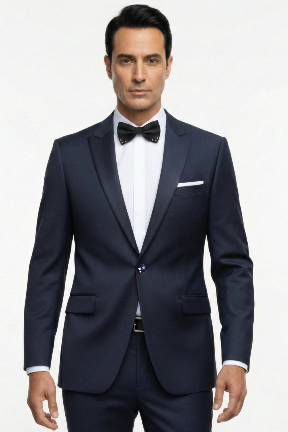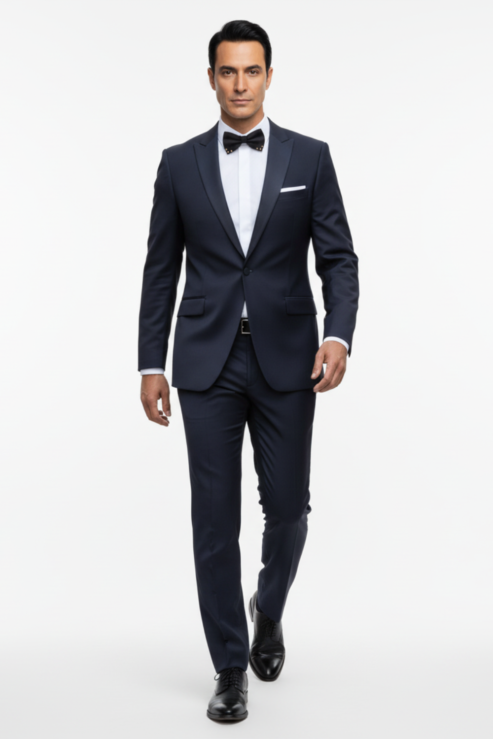 Smoking elegant pentru bărbați, în nuanță bleumarin clasică, realizat într-o croială Slim Fit ce pune în valoare o siluetă modernă și rafinată. Setul este compus din sacou cu rever satinat, pantaloni asortați și vestă în aceeași textură, creând un ansamblu premium echilibrat și sofisticat.