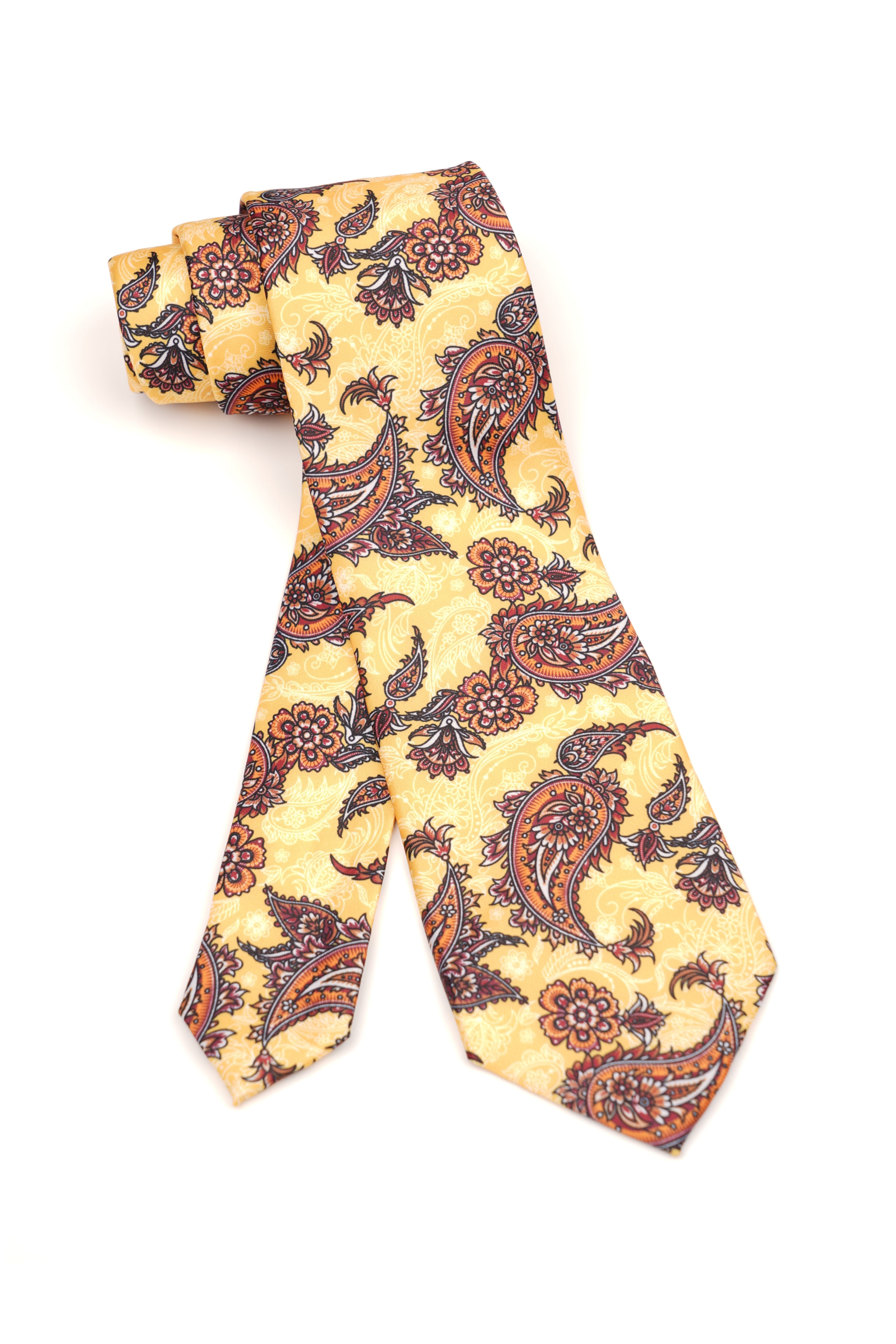Cravată clasică galbenă cu imprimeu paisley roșu