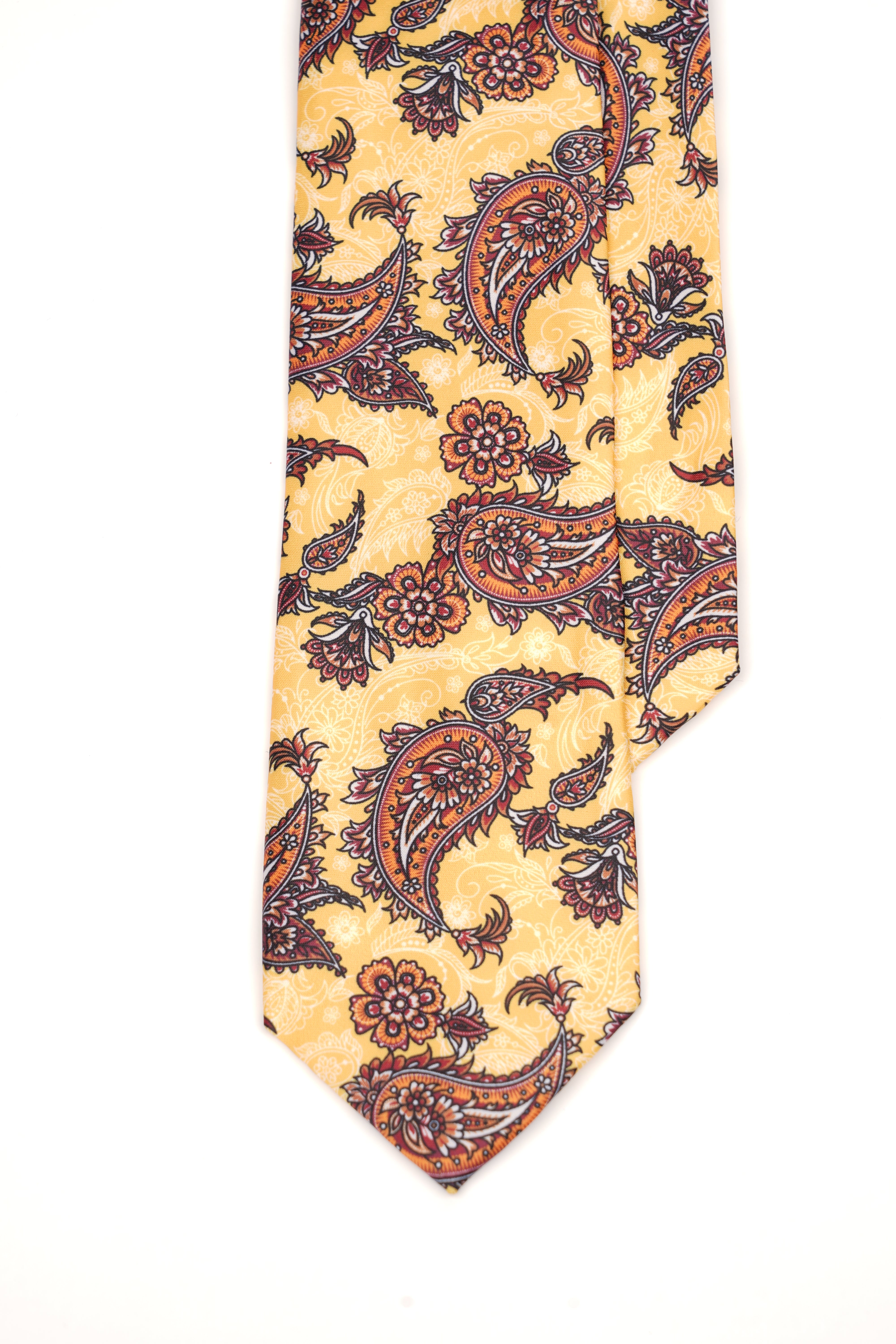 Această cravată din mătase 100% adaugă o notă vibrantă oricărei ținute, datorită nuanței luminoase de galben și imprimeului paisley roșu intens, completat de accente negre și crem. Designul elegant îmbină tradiția clasică a motivelor orientale cu o cromatică modernă și expresivă.