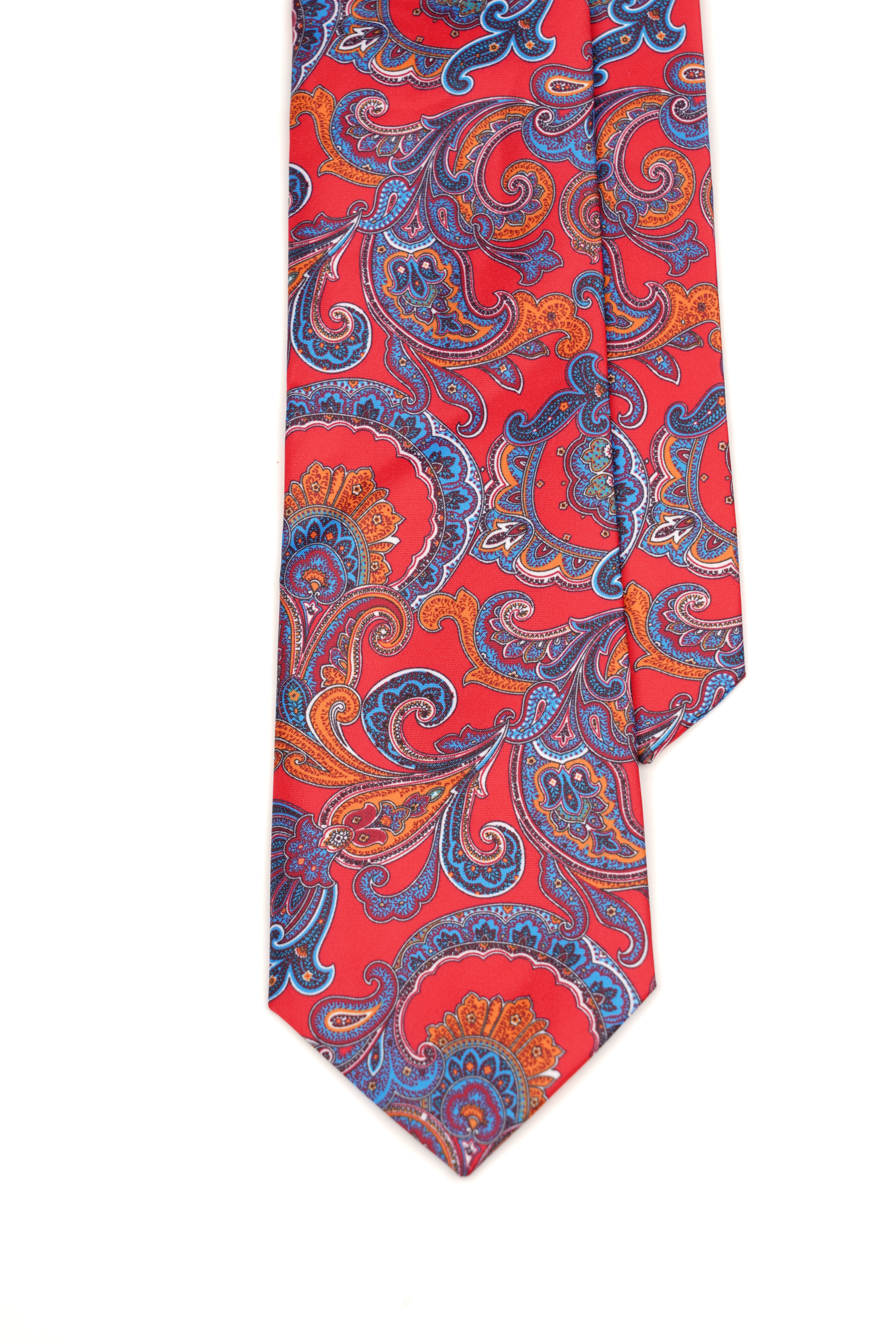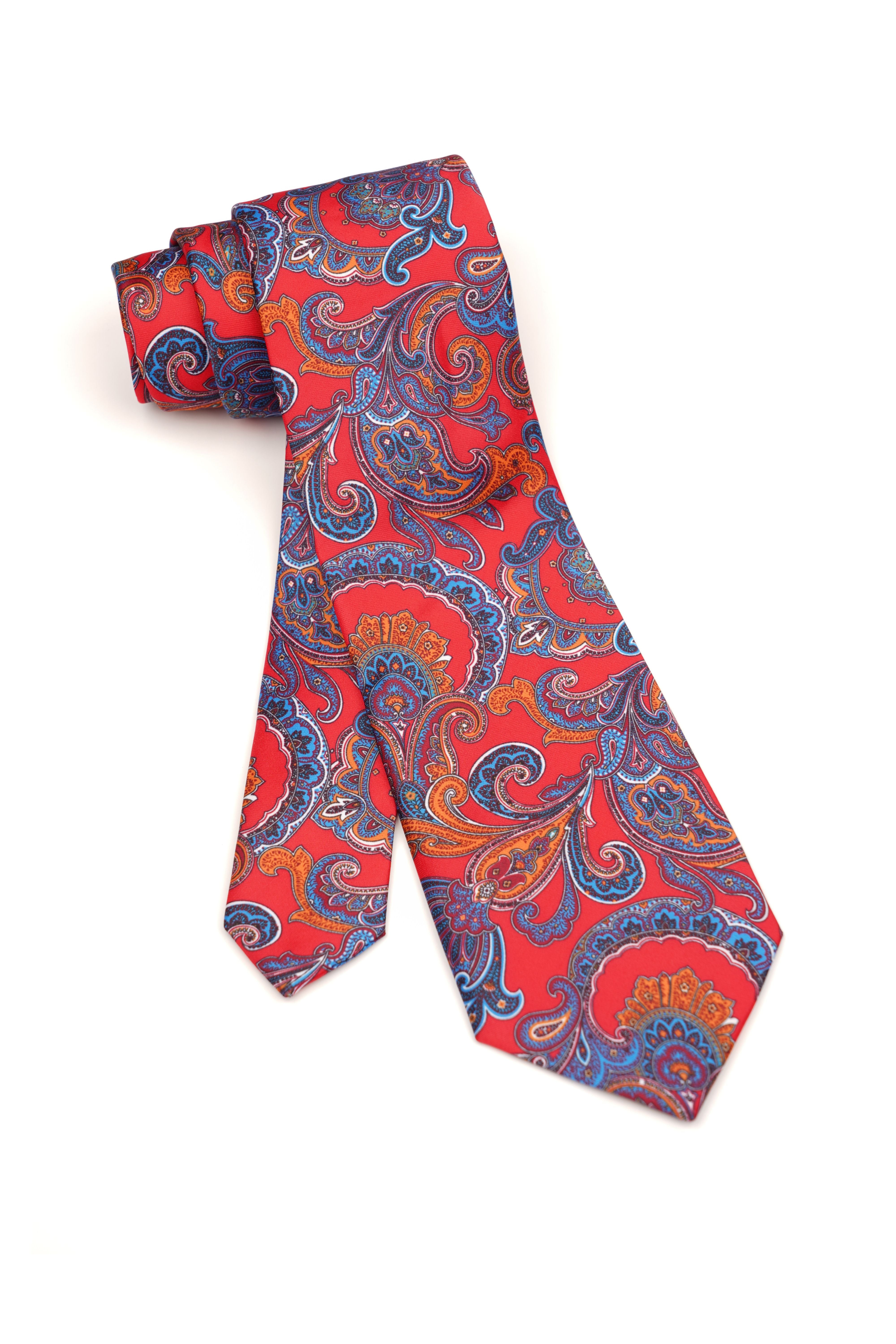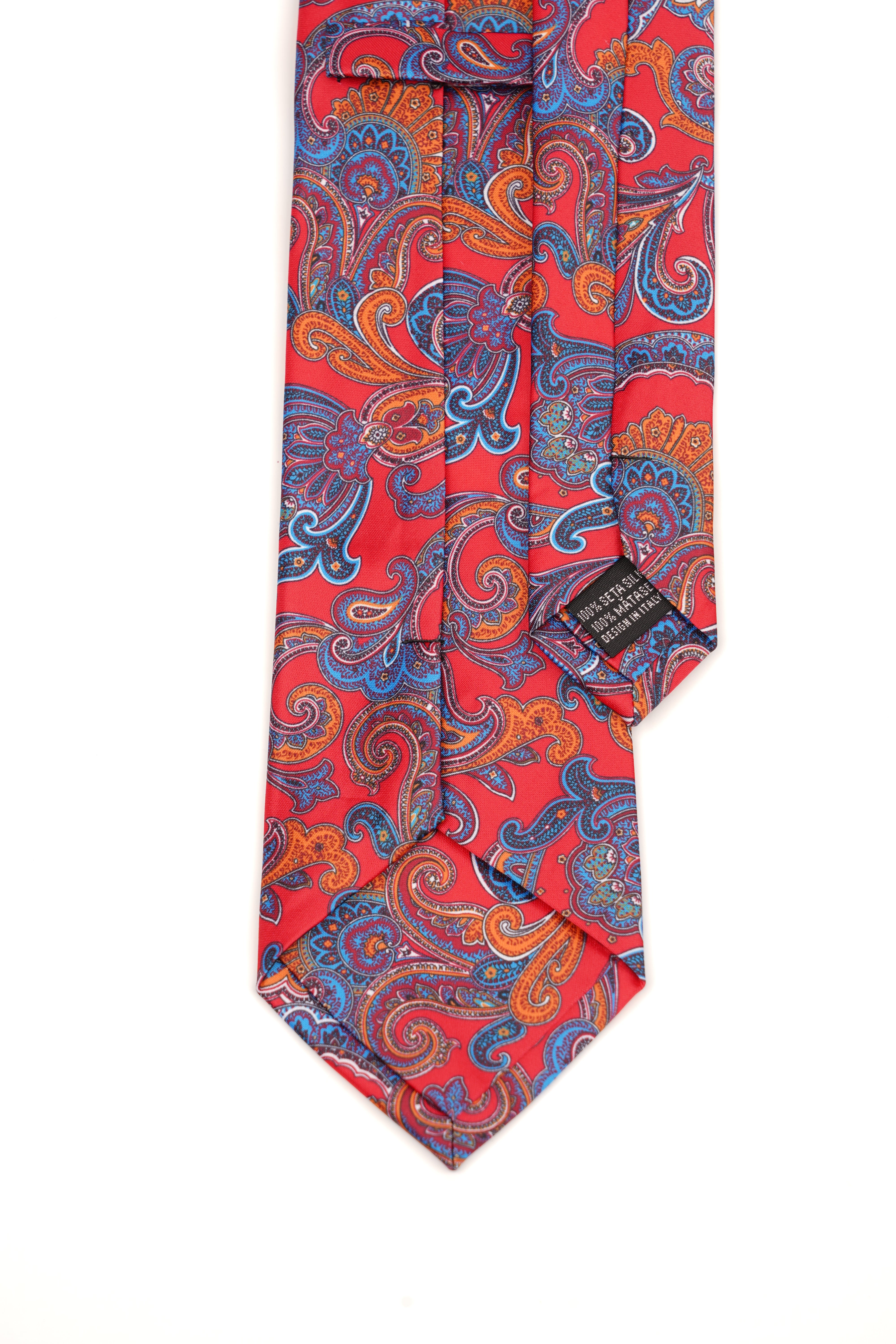 Cravată clasică roșie cu model paisley albastru și portocaliu