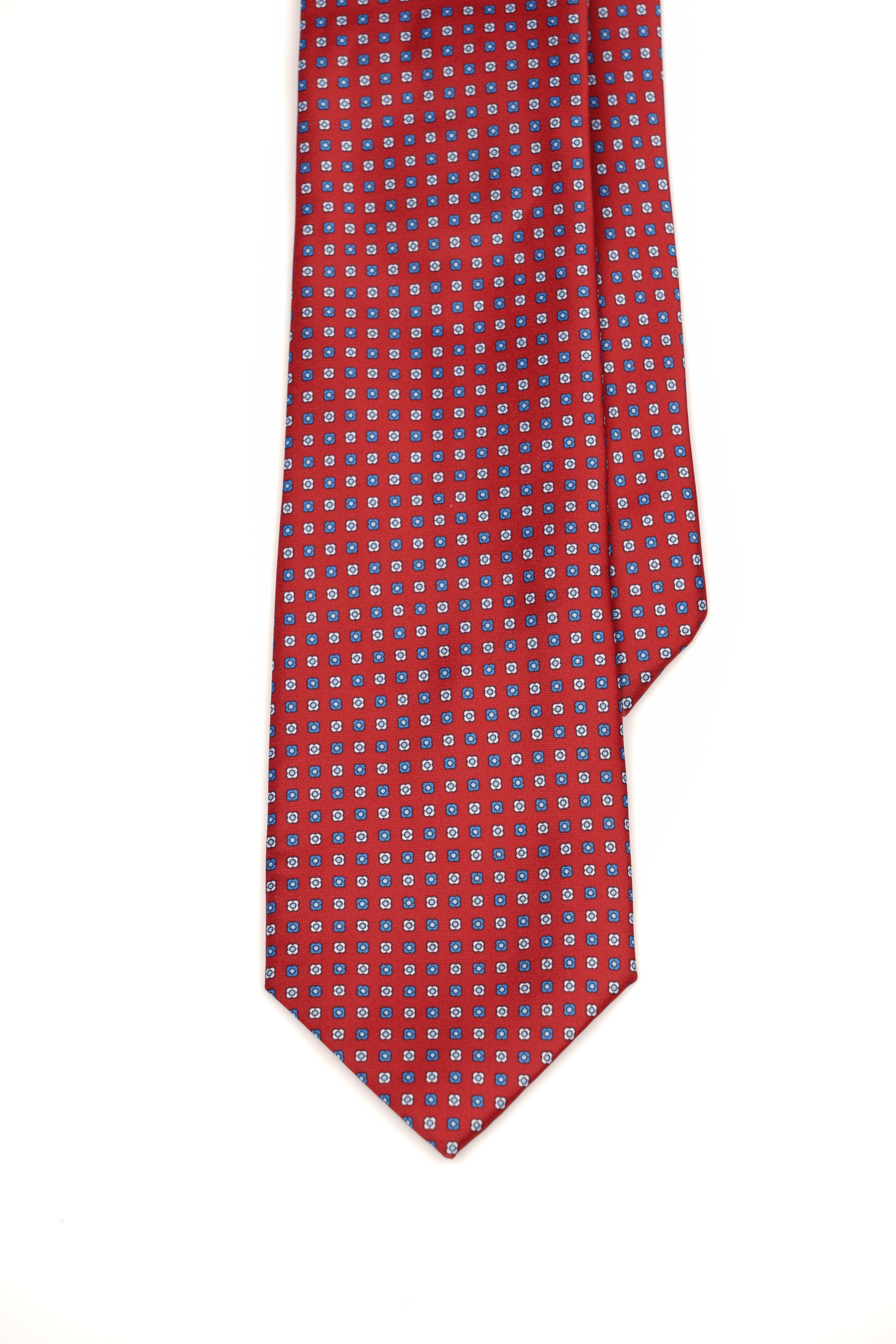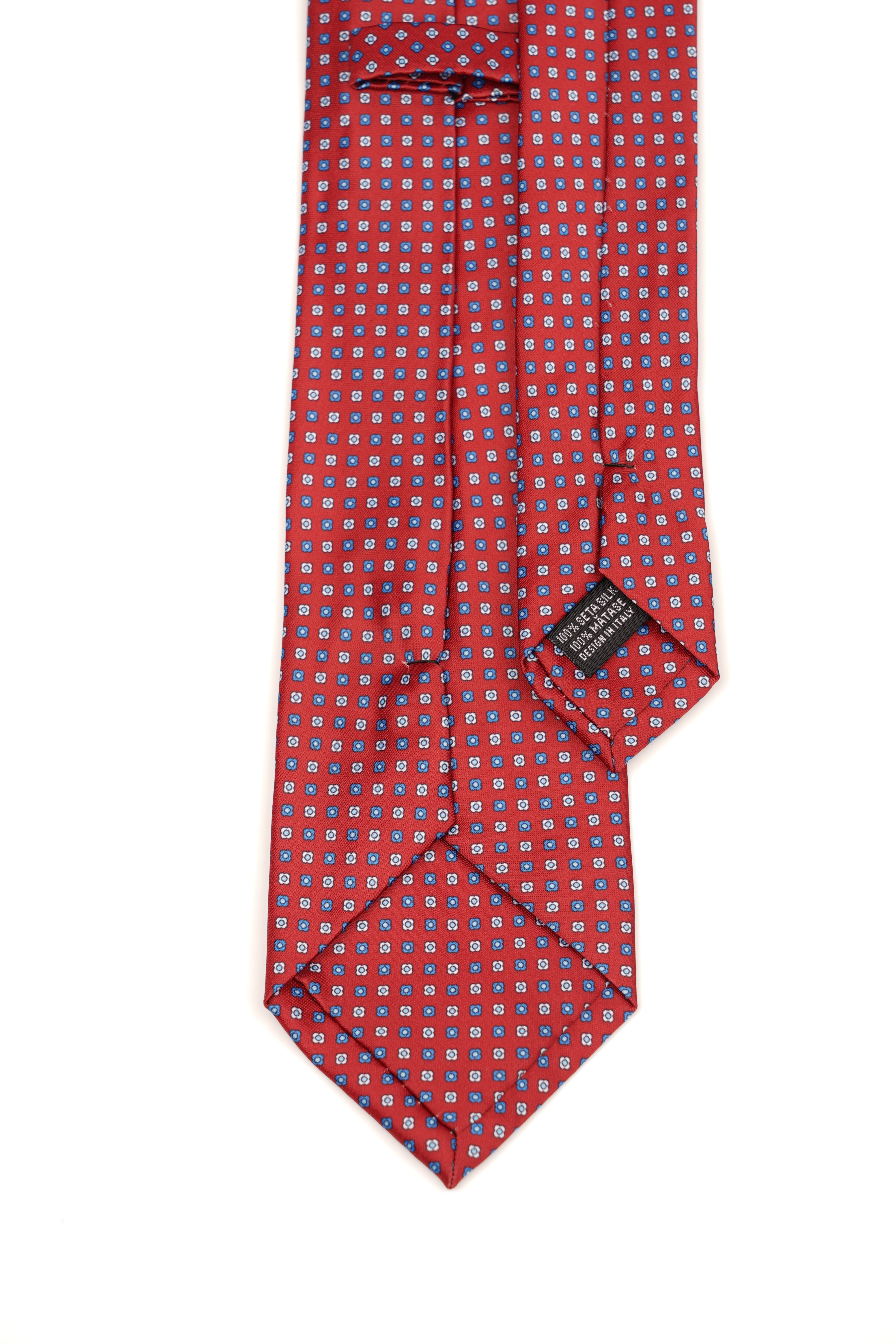 Această cravată roșie clasică atrage atenția prin modelul geometric subtil, alcătuit din microforme albastre și albe, care îi adaugă profunzime și personalitate. Este un accesoriu versatil, ce completează elegant atât o ținută business, cât și una formală.