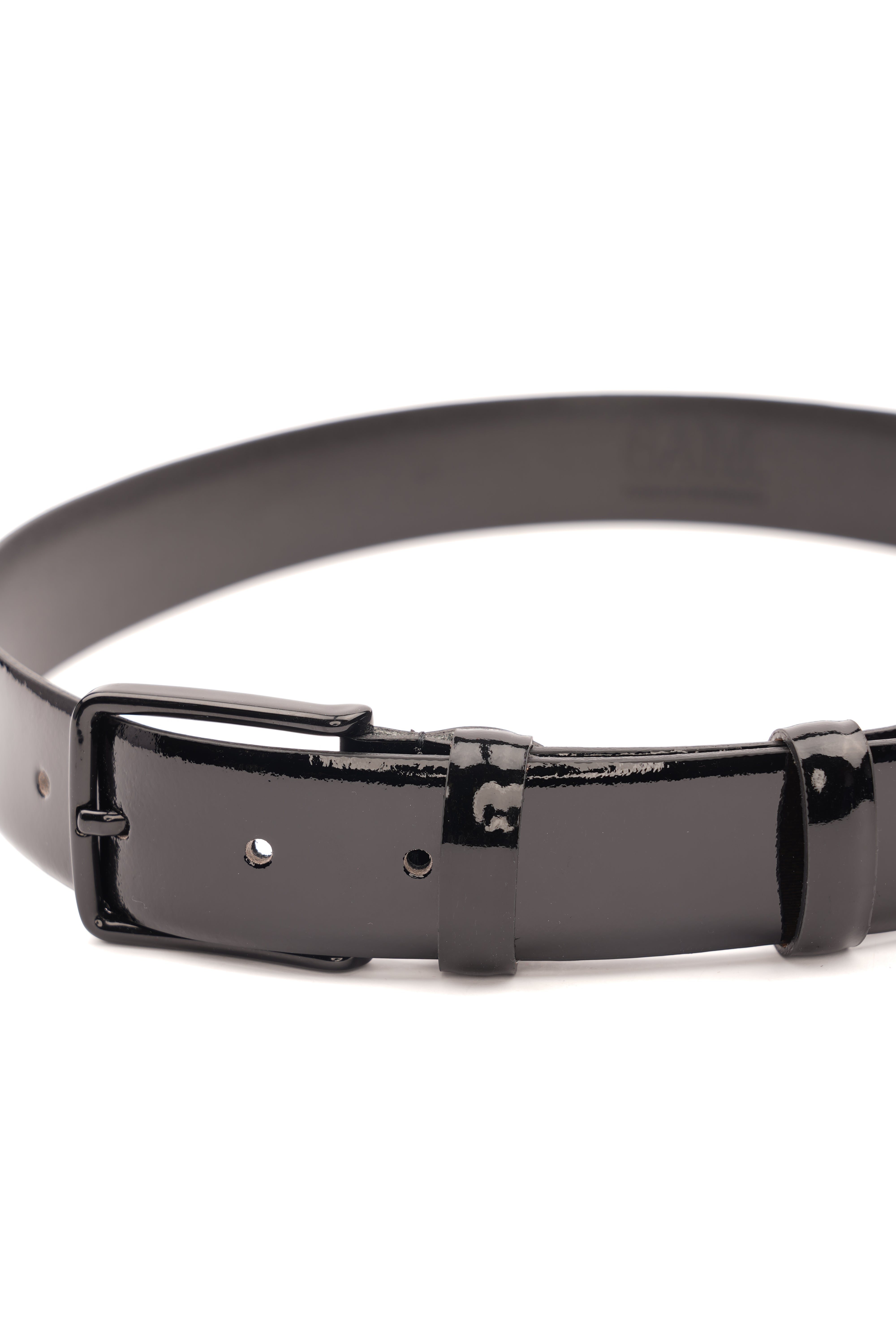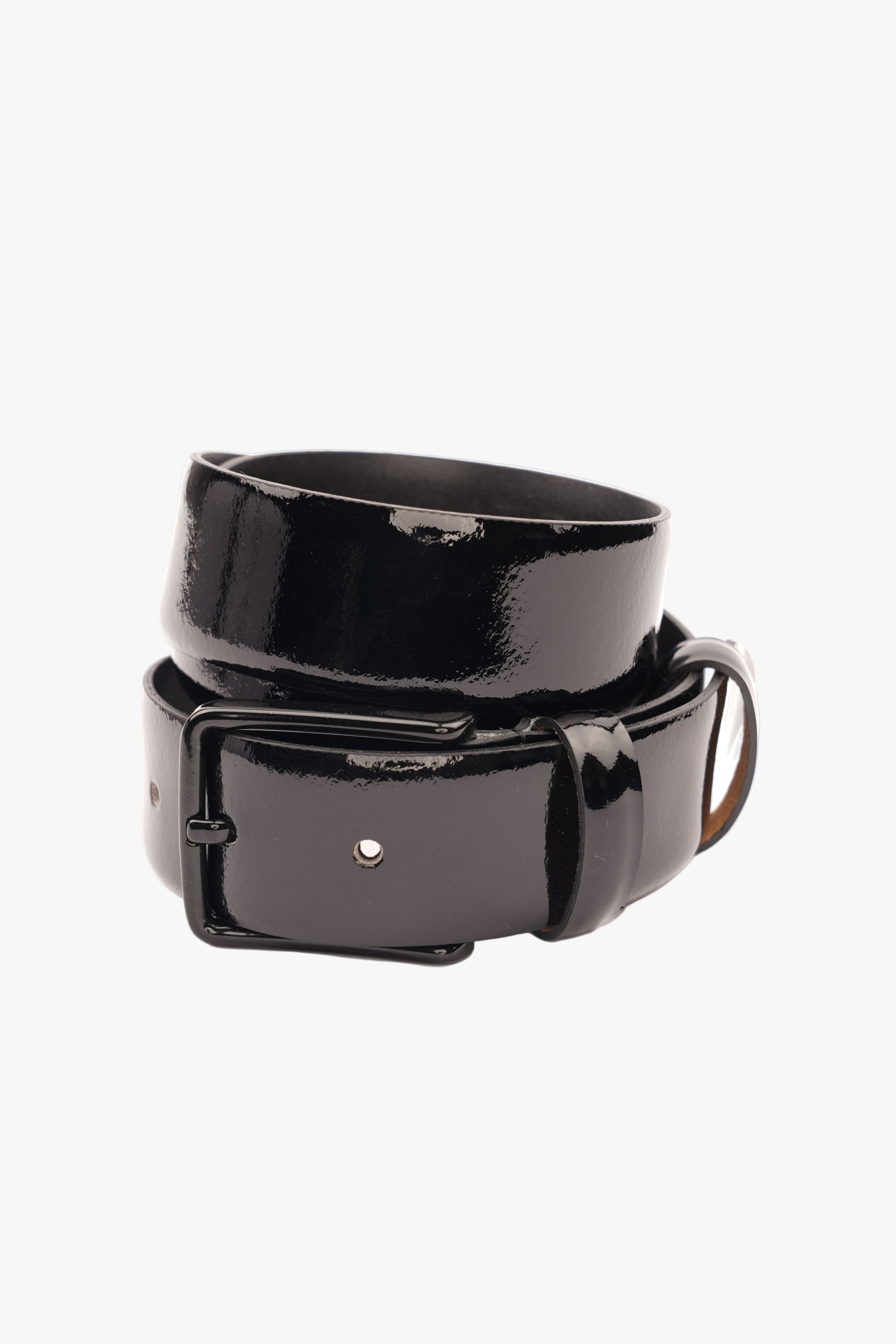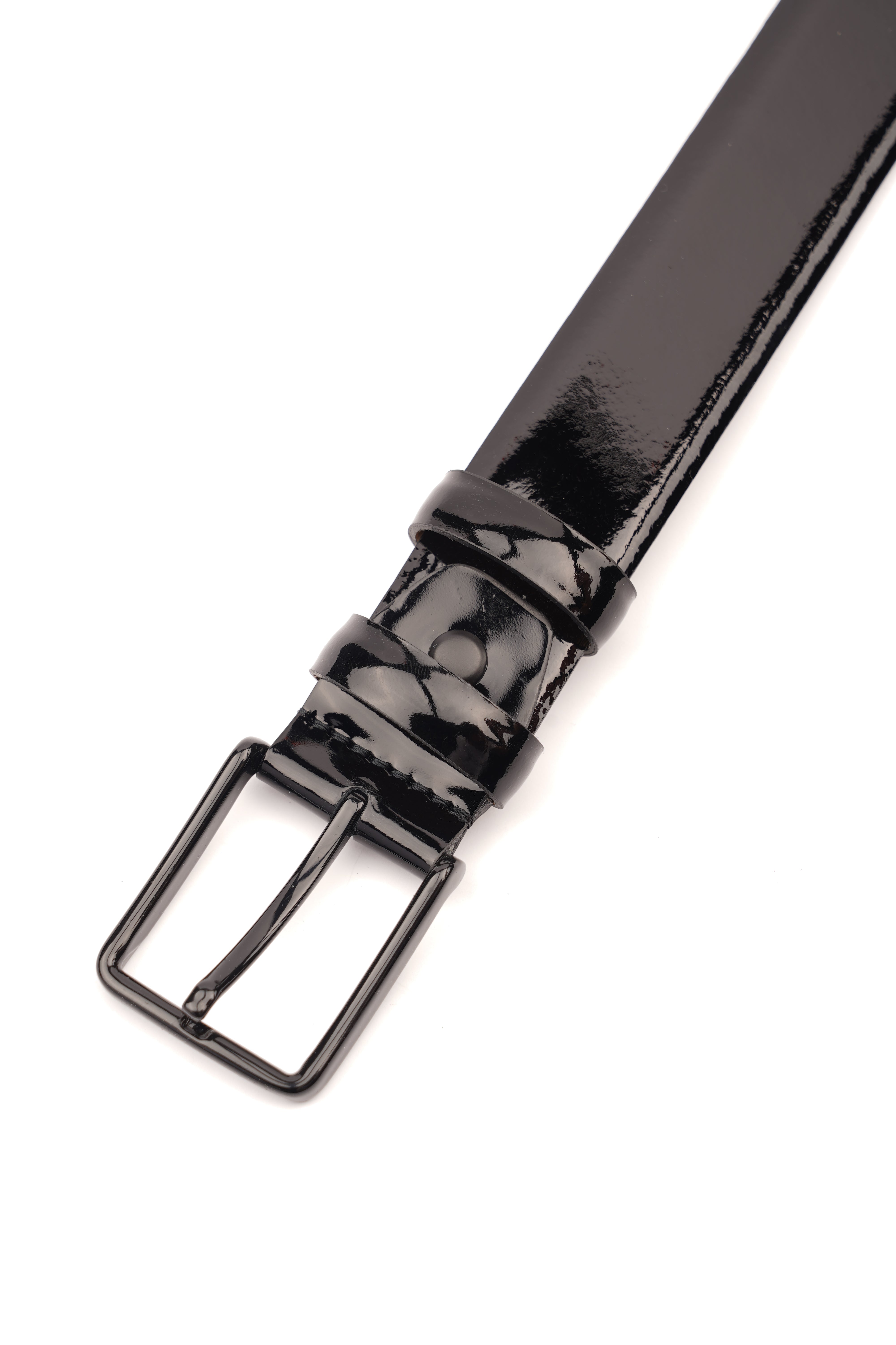 Această curea din piele lăcuită neagră adaugă o notă sofisticată și rafinată oricărei ținute elegante. Strălucirea distinctă a finisajului lucios îi conferă un caracter deosebit, perfect pentru evenimente formale sau pentru completarea unui costum clasic.