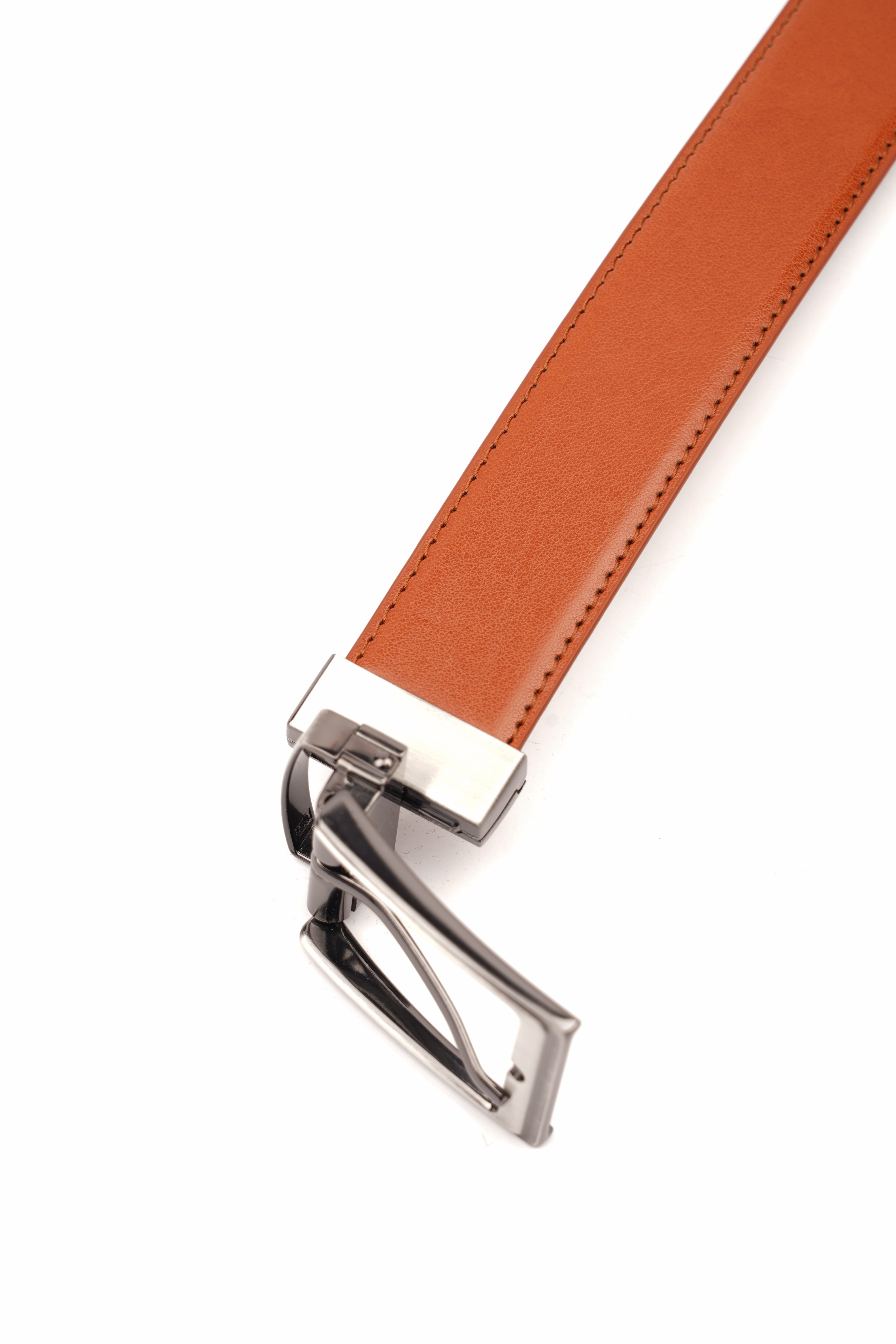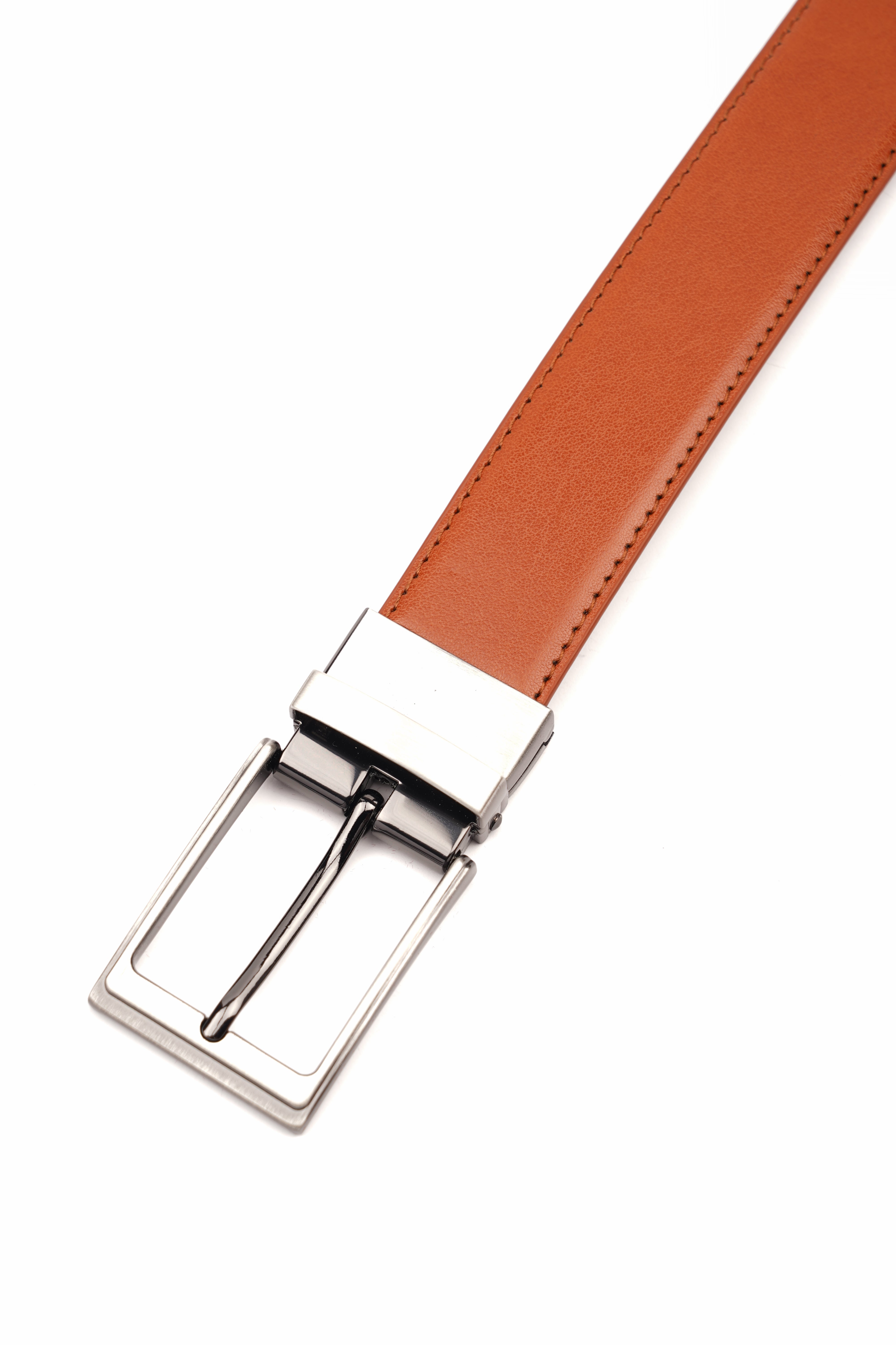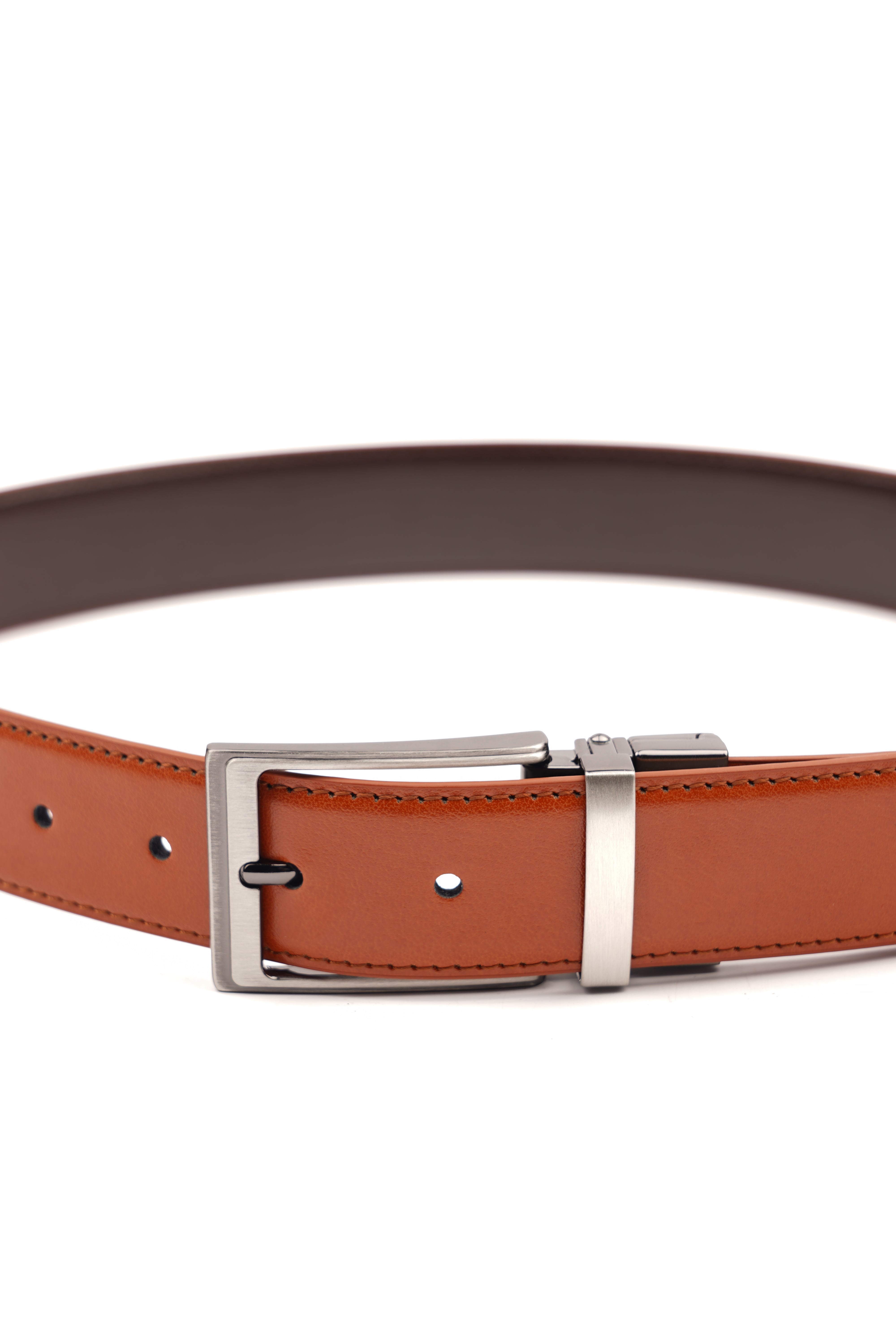 Această curea reversibilă din piele naturală îmbină rafinamentul clasic cu funcționalitatea modernă. Contrastul elegant dintre maro deschis și maro închis oferă versatilitate, permițând adaptarea rapidă la diferite ținute — de la costumele business la combinații casual rafinate.