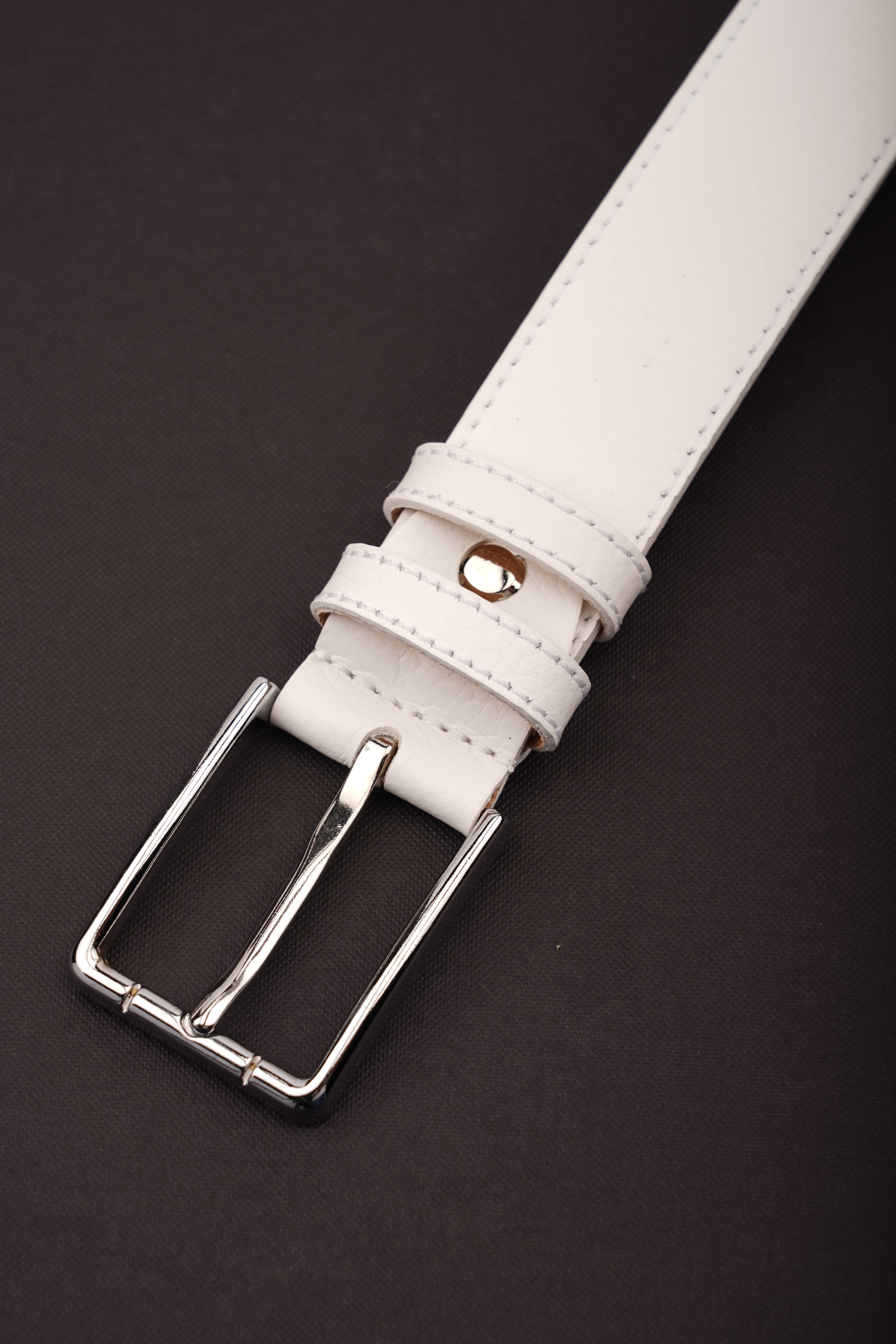 Curea Bărbați din Piele Naturală Albă cu Cataramă Metalică Lucioasă