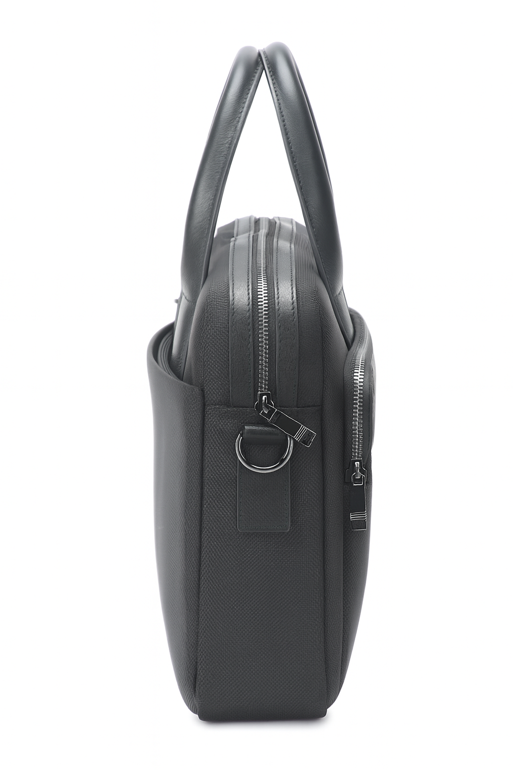 Această geantă elegantă îmbină rafinamentul pielii cu textura modernă a materialului textil, rezultând un accesoriu potrivit atât pentru birou, cât și pentru ținute casual. Designul minimalist, completat de mânerele solide și finisajul negru mat, transmite profesionalism și încredere.