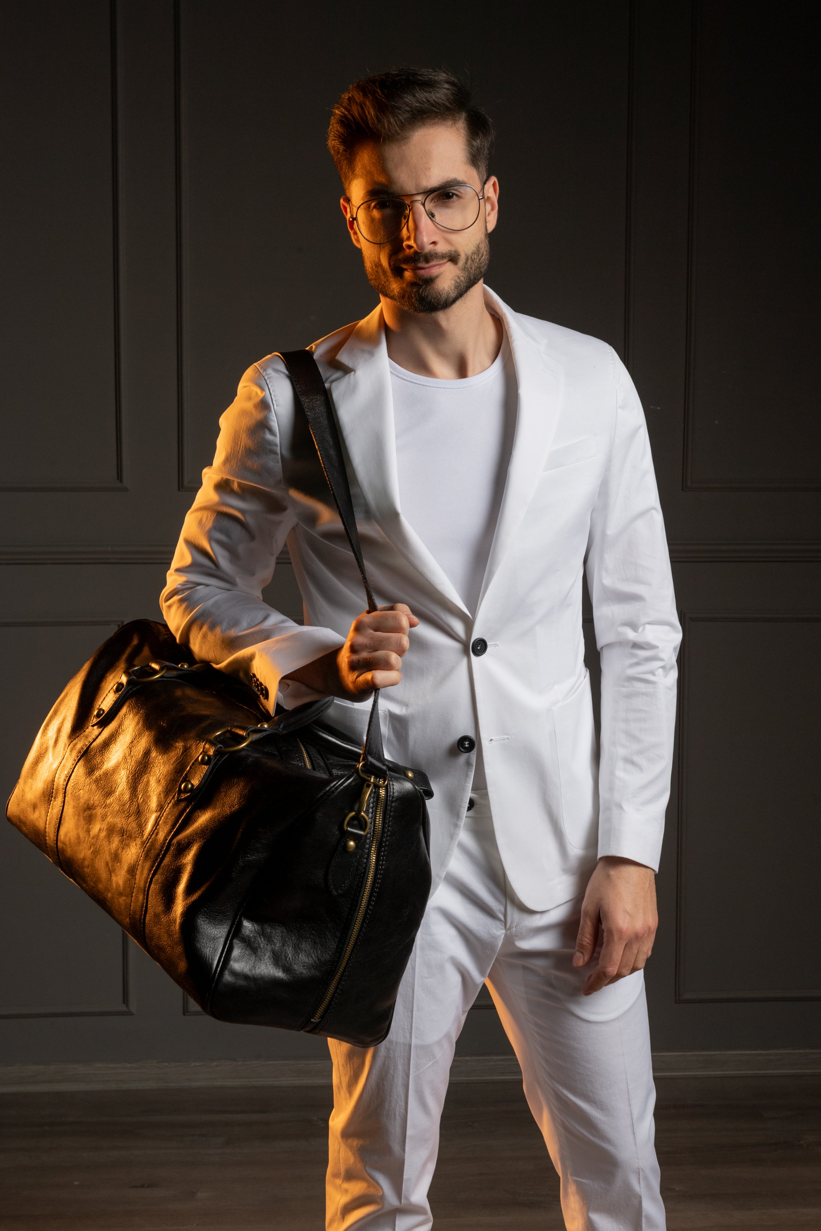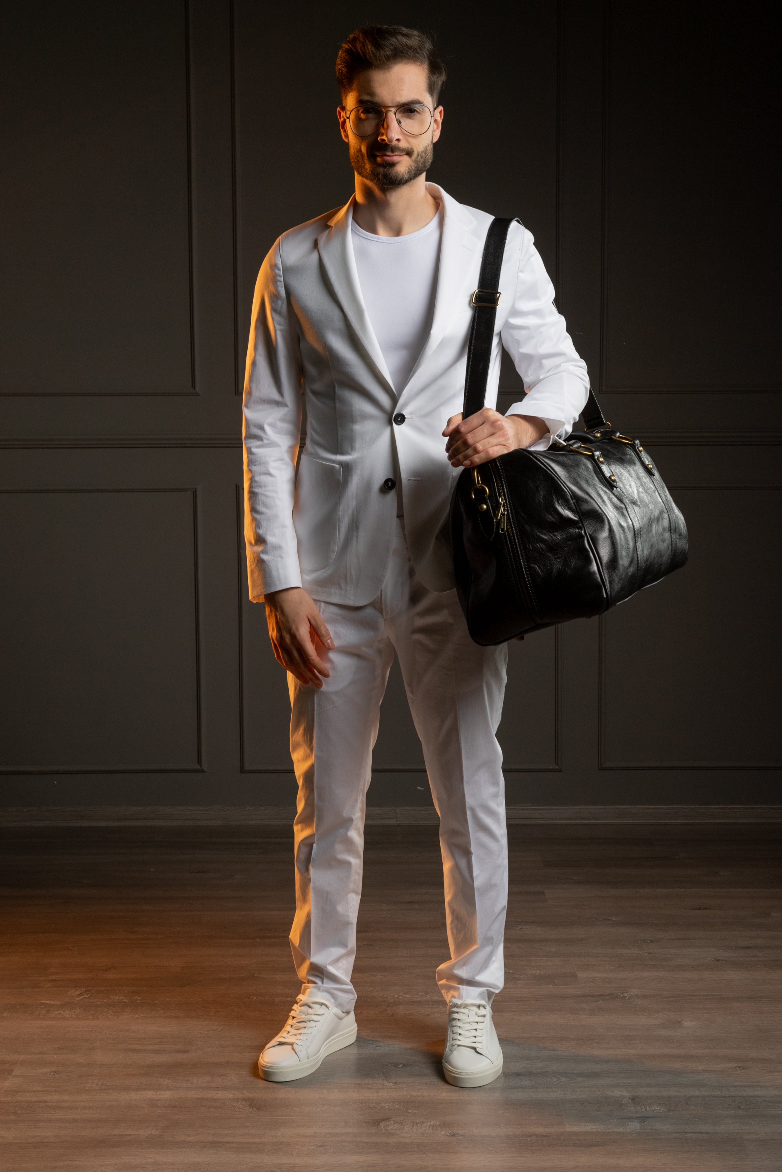 Costum Bărbați Alb din Bumbac cu Sacou la Un Rând de Nasturi
