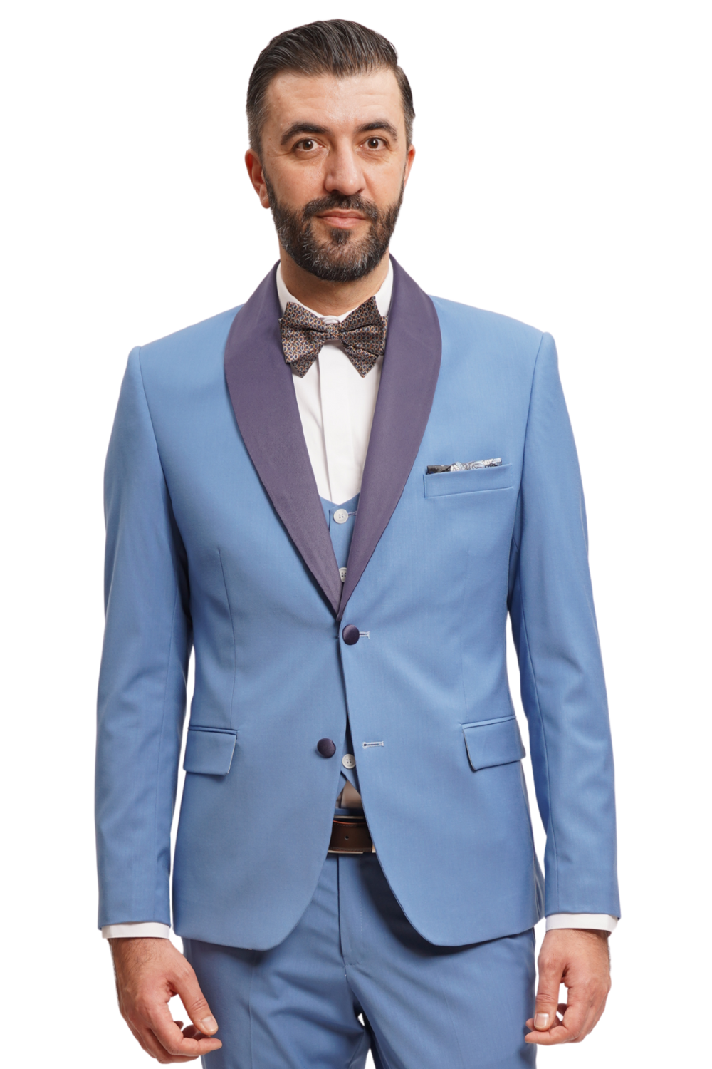 Costum elegant pentru bărbați, în nuanță albastru texturat, compus din sacou la un rând de nasturi și pantaloni asortați. Designul clasic și croiala atent realizată oferă un aspect rafinat și echilibrat.