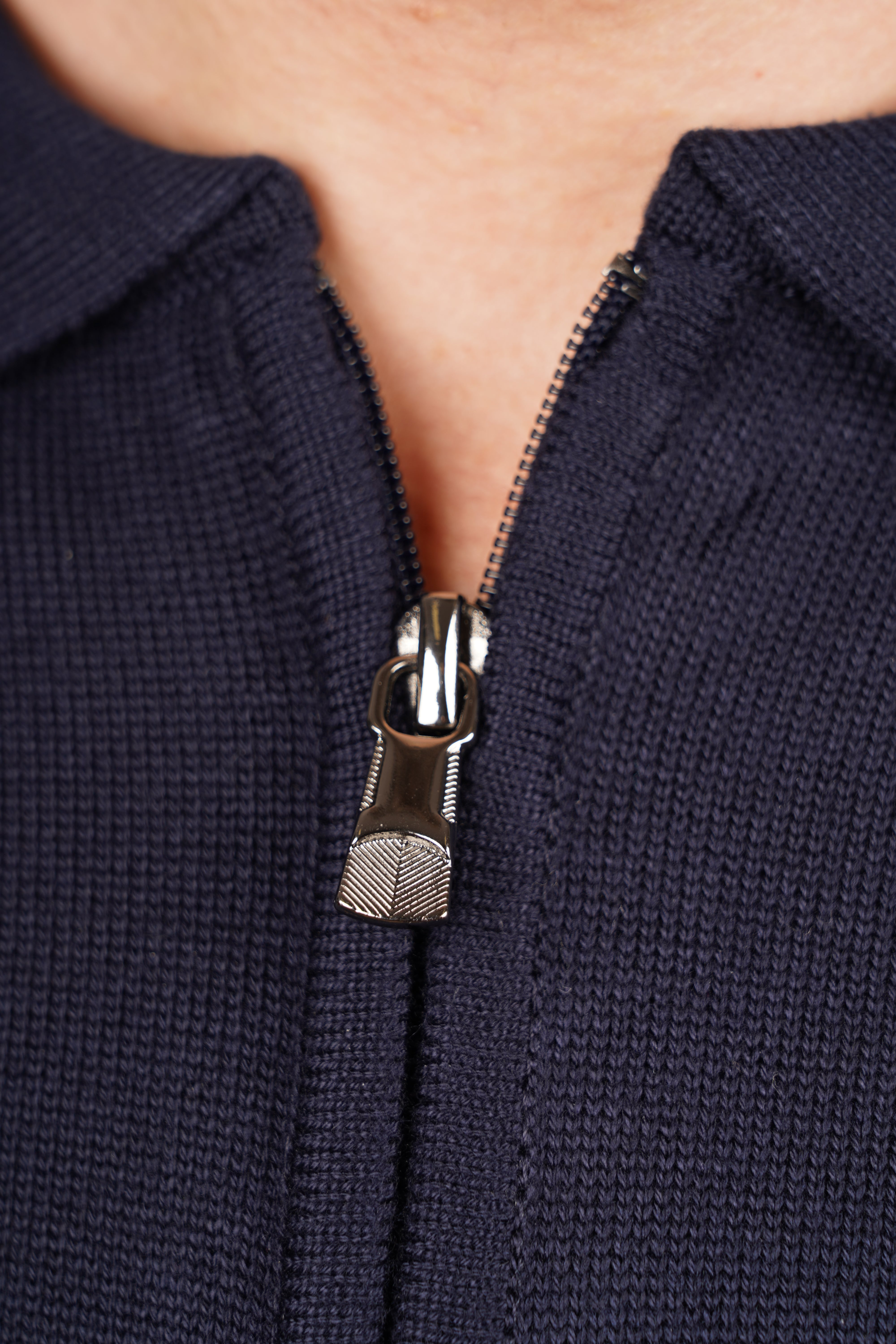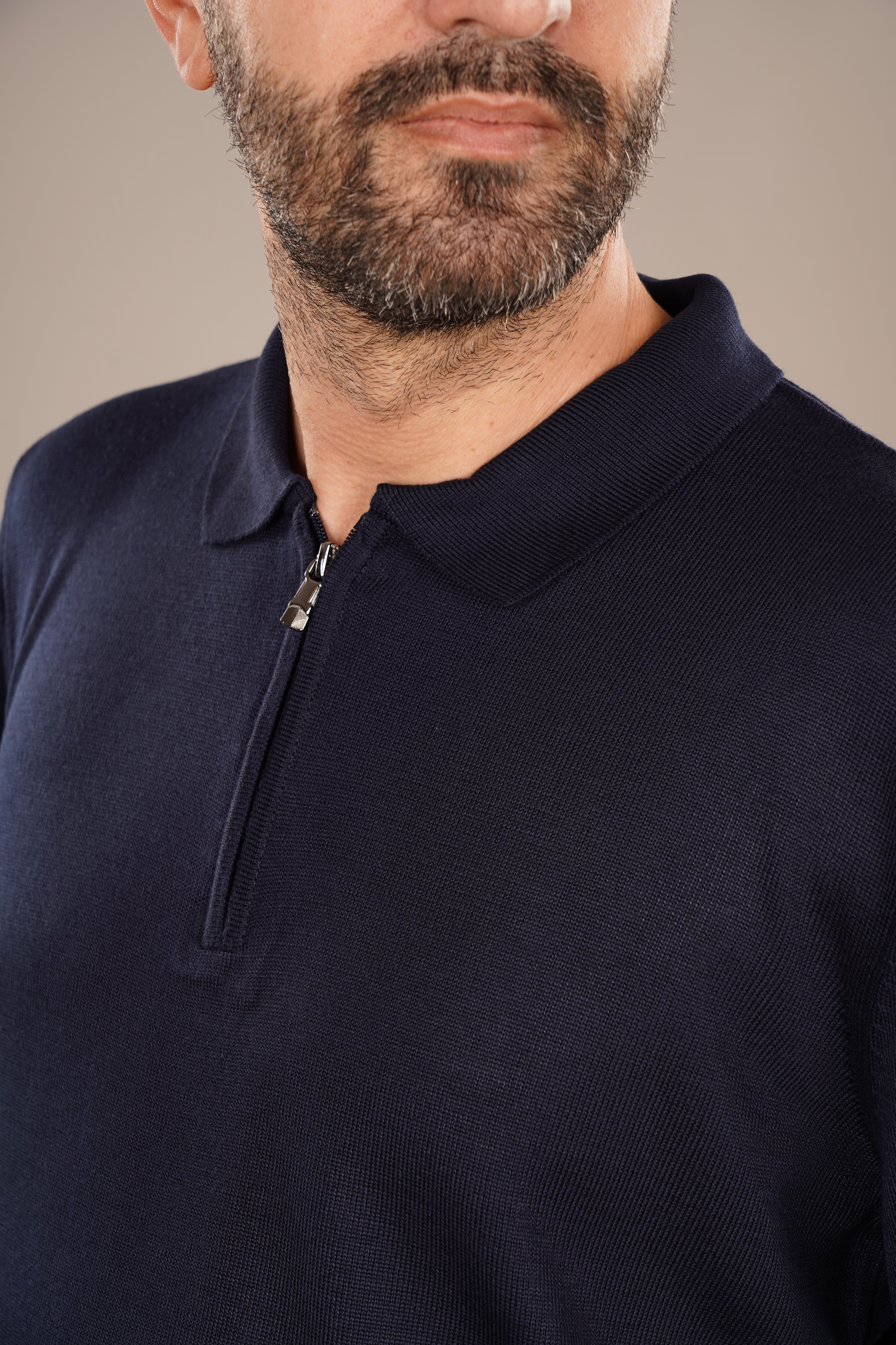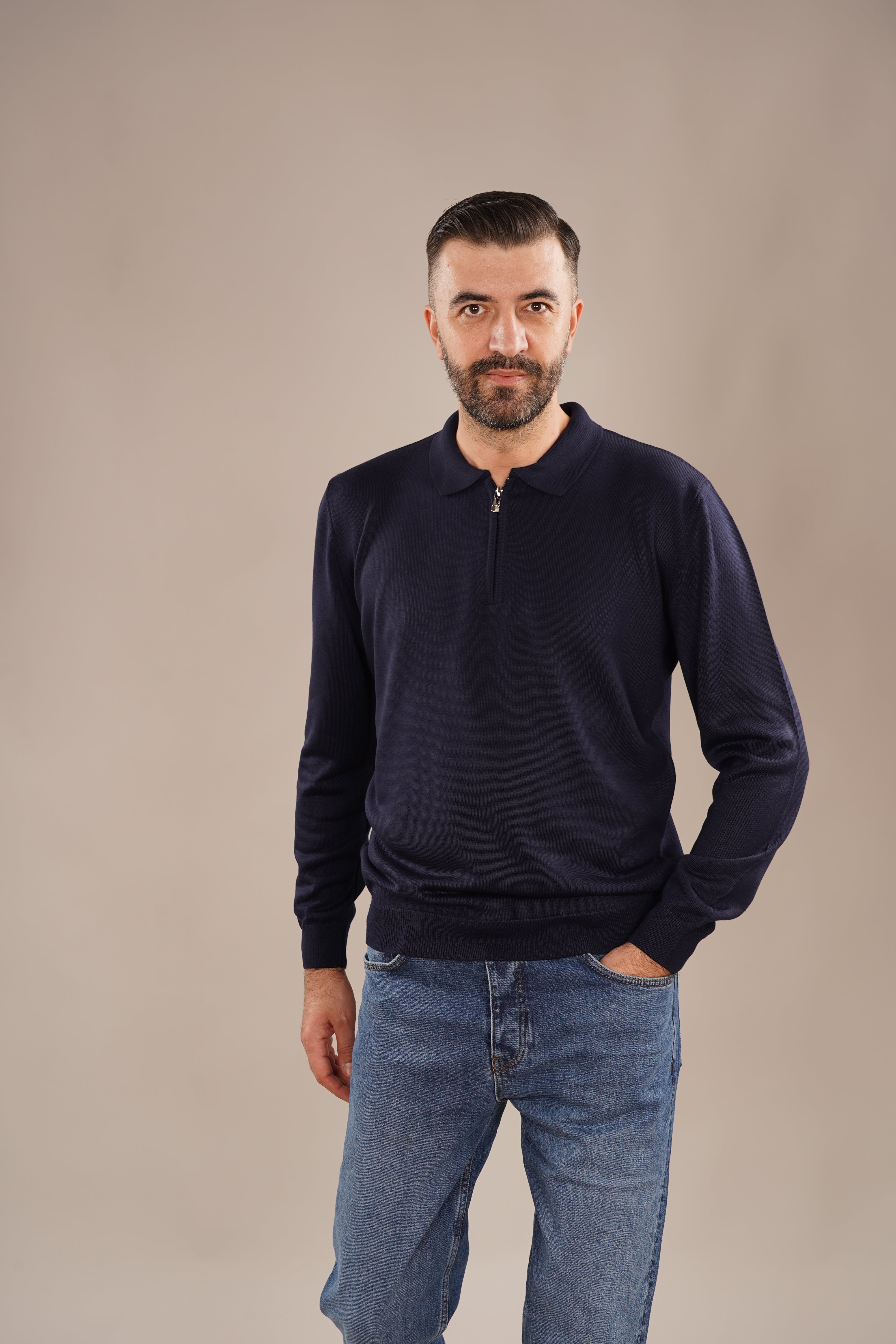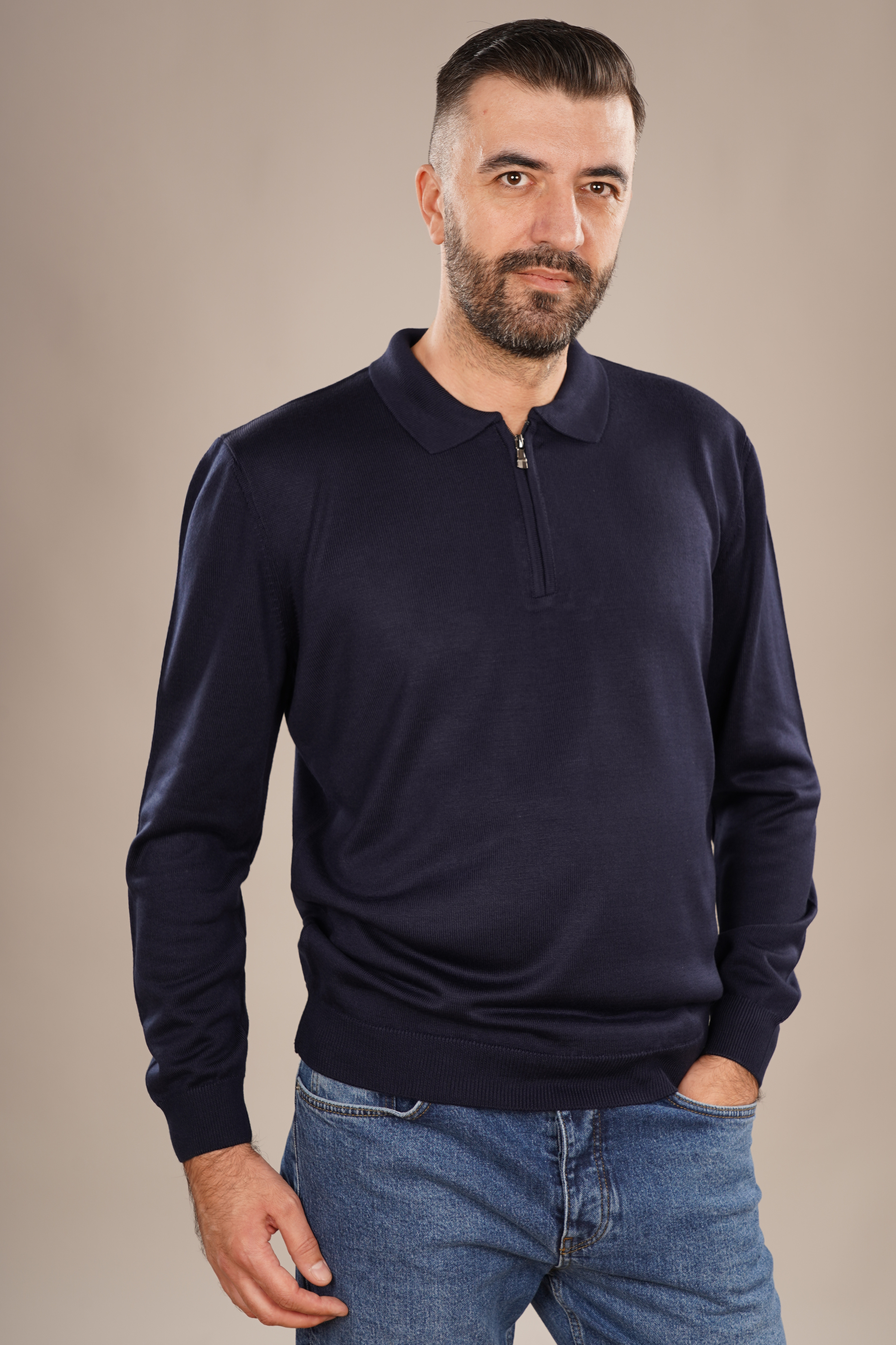 Pulover Bărbați Bleumarin cu Guler Polo și Fermuar