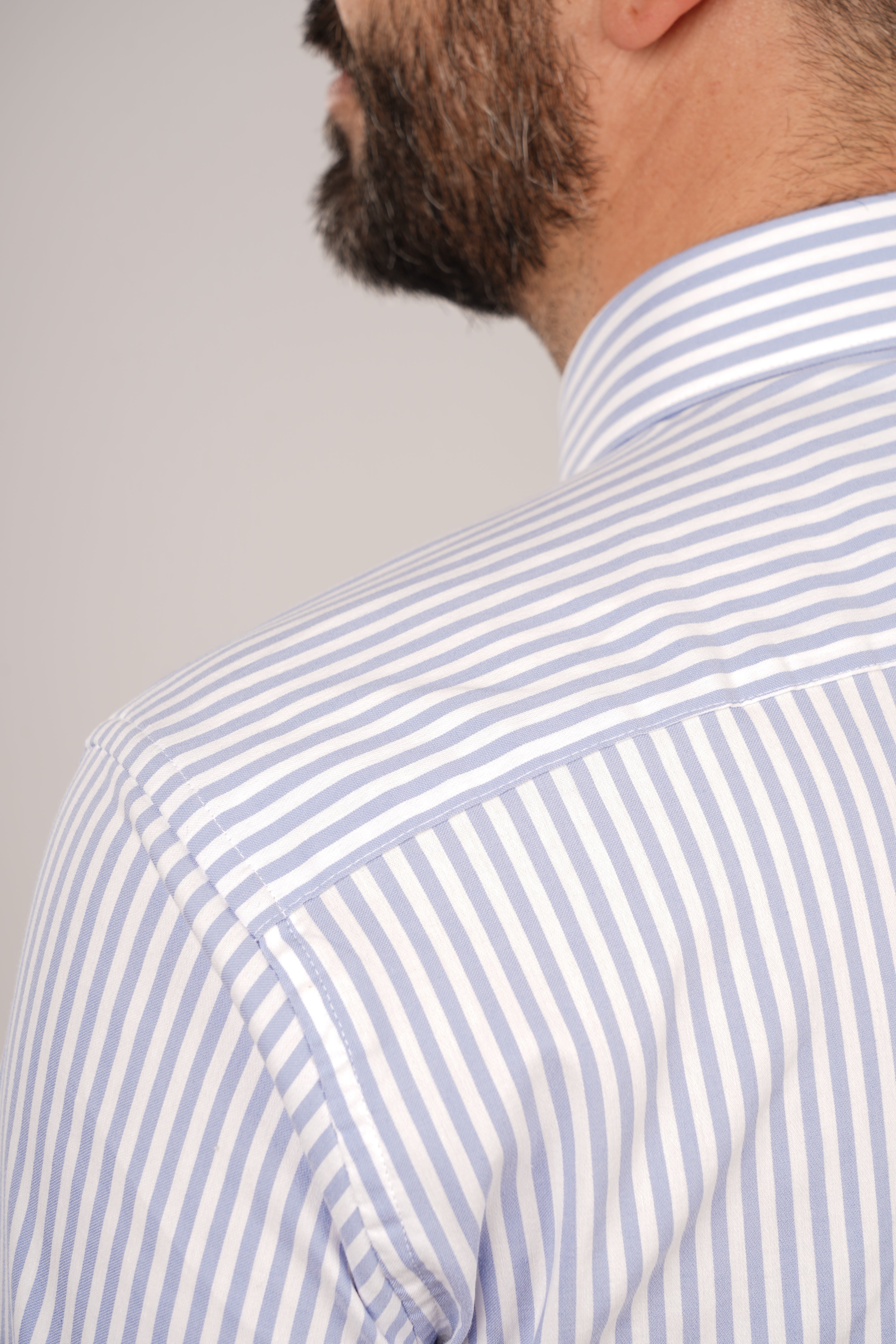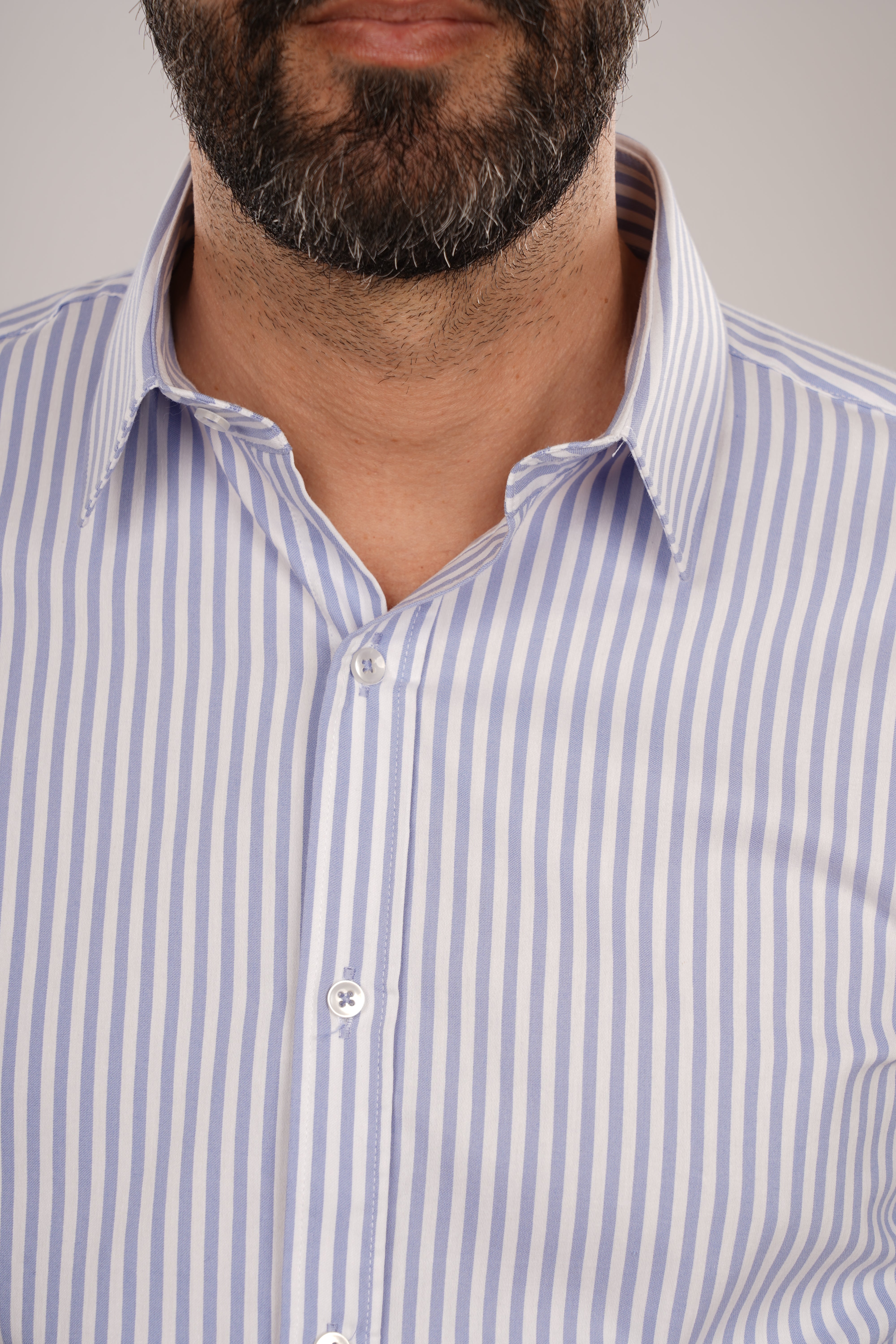 O cămașă elegantă pentru bărbați, cu un design clasic în dungi verticale alb-albastru, ideală pentru ținute business sau smart-casual. Aspectul curat, gulerul bine definit și croiala precisă subliniază un stil premium, potrivit atât pentru birou, cât și pentru evenimente cu dress-code relaxat, dar rafinat.