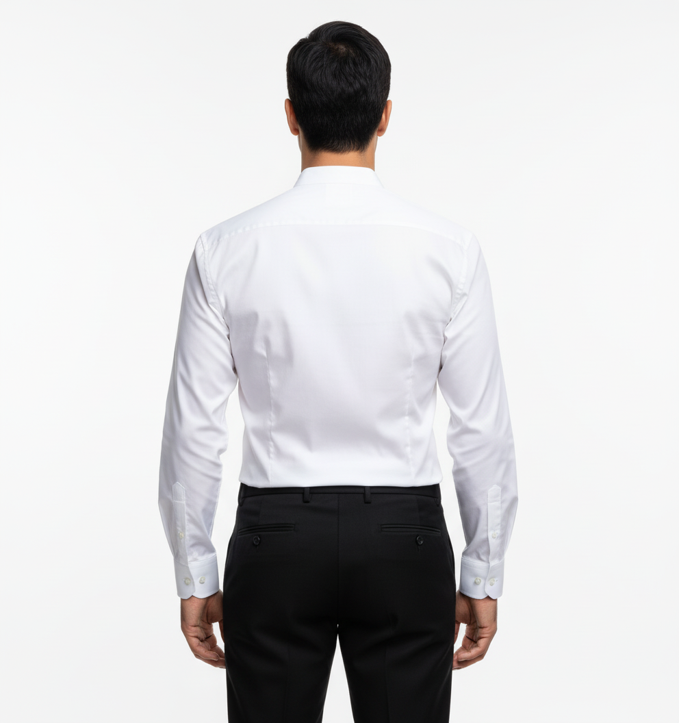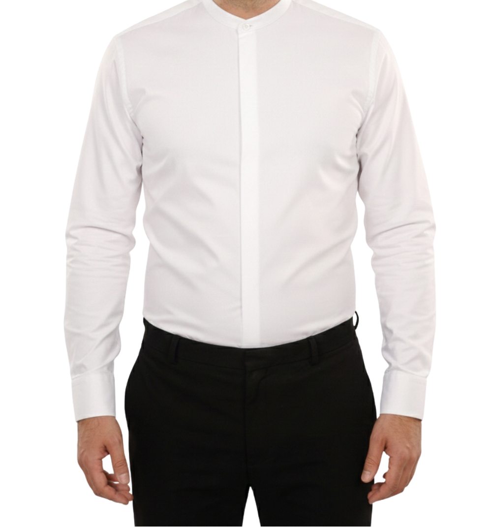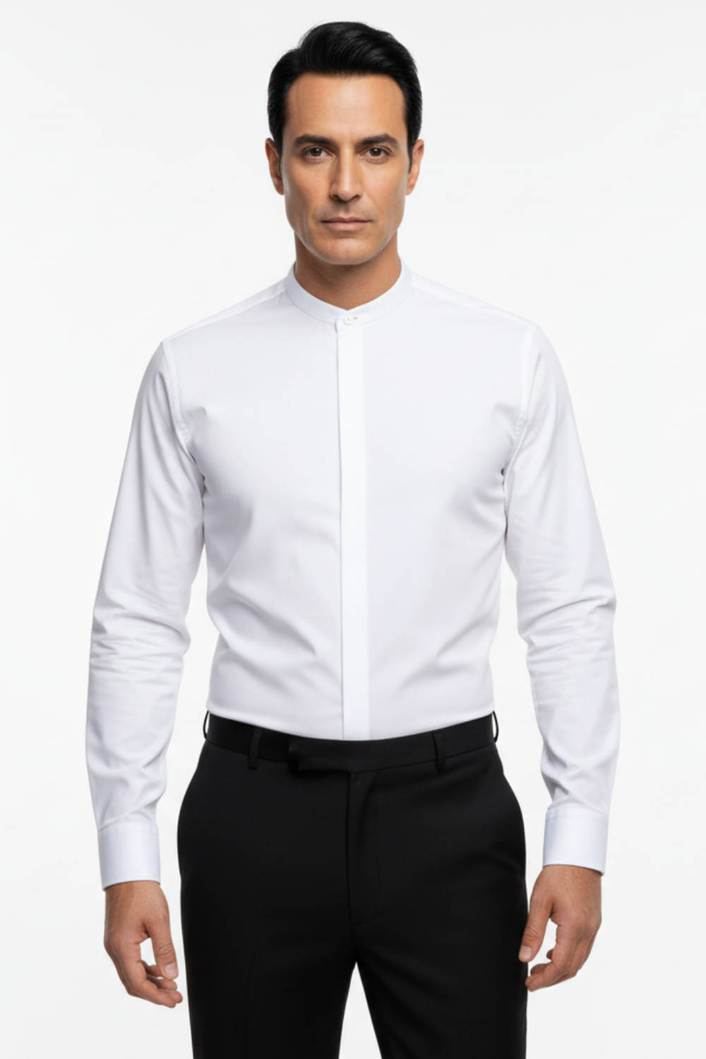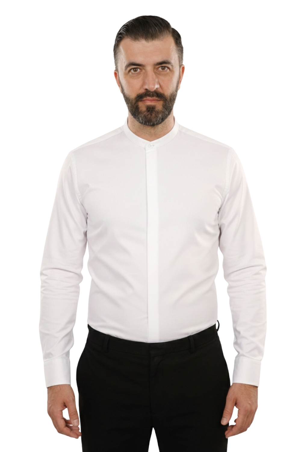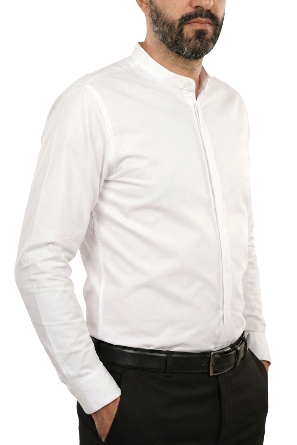 O cămașă elegantă pentru bărbați, definită de un guler tunică modern și un design alb impecabil. Aspectul minimalist și liniile curate îi conferă un aer contemporan, potrivit pentru ținute rafinate, evenimente casual-elegante sau apariții business unde se dorește un stil diferit de cămașa clasică.