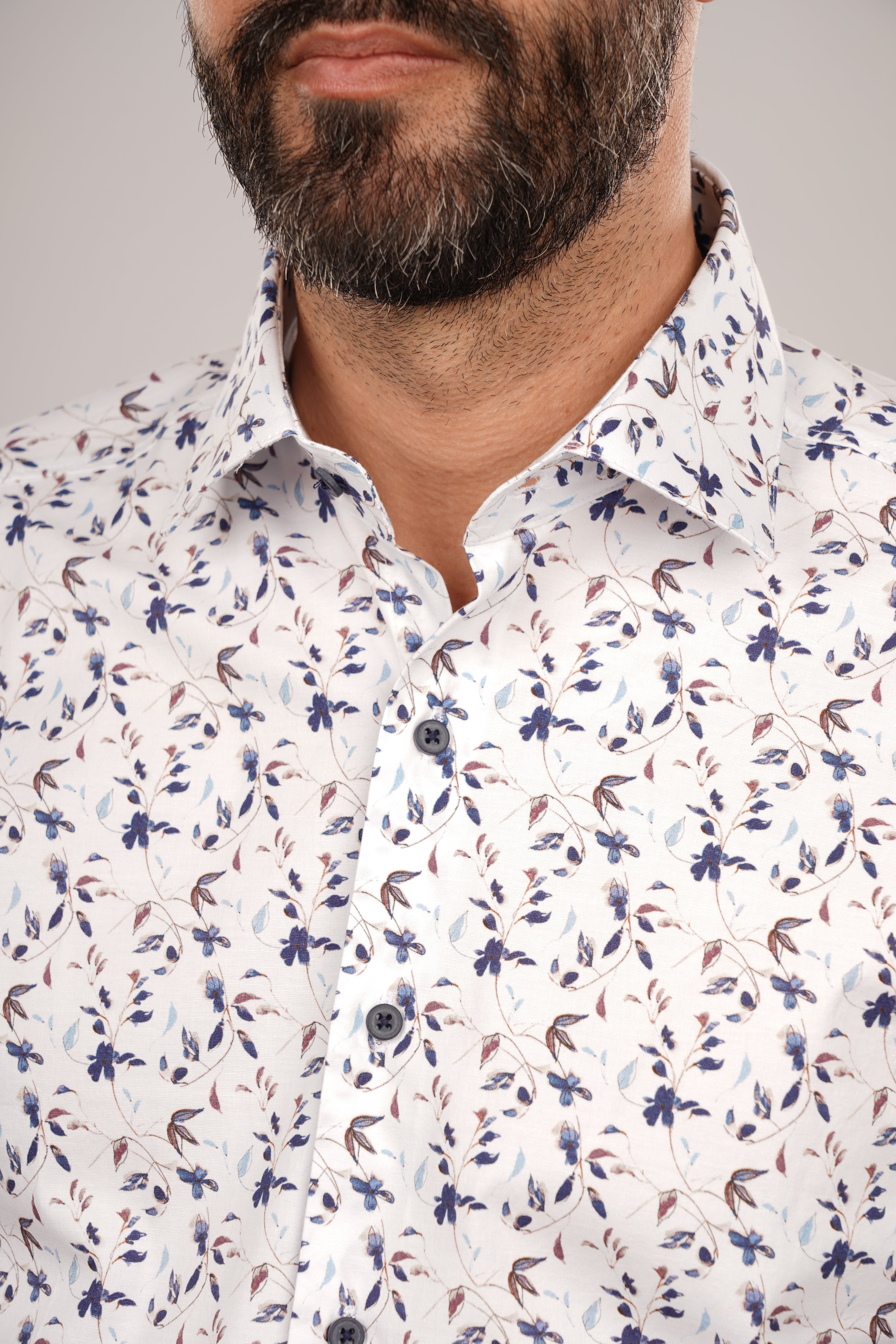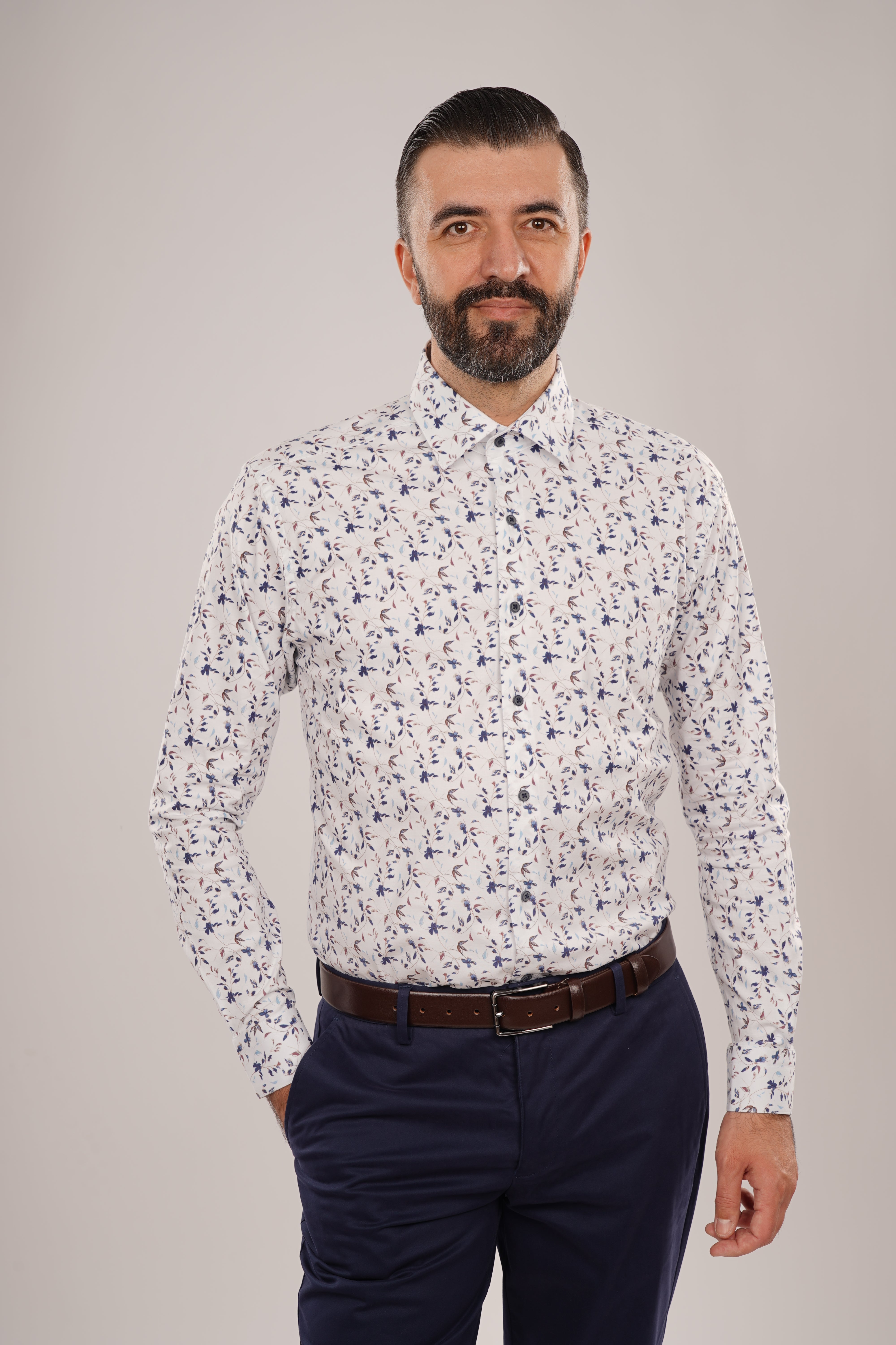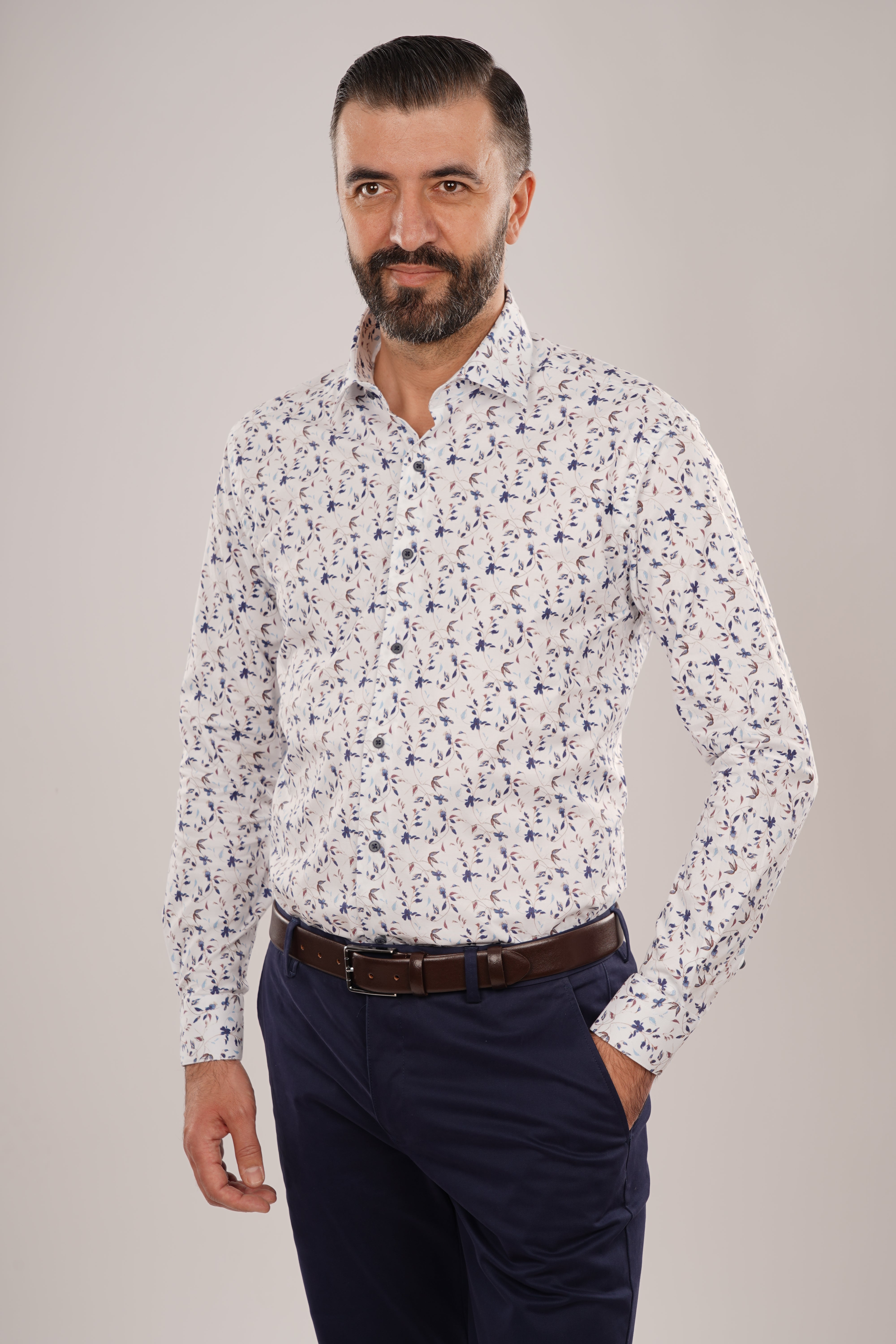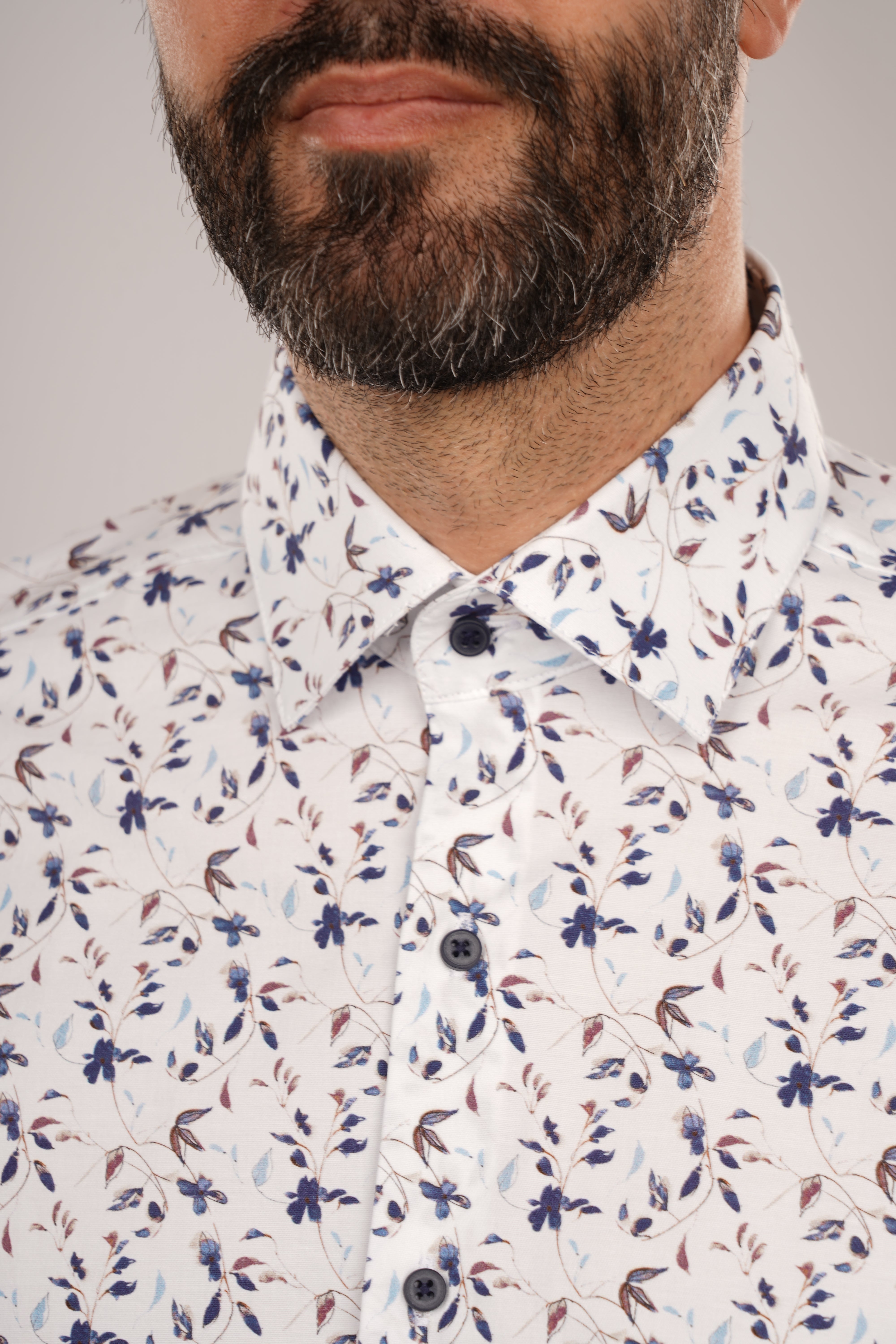 O cămașă elegantă pentru bărbați, definită de un imprimeu rafinat cu frunze și detalii florale în tonuri de albastru și maro, așezate pe o bază albă curată. Designul modern și echilibrul cromatic oferă o apariție premium, potrivită atât pentru ținute business, cât și pentru look-uri smart-casual.