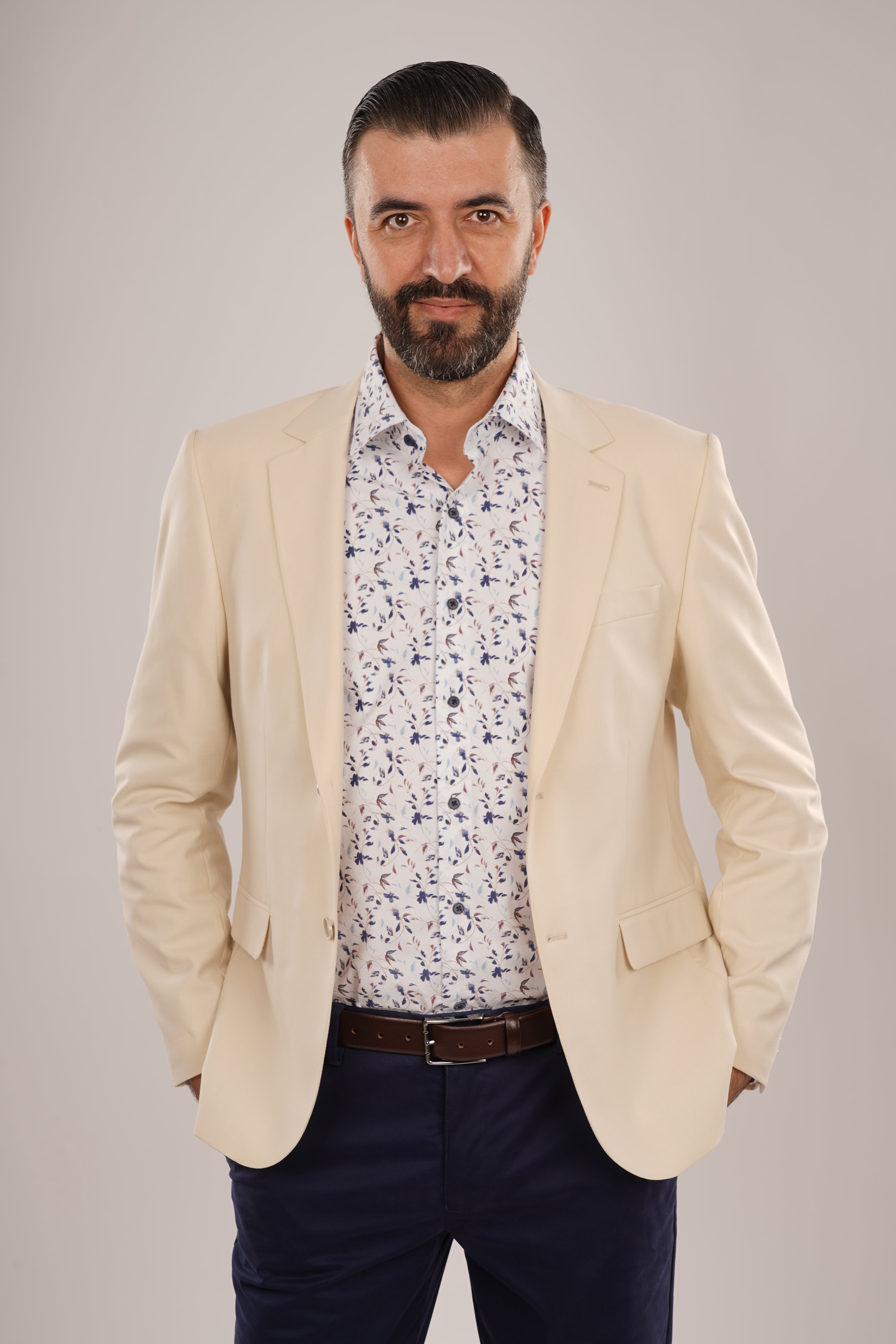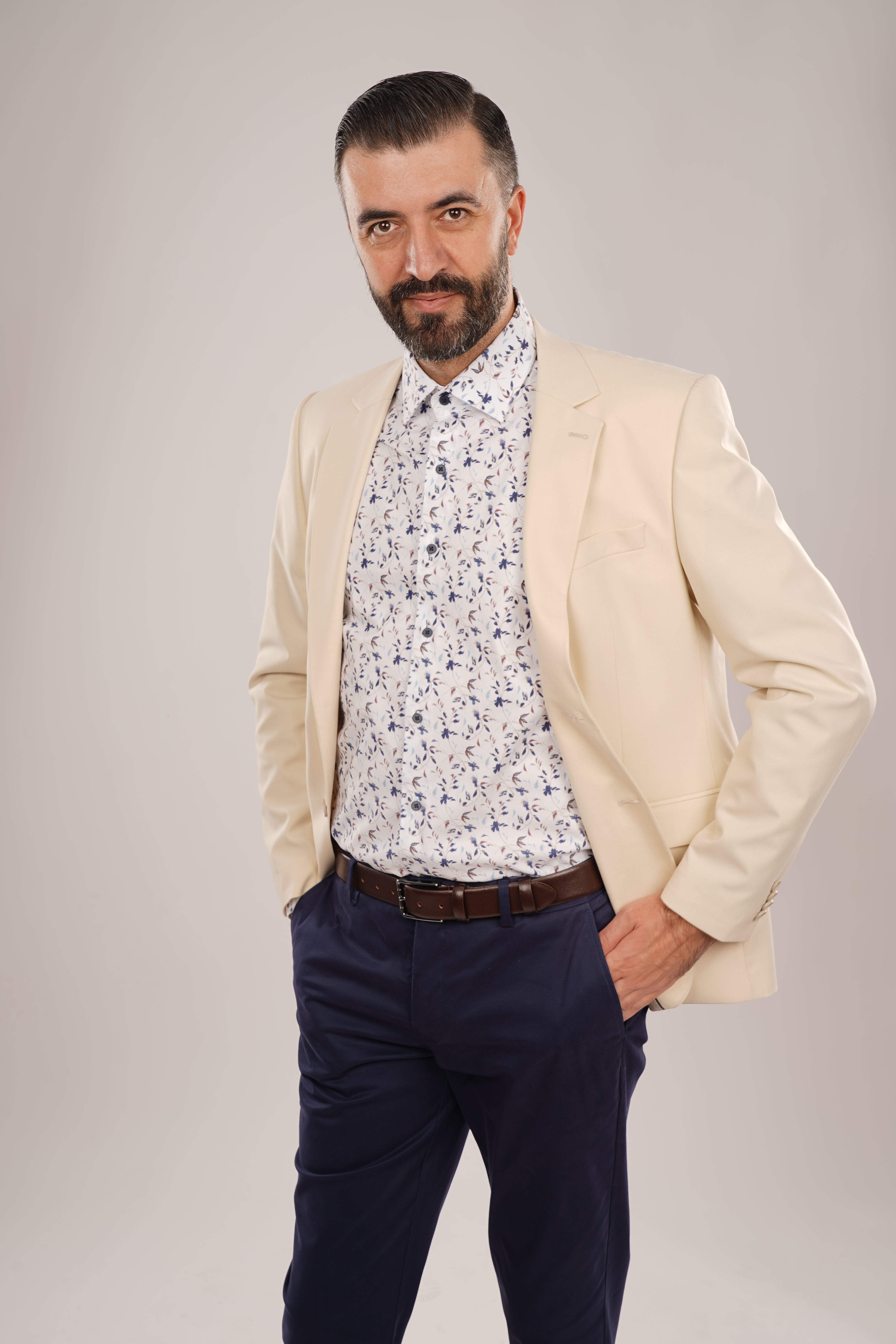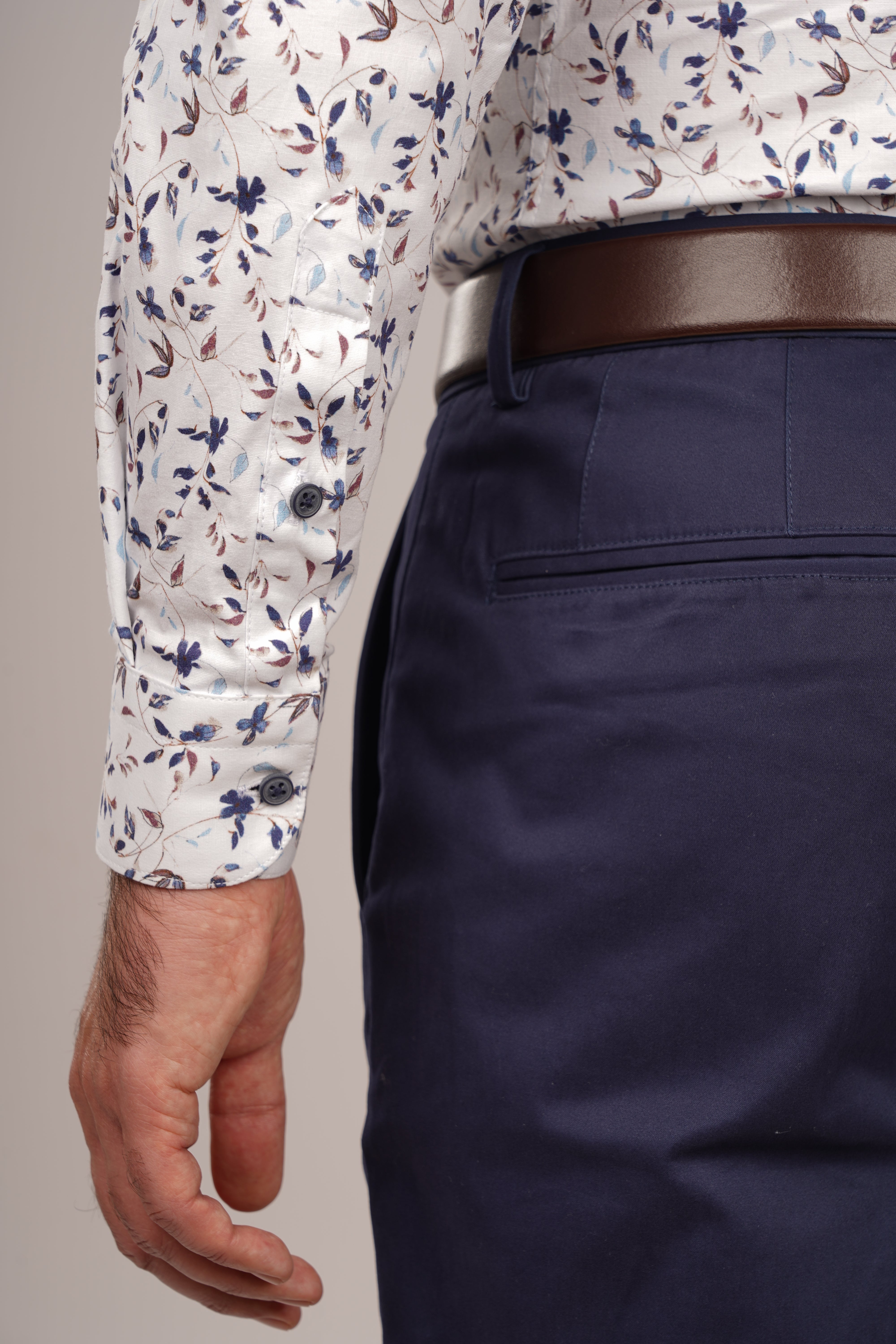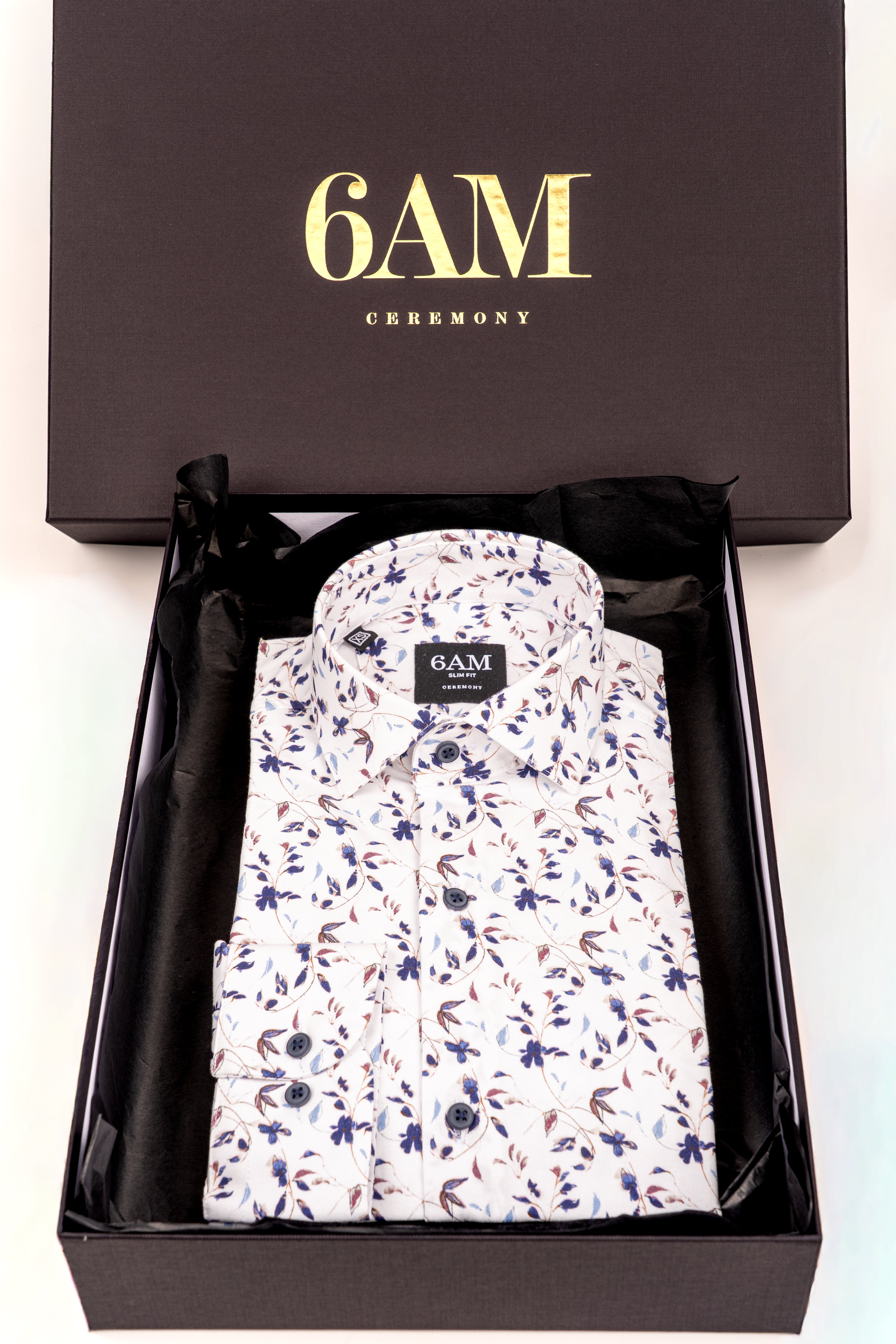 O cămașă elegantă pentru bărbați, definită de un imprimeu rafinat cu frunze și detalii florale în tonuri de albastru și maro, așezate pe o bază albă curată. Designul modern și echilibrul cromatic oferă o apariție premium, potrivită atât pentru ținute business, cât și pentru look-uri smart-casual.