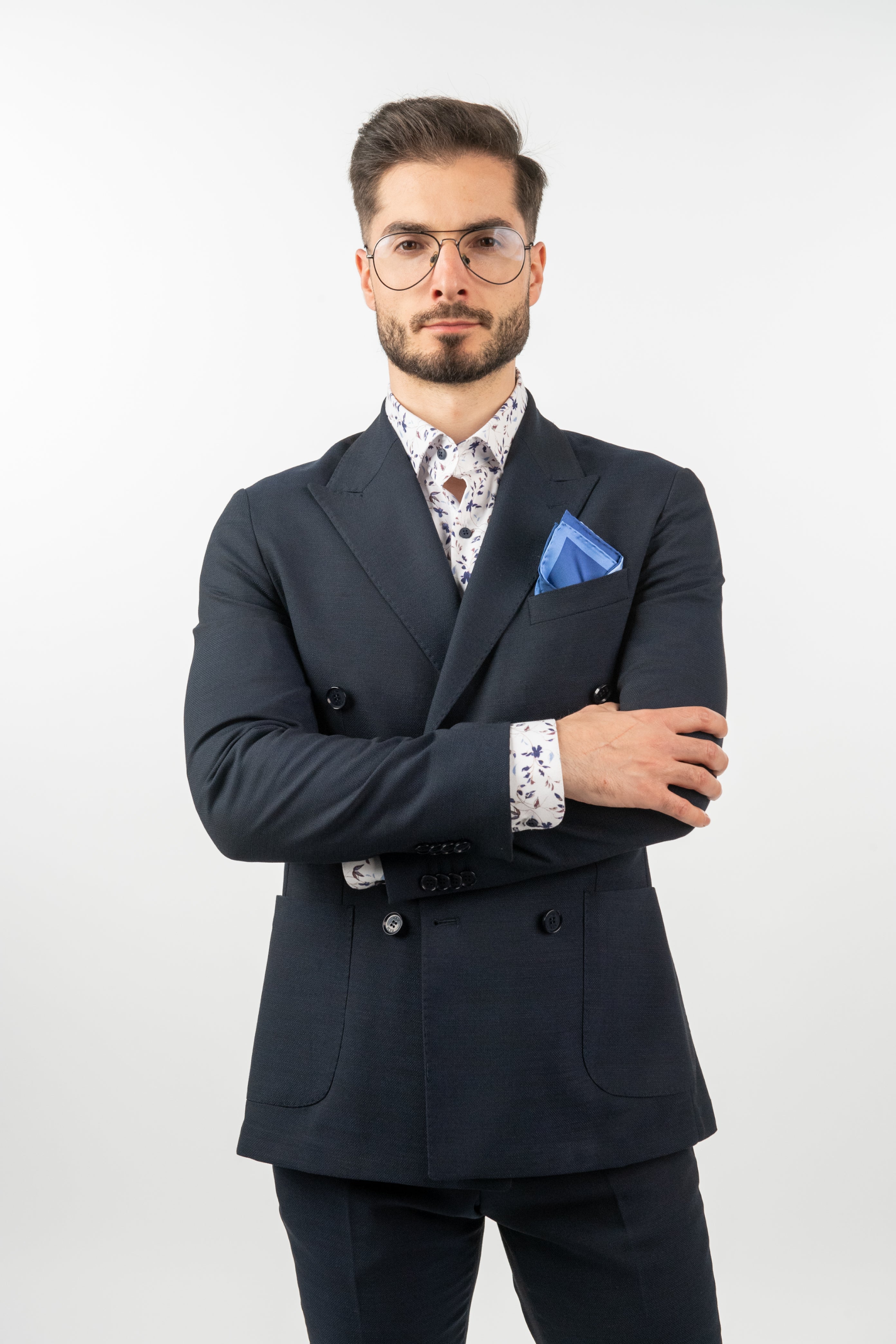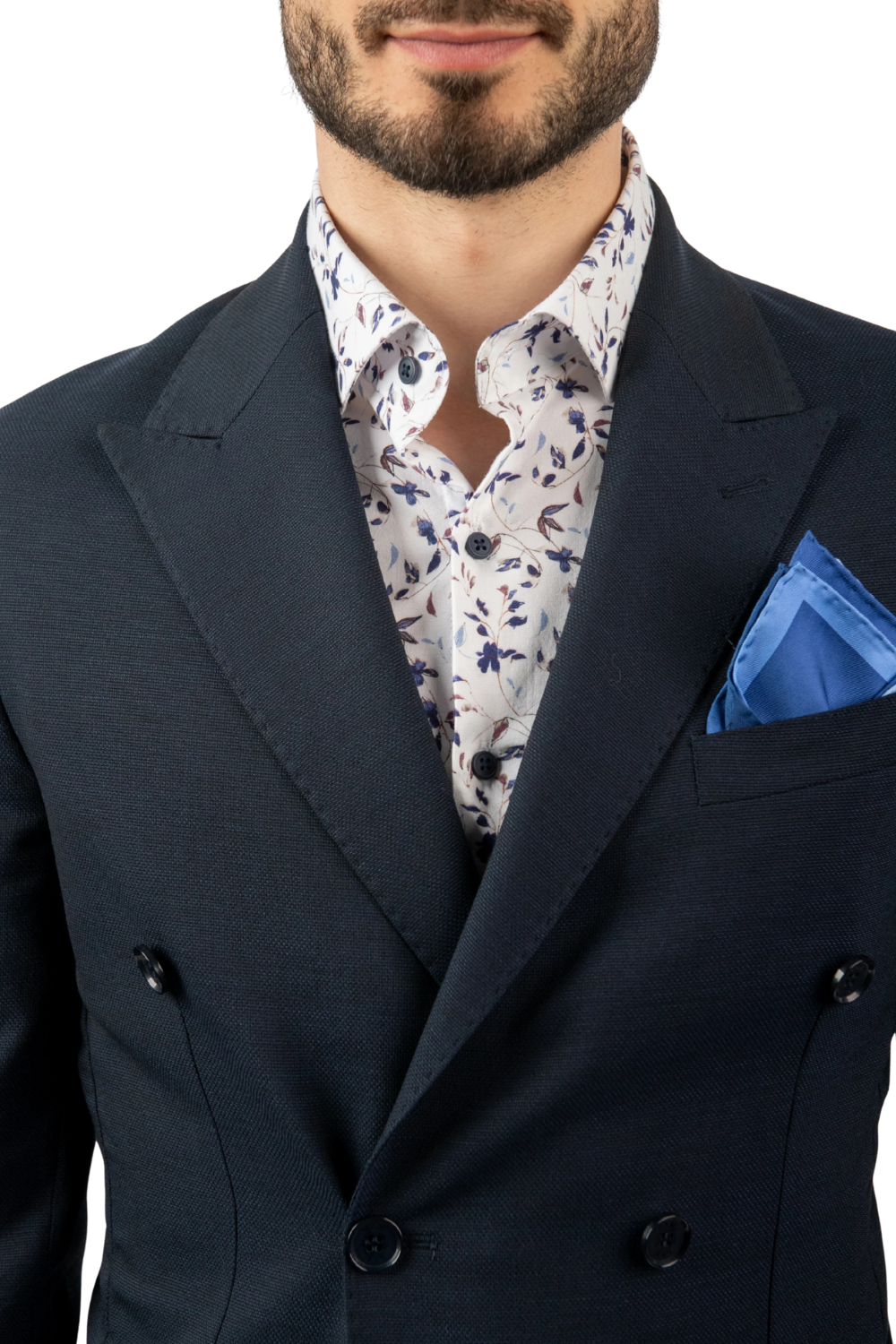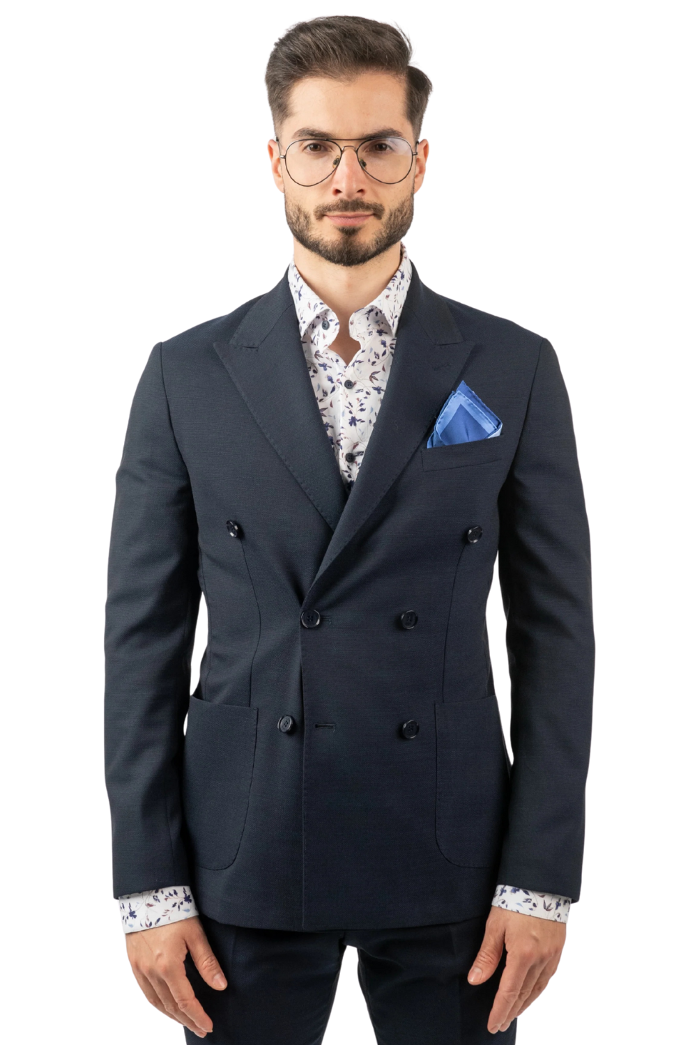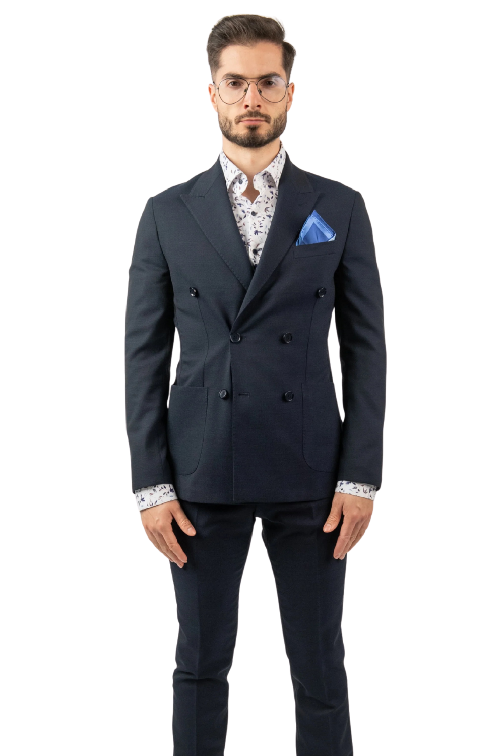 Costum elegant pentru bărbați, în nuanță bleumarin texturată, compus din sacou la două rânduri de nasturi cu două șlițuri la spate și pantaloni asortați. Croiala rafinată și designul clasic oferă o apariție impecabilă și echilibrată.