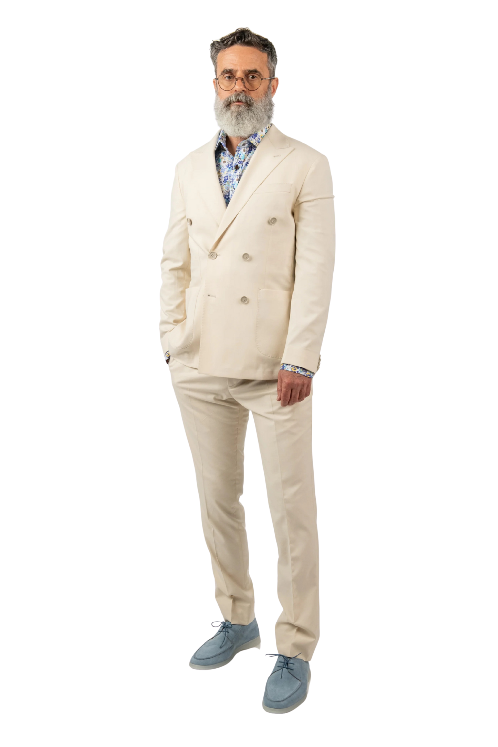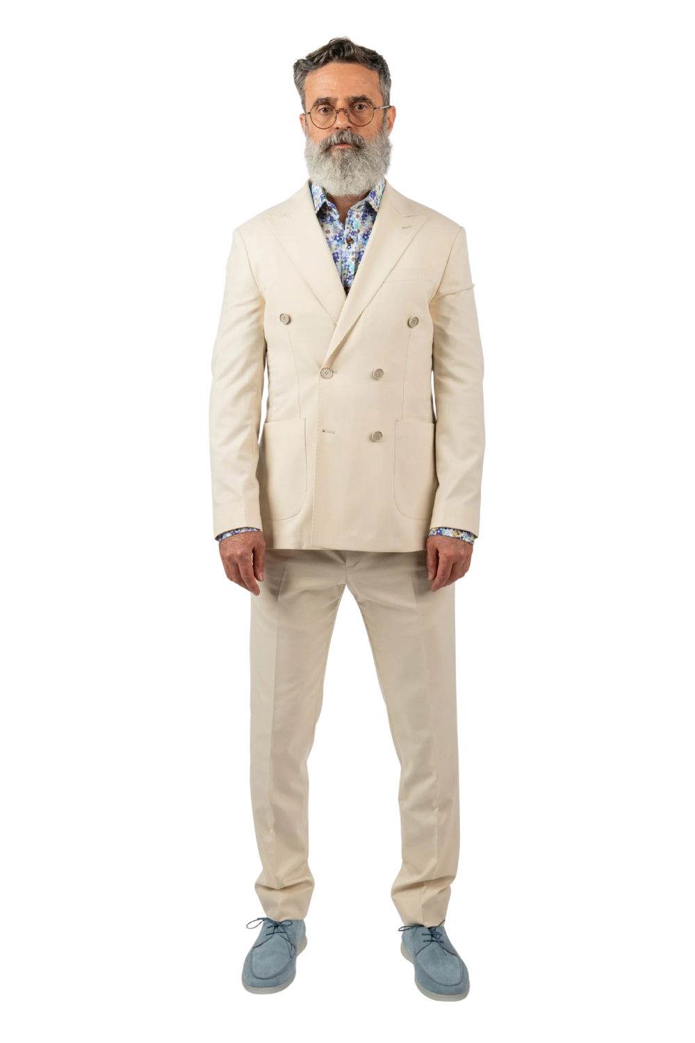 Costum elegant pentru bărbați, în nuanță crem, realizat într-un stil sport rafinat. Setul este format din sacou la două rânduri de nasturi, cu două șlițuri la spate, și pantaloni asortați, oferind o apariție modernă și echilibrată.