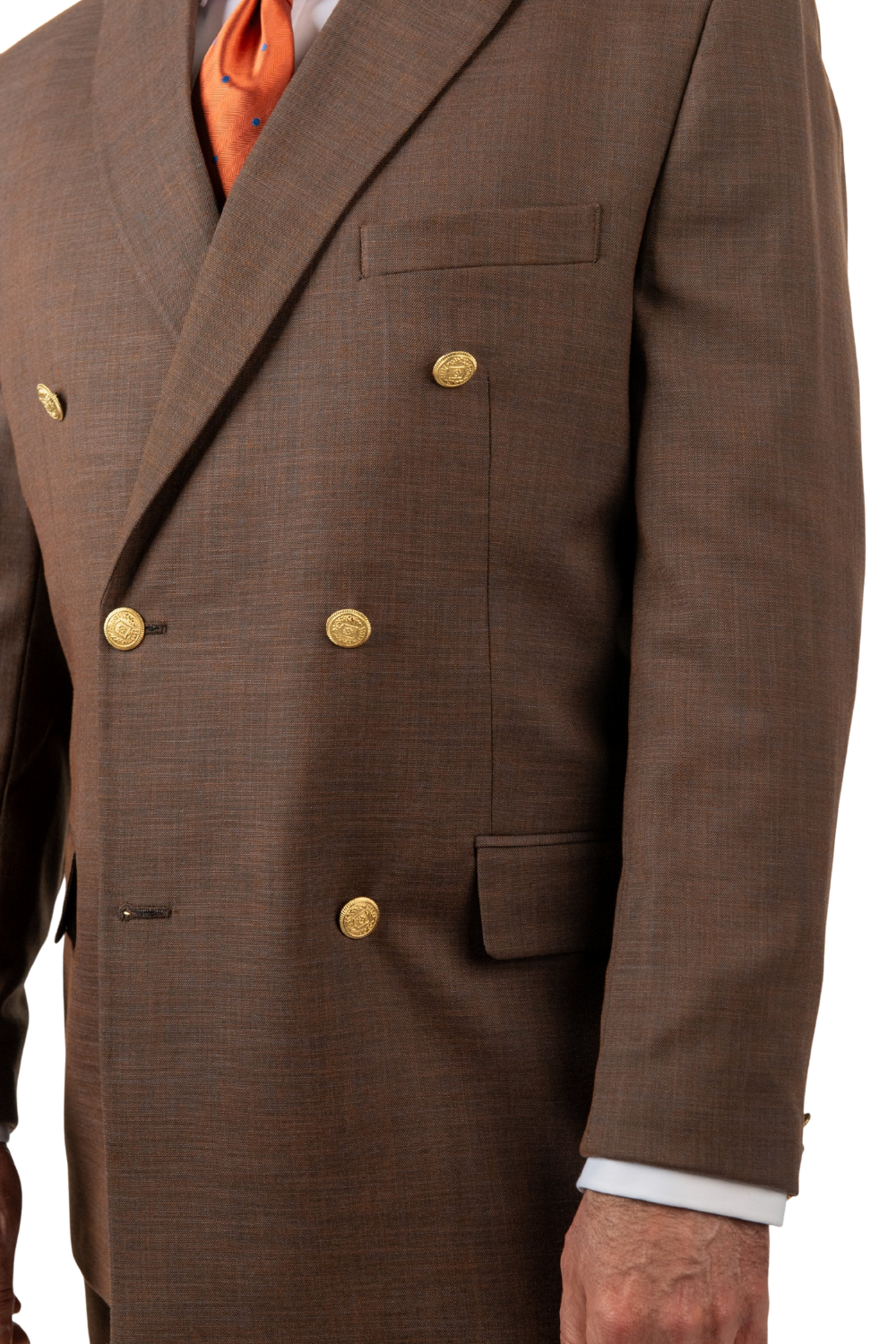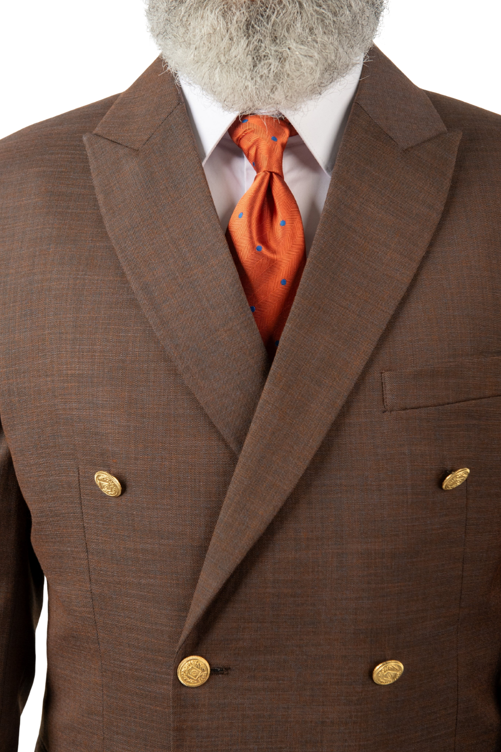 Costum elegant pentru bărbați, cu sacou la două rânduri de nasturi și rever clasic, completat de două șlițuri la spate. Culoarea maro oferă o apariție rafinată și versatilă.