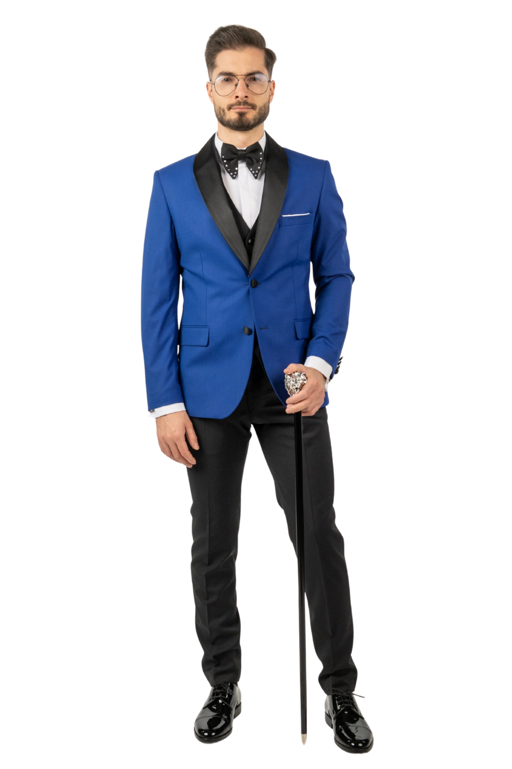 Costum elegant de ceremonie pentru bărbați, în nuanță albastră, alcătuit din sacou la un rând de nasturi cu rever detașabil negru, vestă și pantaloni asortați. Designul distinct și croiala echilibrată oferă un aspect rafinat și modern.
