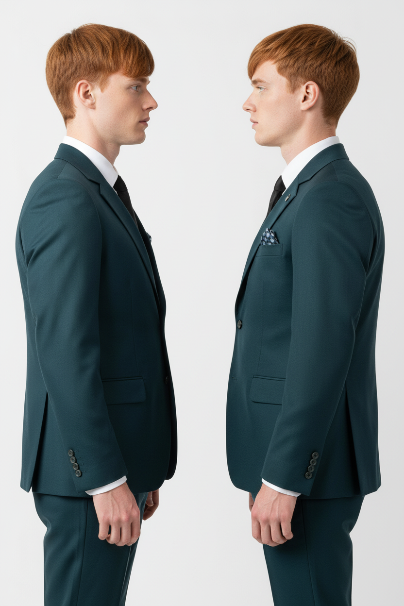 Costum clasic pentru bărbați, într-o nuanță turquoise rafinată, alcătuit din sacou la un rând de nasturi cu două șlițuri la spate, vestă și pantaloni asortați. Designul elegant și croiala echilibrată oferă un aspect distinct și sofisticat.