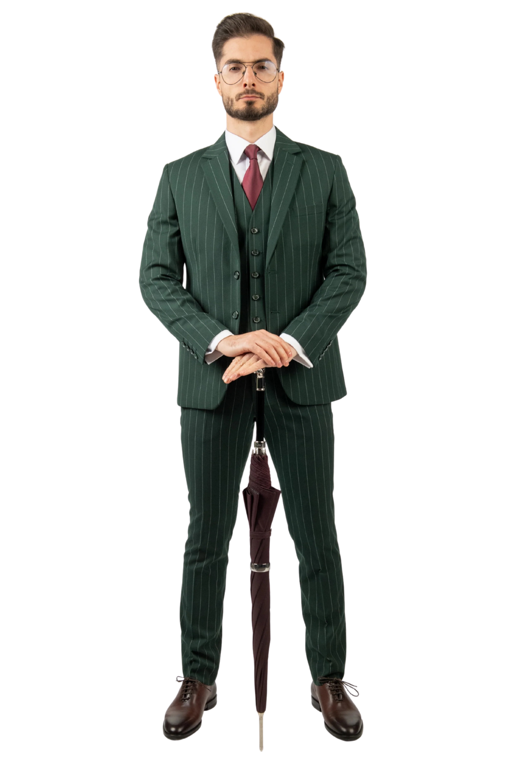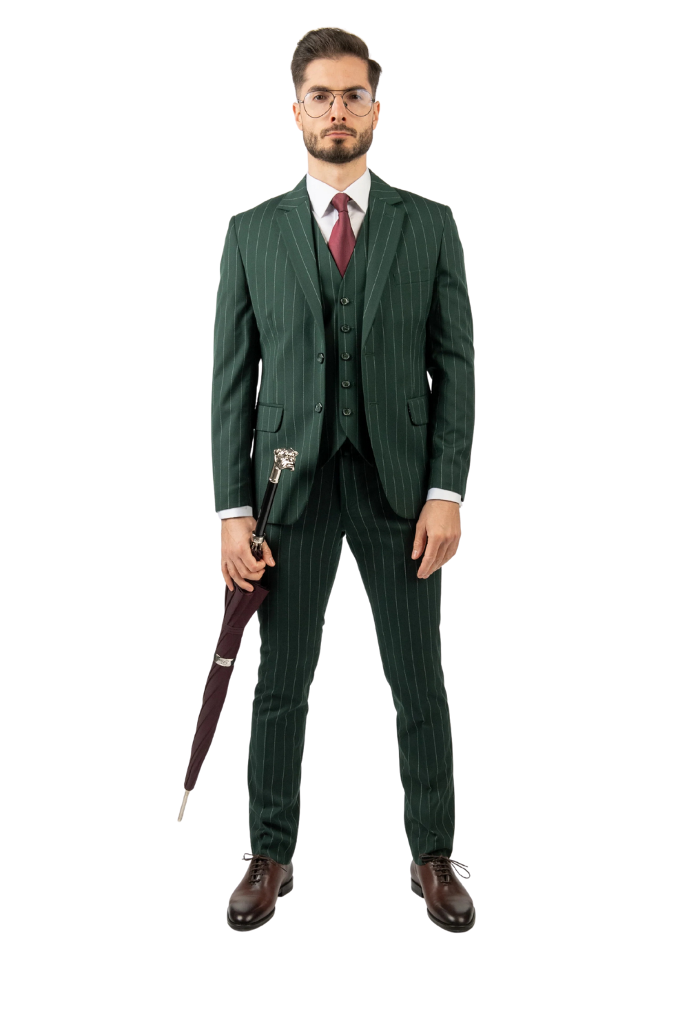 Costum bărbați verde cu dungi din lână în trei piese